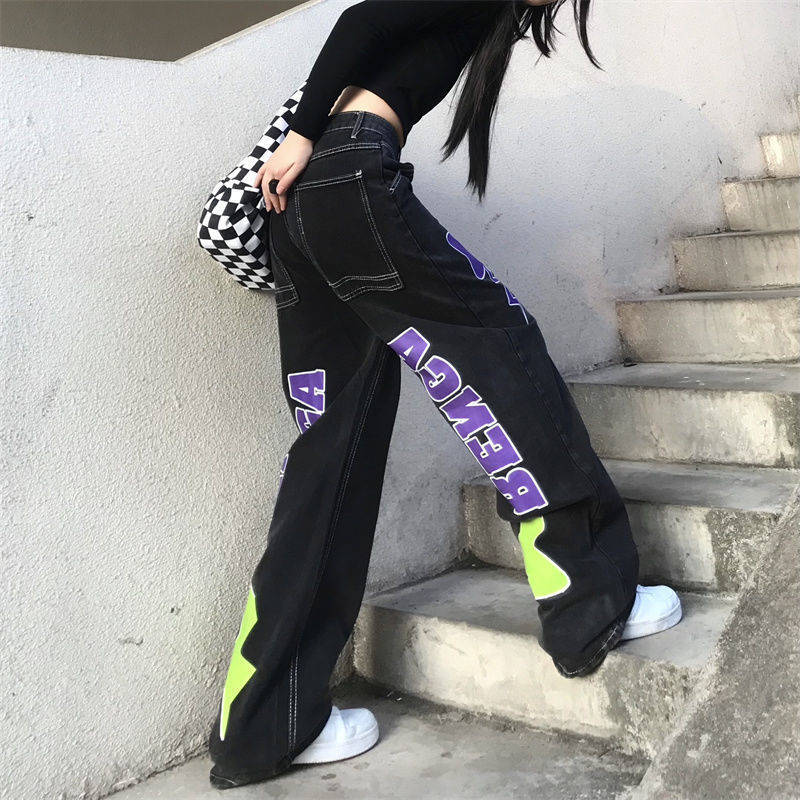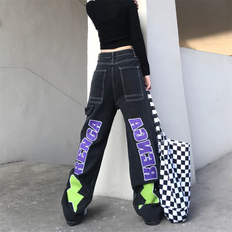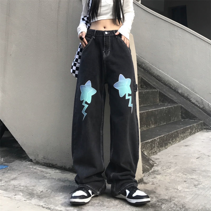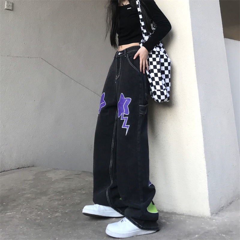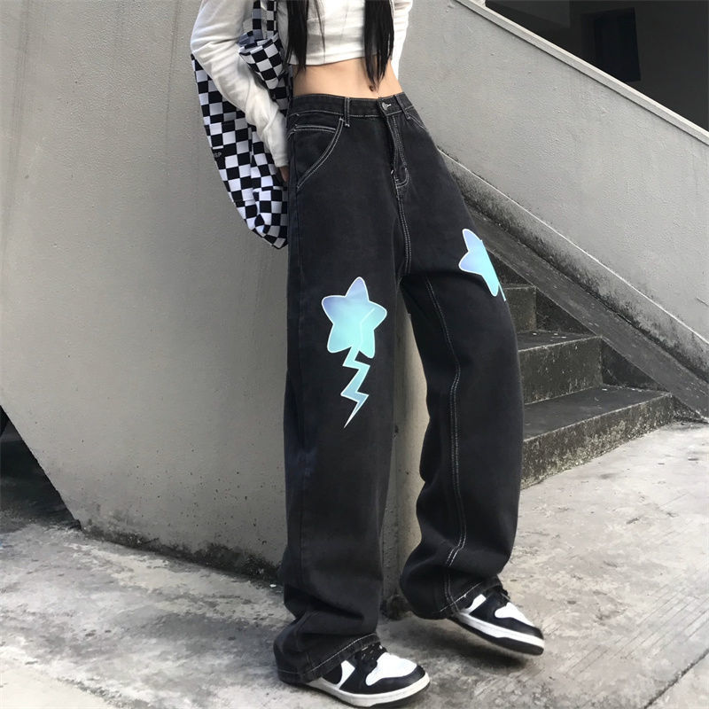 Letter Star Loose High Waist Straight Wide Leg Long Pants