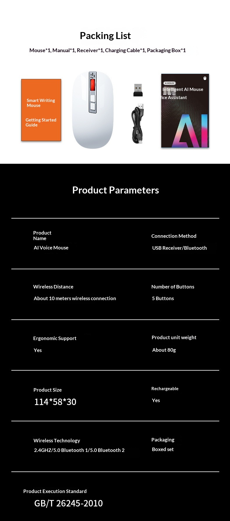 Package Contents: 1 mouse, 1 receiver, 1 user manual, 1 charging cable