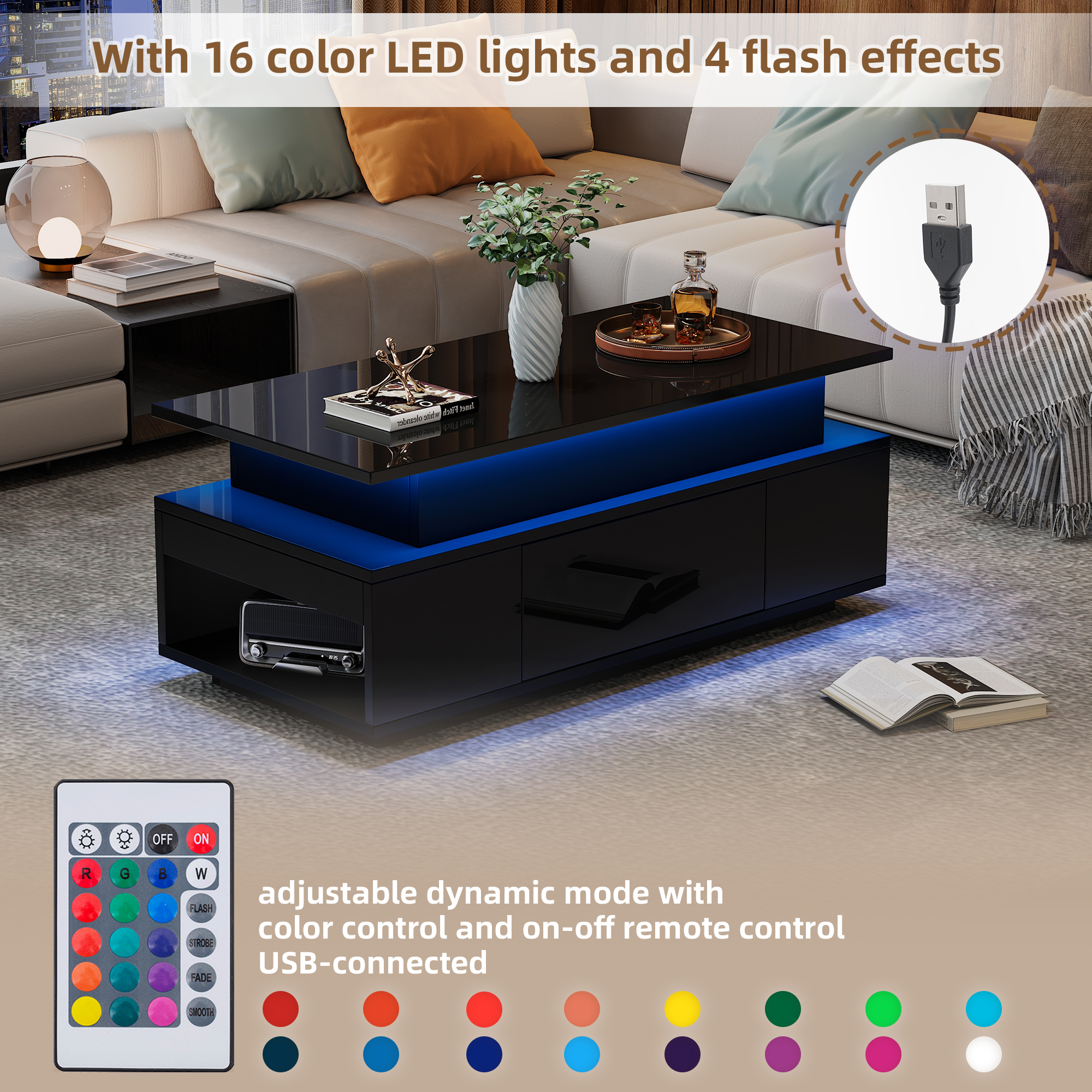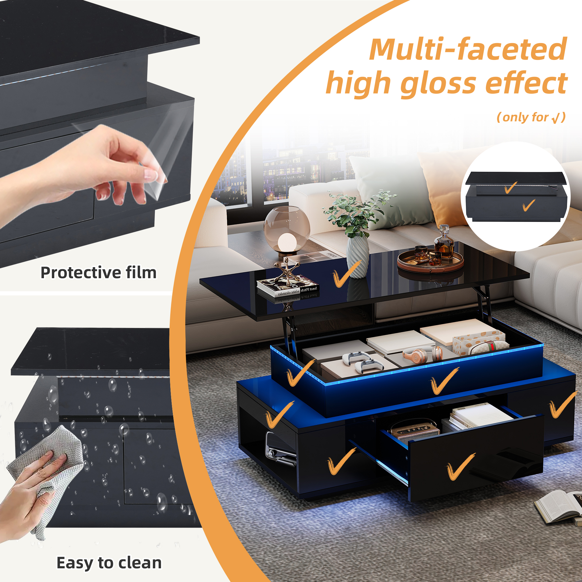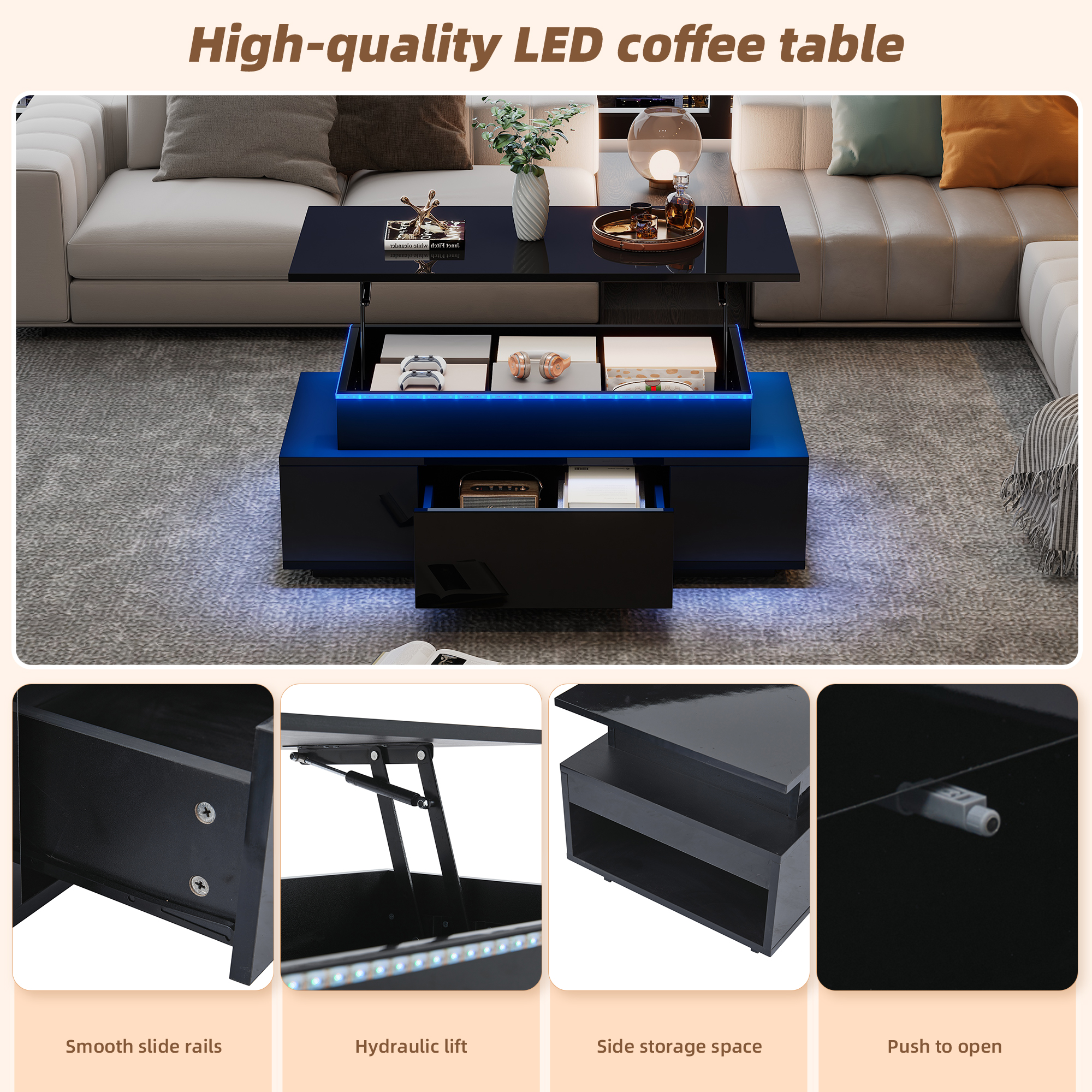 Product Name:Lift-Top Coffee Table, Highgloss Centre Table with 1 drawers & LED lights, Hidden storage space, Lifting Sofa Side Table, Space-saving End Table,Tea Table,for livingroom, office, 96*45*40m, black
