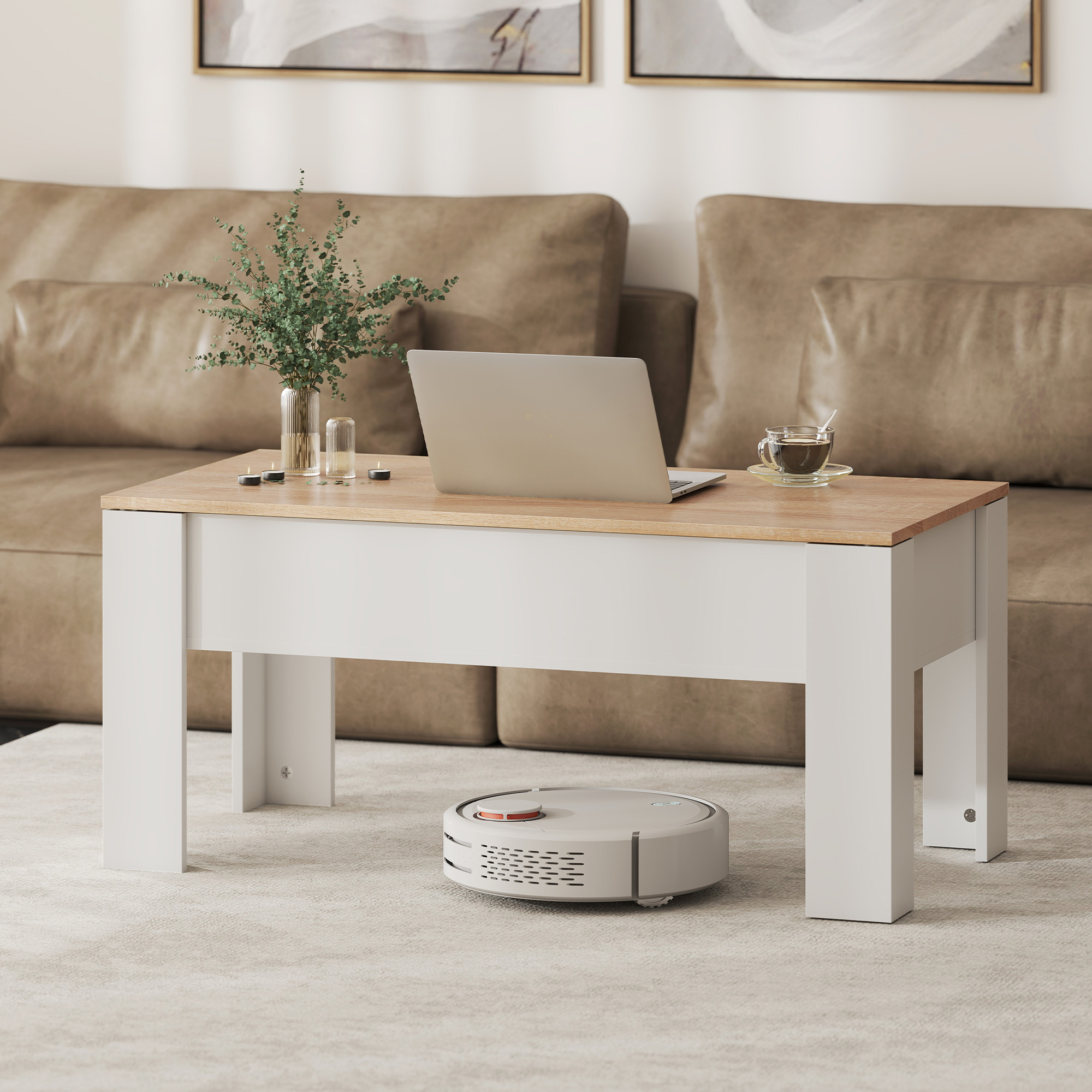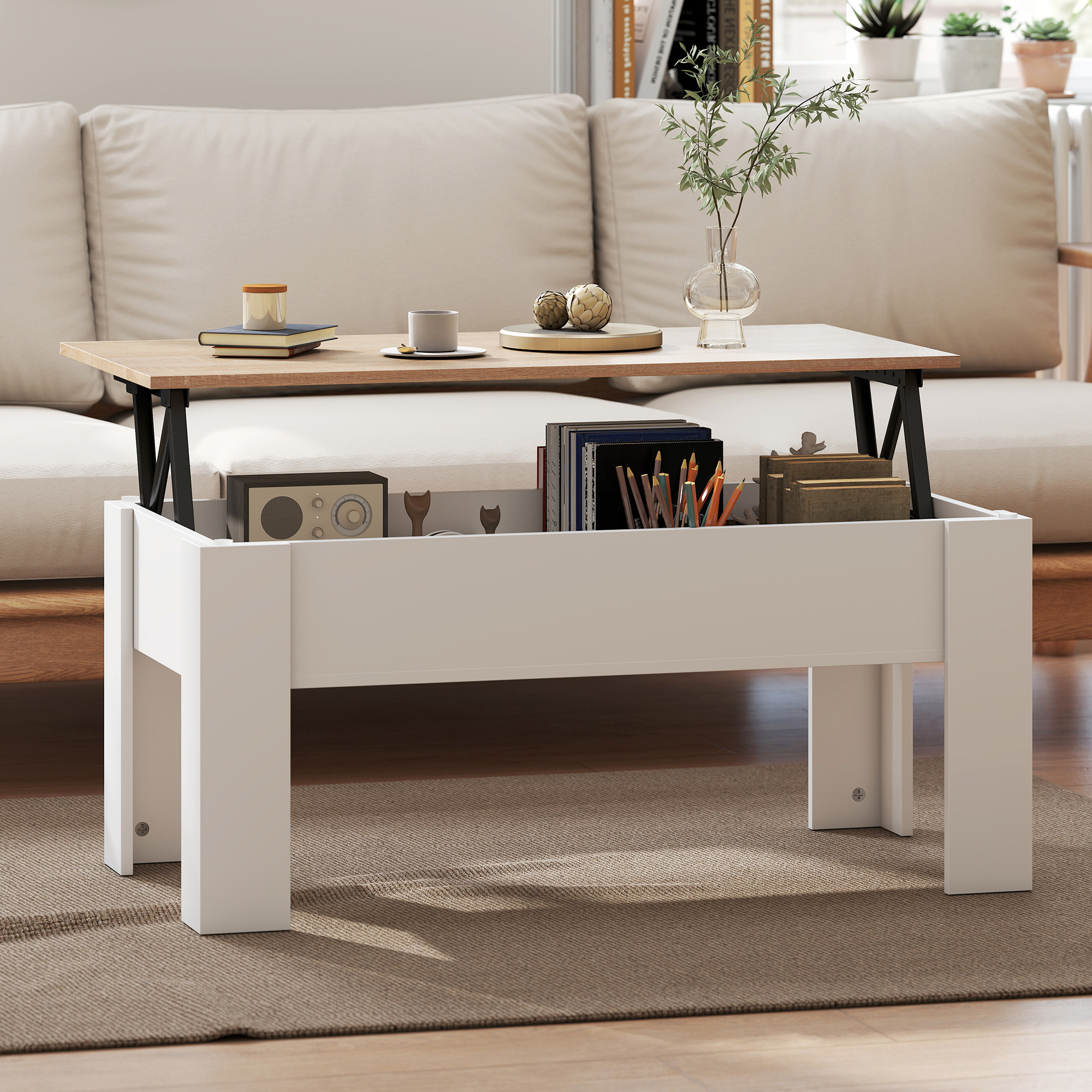 Add a chic, modern style and function to your living room or office with this lift up coffee table. The extending table top lifts up and out to create a convenient floating desk, revealing a hidden storage compartment below. Built from particle board, this living room table is built to withstand long term use. Stylish and functional, this pop up coffee table is perfect in front of a couch or in a home office, helping to provide multiple work surfaces and storage options.