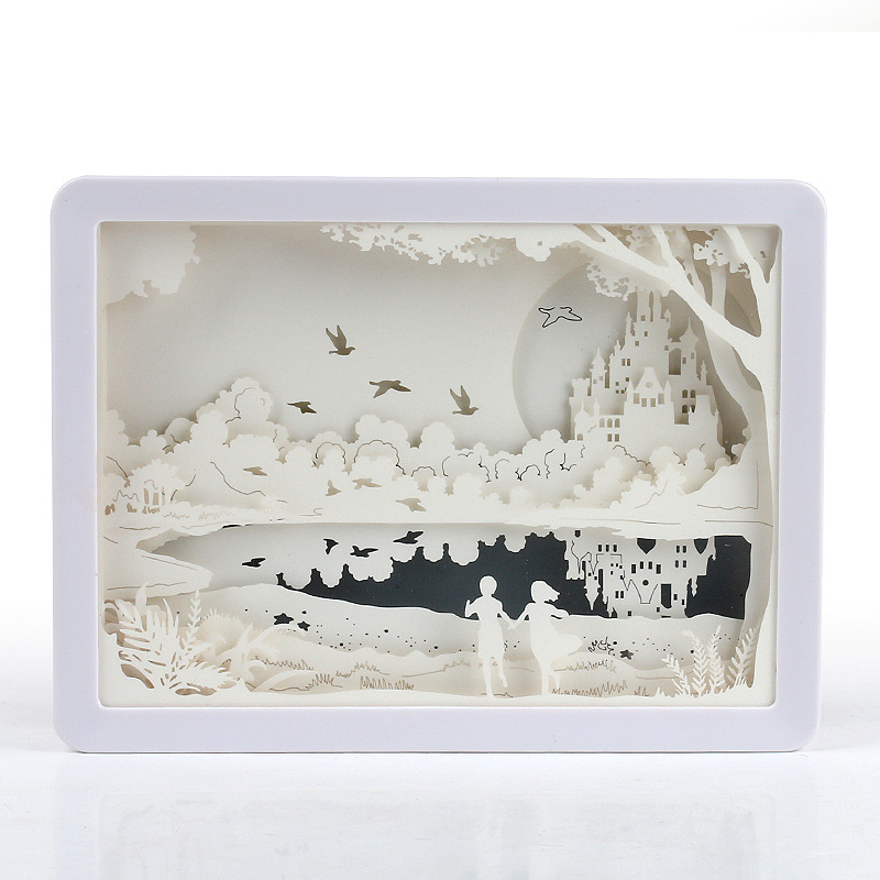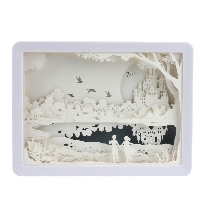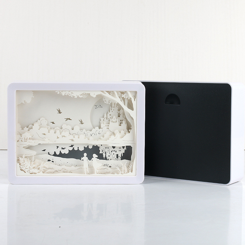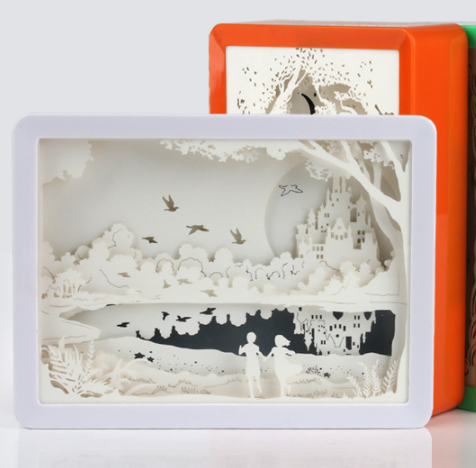 Name: 3D paper carving lampSize: 197.1x147.8x43MMMaterial: Frame ABSProcess: laser hollowPower supply: USBUse: living room, study room, bedroom