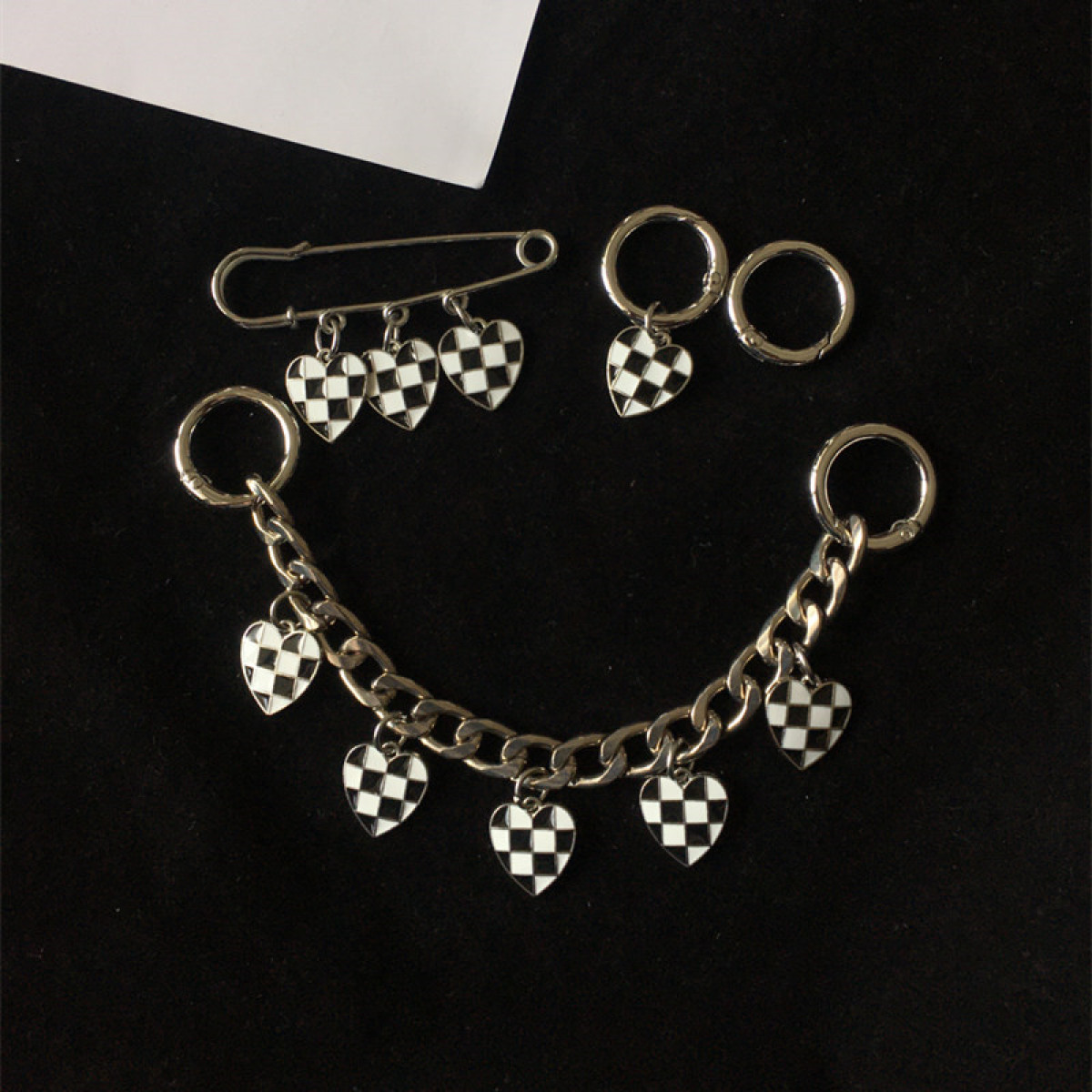 Color classification: 1 checkerboard metal chain, 1 checkerboard metal pin, 2 checkerboard metal buckles, checkerboard metal accessories