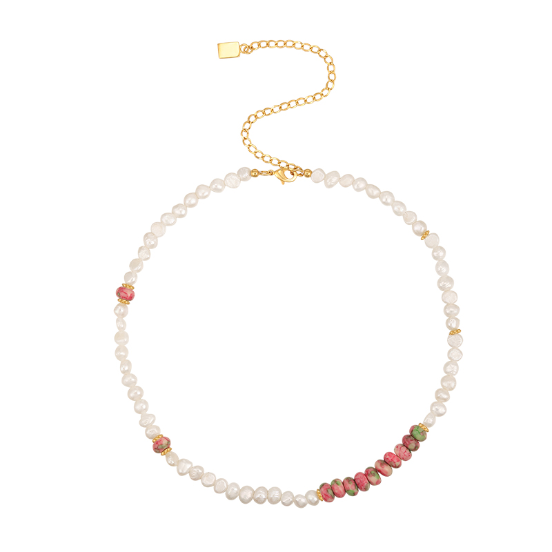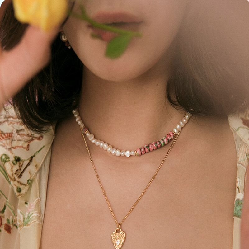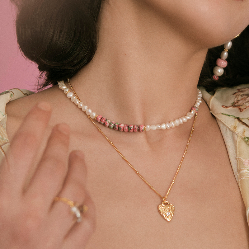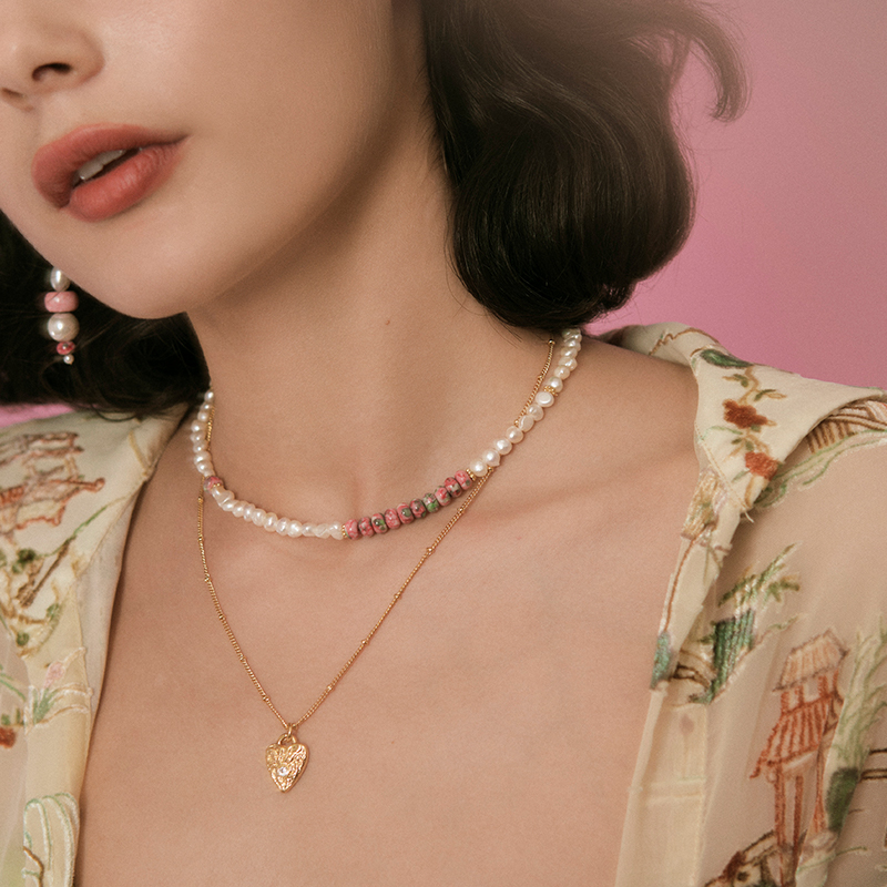 Color classification: Rain colored stone pearl necklace, retro peach heart necklace