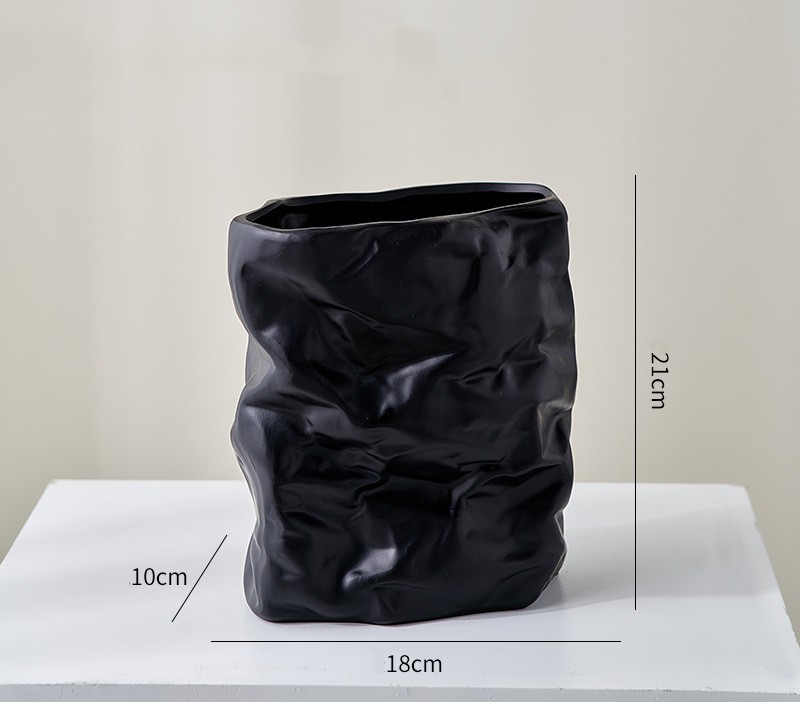 Paper Bag Pleated Ceramic Vase - Black,