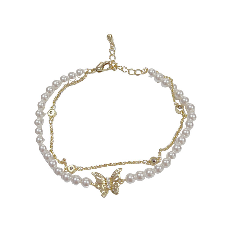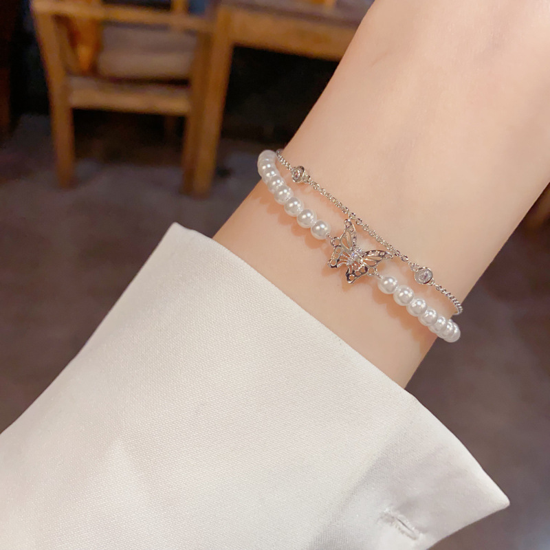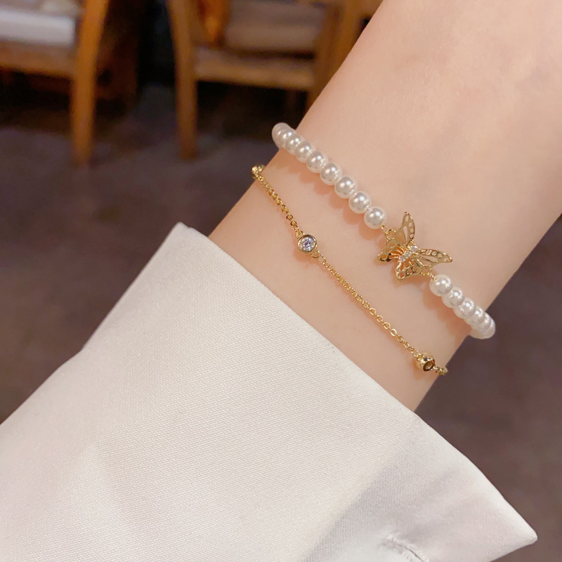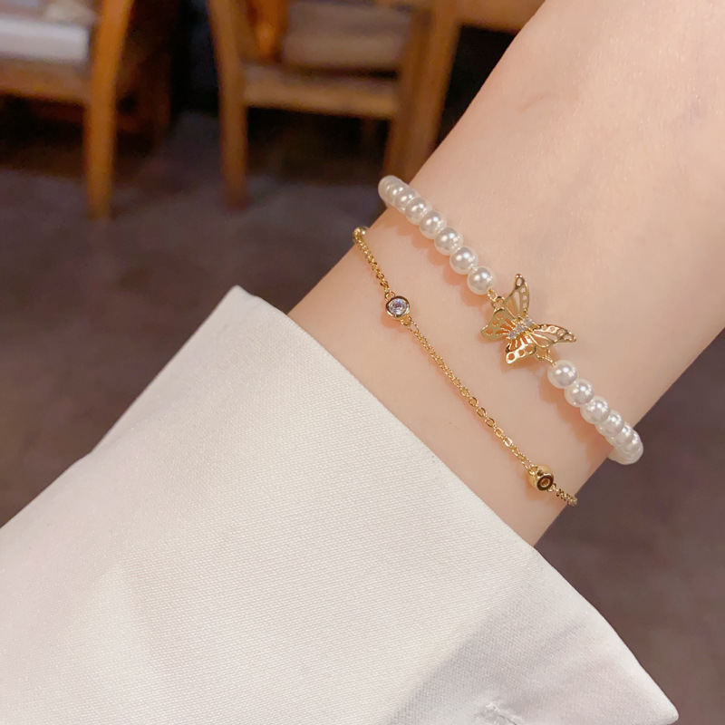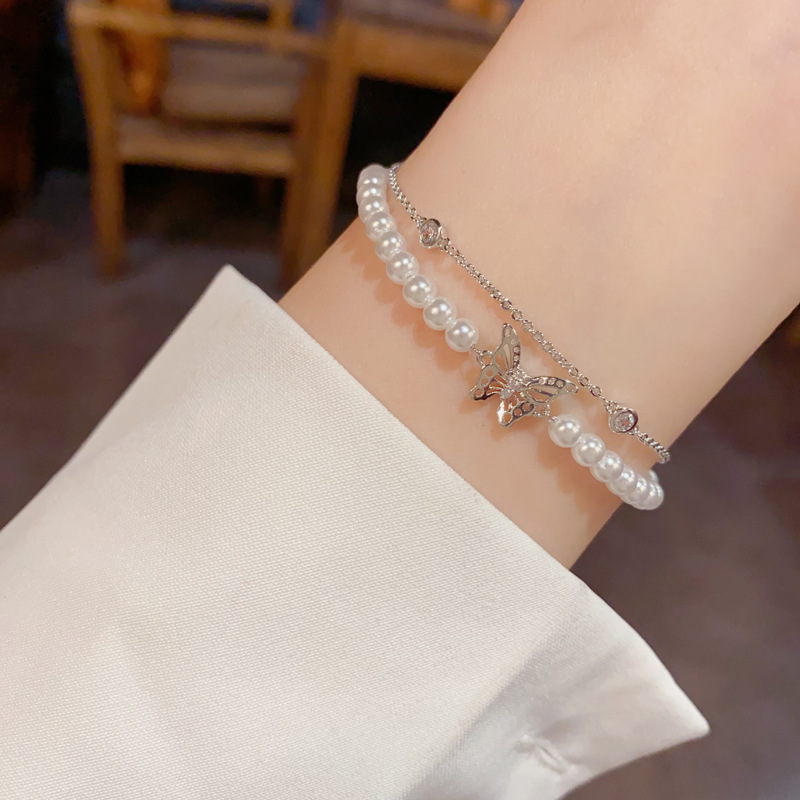 Color: Gold - Double Layer Pearl Chain Butterfly Bracelet (Thickened Real Gold Plating), Silver - Double Layer Pearl Chain Butterfly Bracelet (Thickened Real Gold Plating)