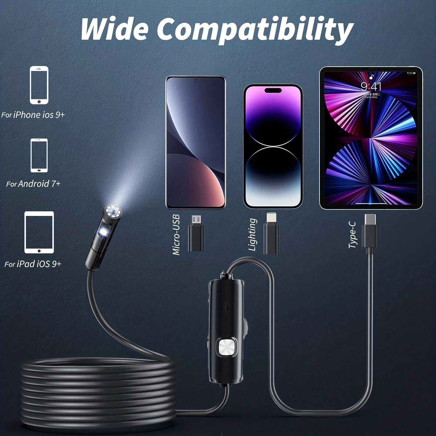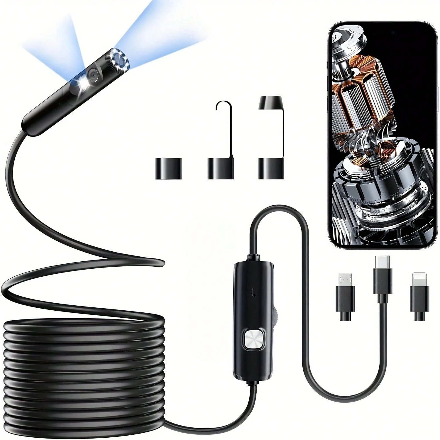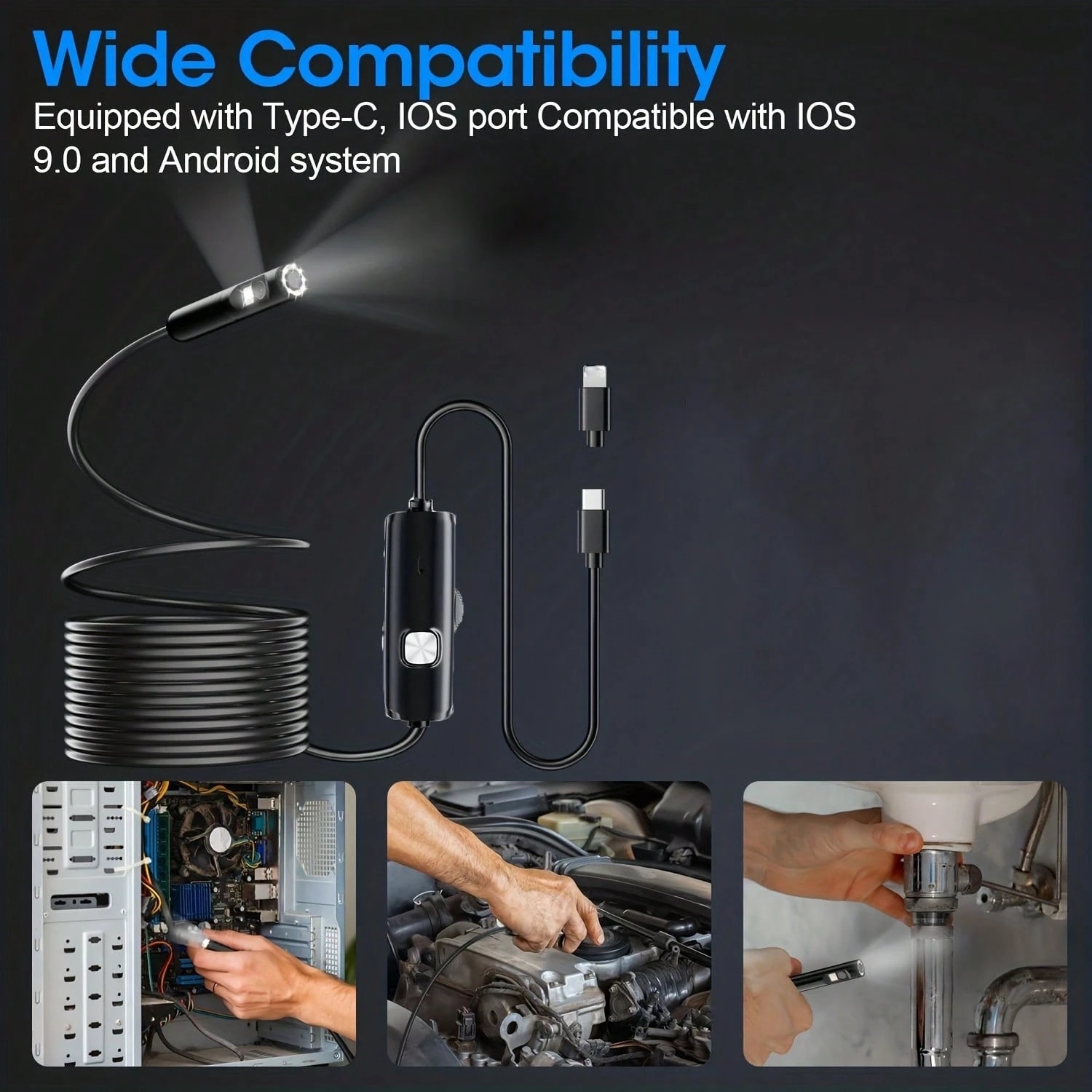 Wide Applications: This endoscope camera with light is your first choice tool in a variety of scenarios. Whether it's in the car or around the engine, internal inspection of pipes, or house inspection for mold and wiring, it's up to the task. Its adjustable brightness feature ensures you can capture clear images even in low-light environments