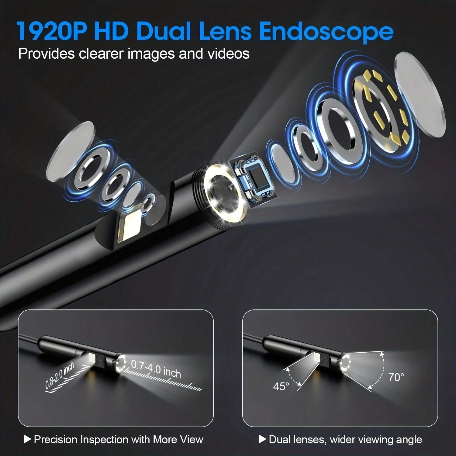 Dual Lens for Enhanced Visibility: Our borescope camera features dual-lens technology with 2 Million Pixels inspection cameras. This cutting-edge design provides you with a clearer, sharper view, making problem-solving a breeze. The 8MM camera is good at exploring small gaps, and coupled with the versatile optimal field of view of 1.2-4 inches, you can easily tackle even the tightest spaces
