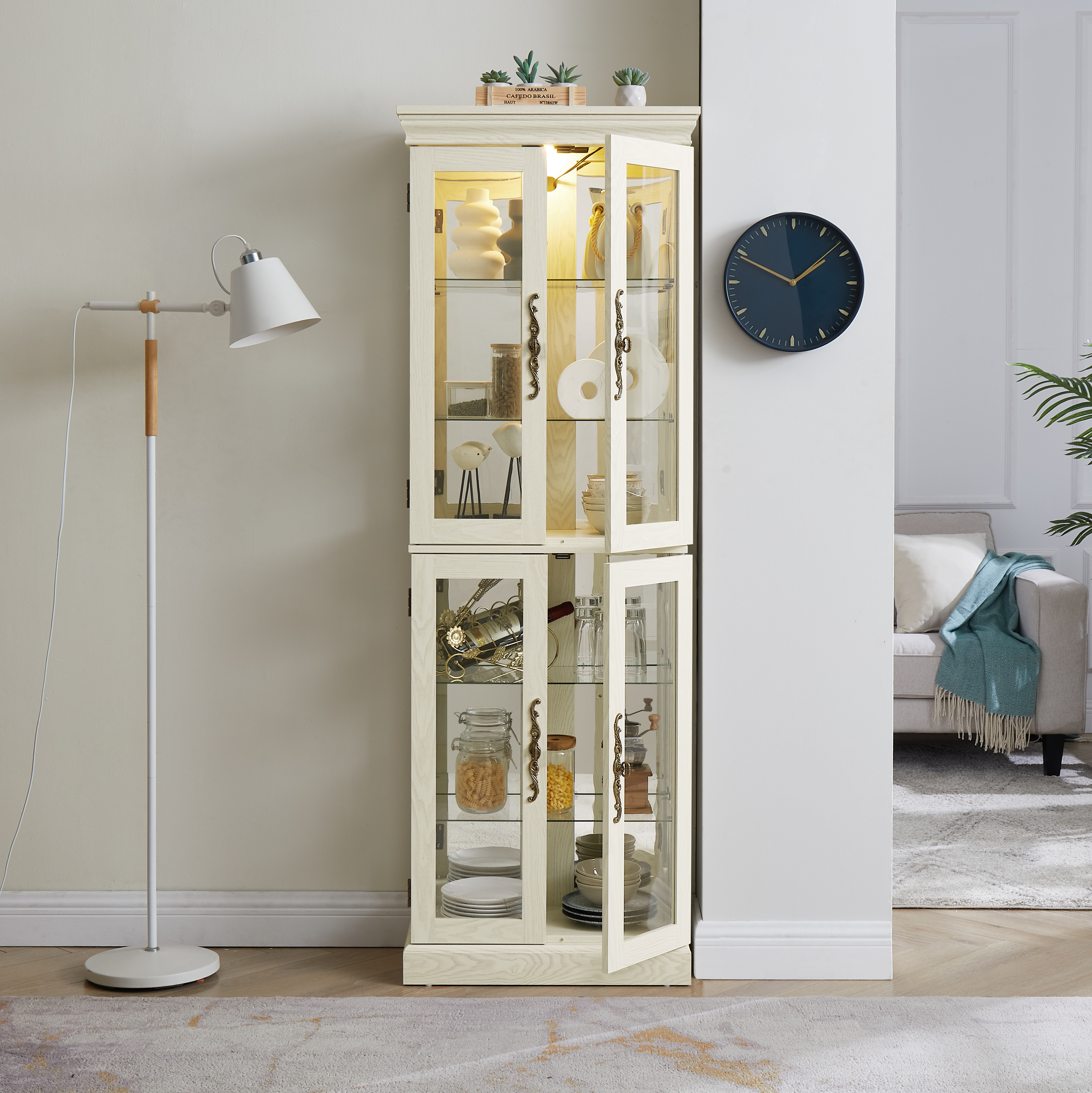 Product Name:Lighted Glass Curio Display Cabinet,Display Cabinet,Glass Storage Cabinet Glass Wine cabinet Wood Frame Toy Display for Living Room, Kitchen, Pantry light bulb included Antique white