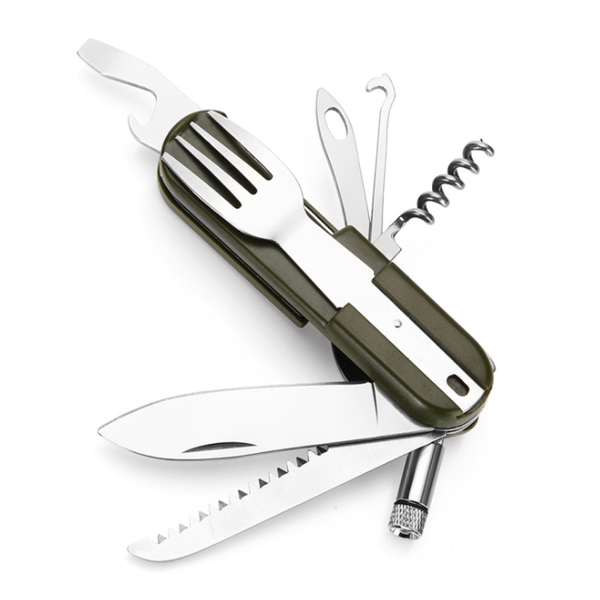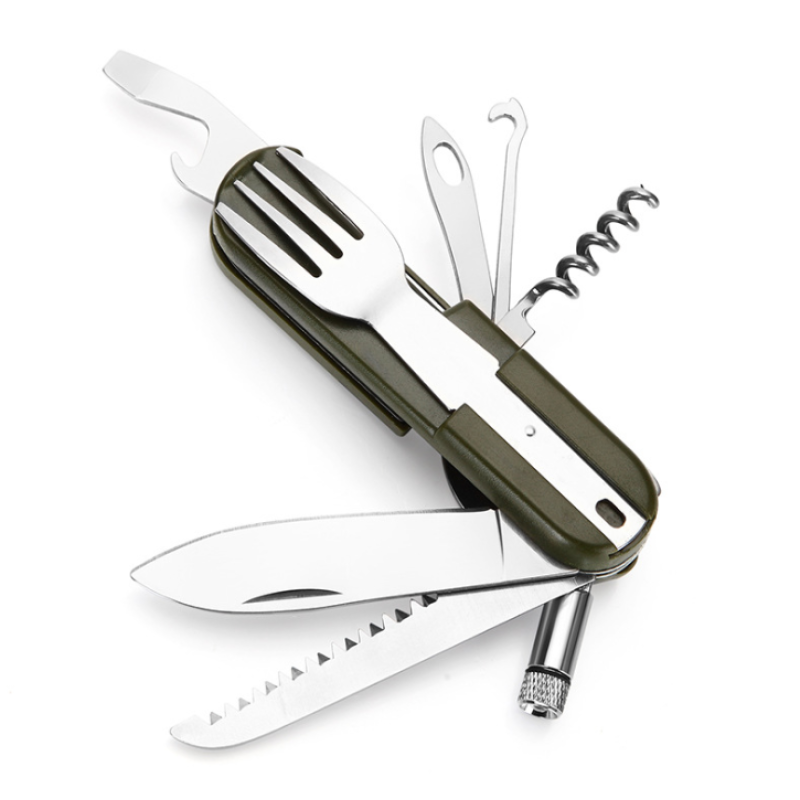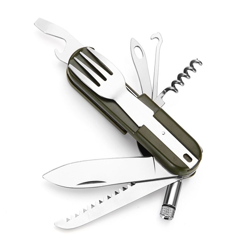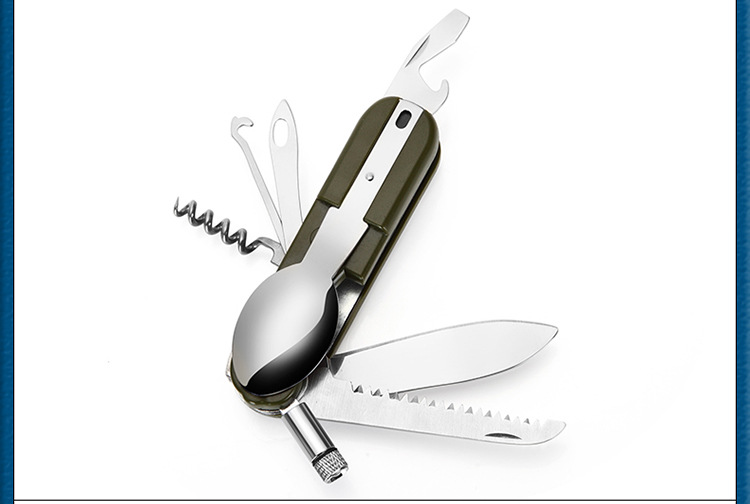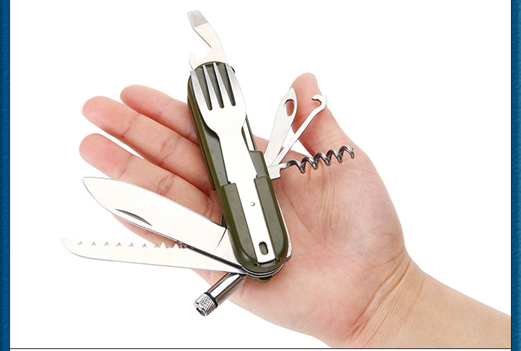 Function: forks, spoons, knives, bottle opener, saws and other functions, LED lights: Open: clockwise rotation. Closed: Shun clockwise rotation