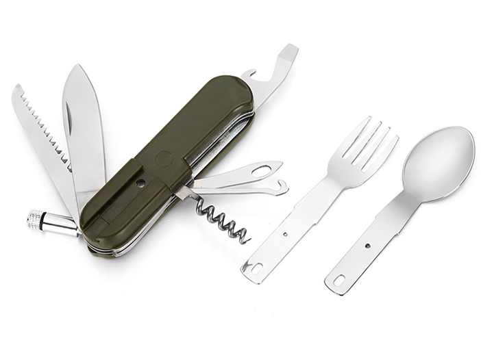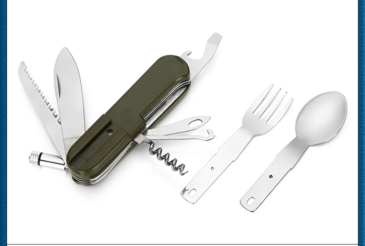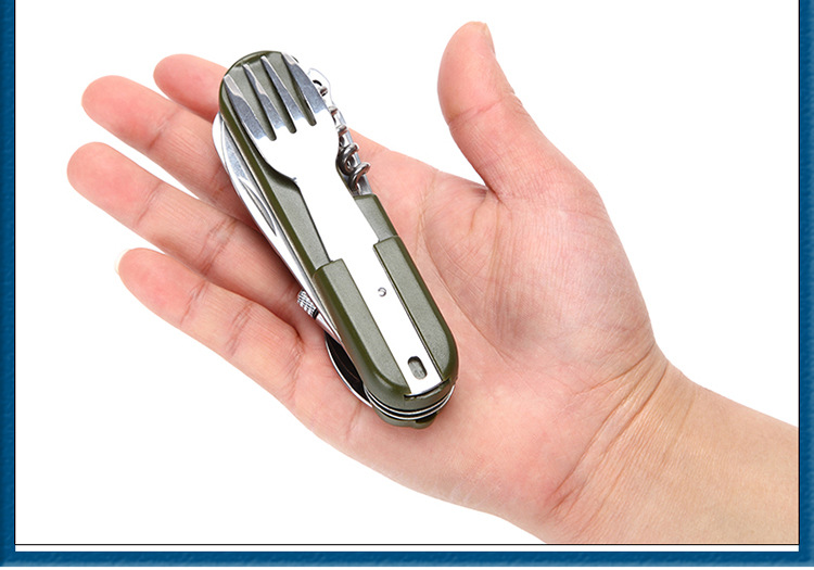 Size: the size of the spoon: 10*3CM (length * width) fork; size: 10*2CM (length * width); saw length of 8cm, tool length 8cm, bottle opener length 4cm;