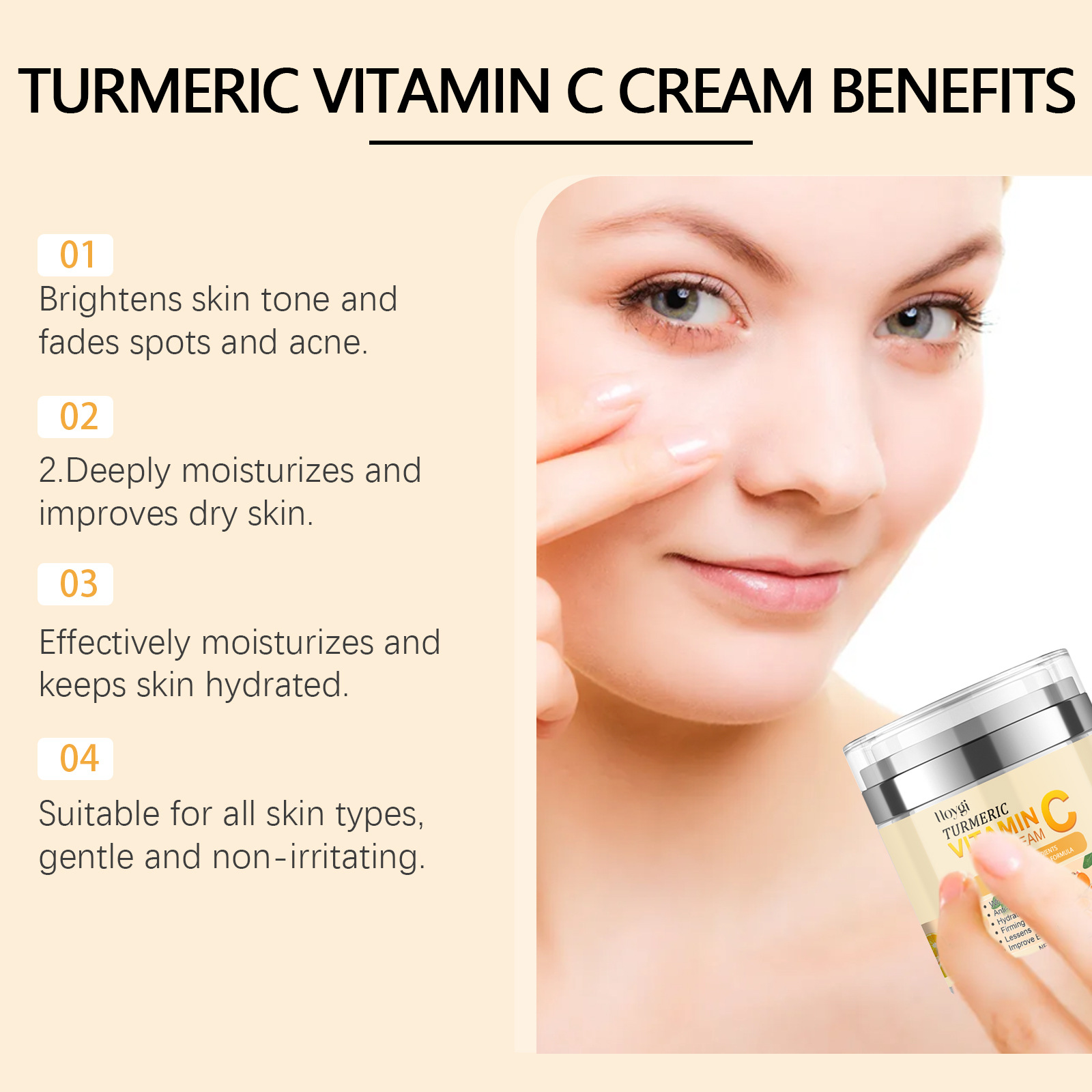 Ingredients: turmeric root extract, vitamin C, aloe extract, jojoba oil, hyaluronic acid.