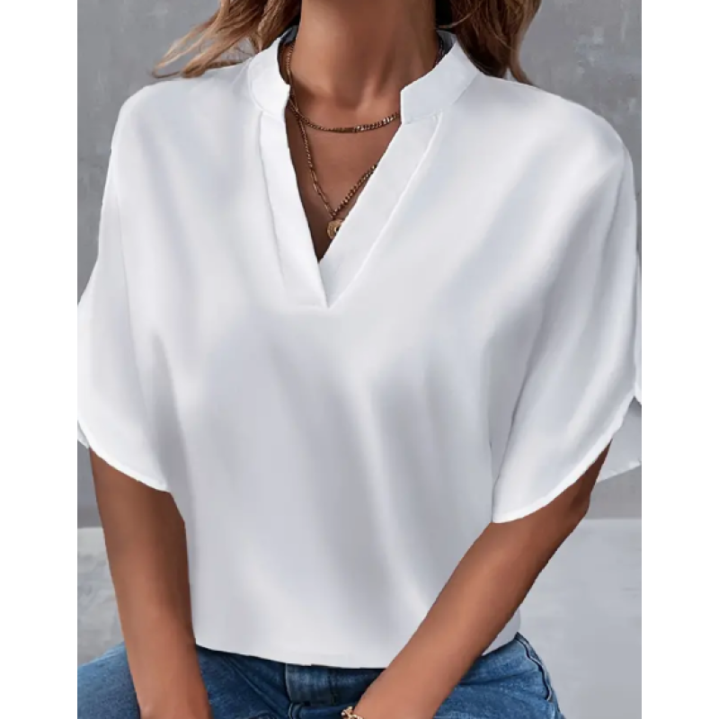 Lightweight Solid Color Notch Neck Blouse - Stylish Short Split Sleeves For Spring & Summer - Trendy Womens Casual Top