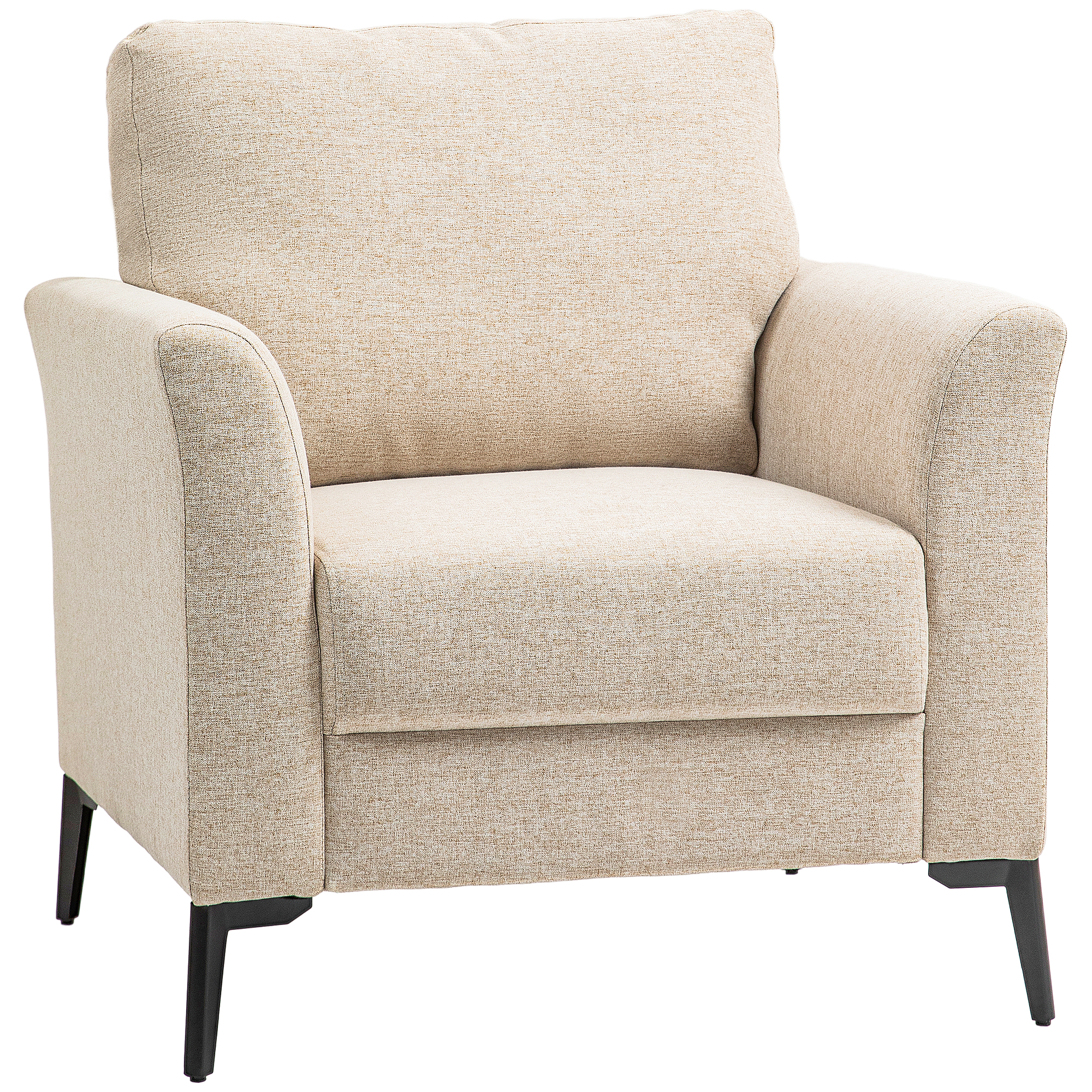 Sink into comfort with this accent chair for living room. Thick, high-density padding means soft comfort to keep you relaxed. The high back and armrest keep you supported. With a wooden frame and metal legs, this occasional chair has a strong, supportive core. Complete with protective foot pads.