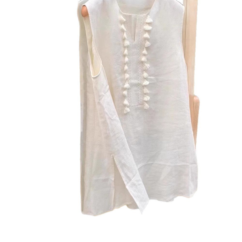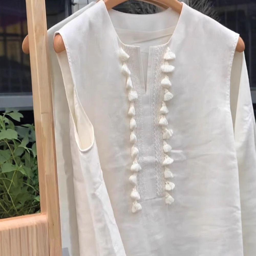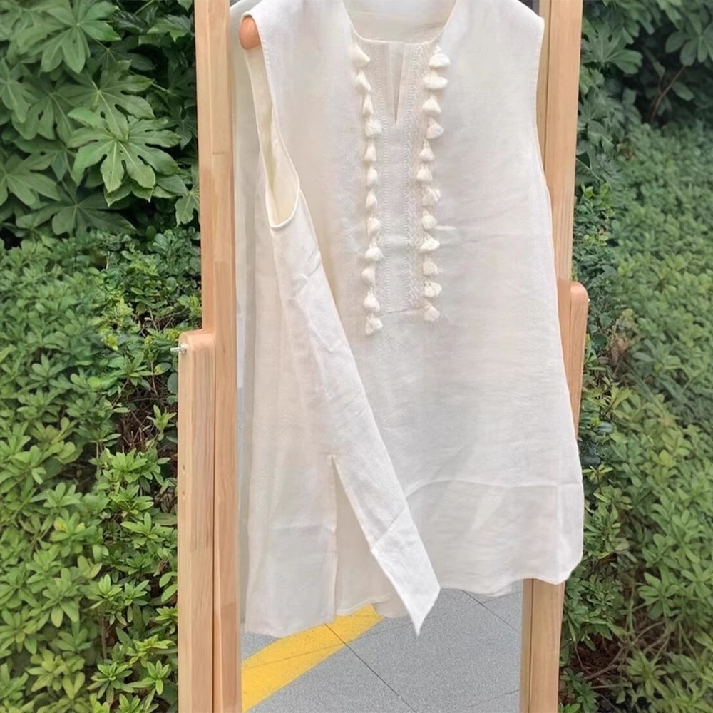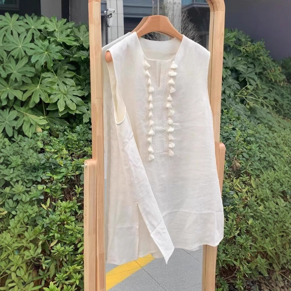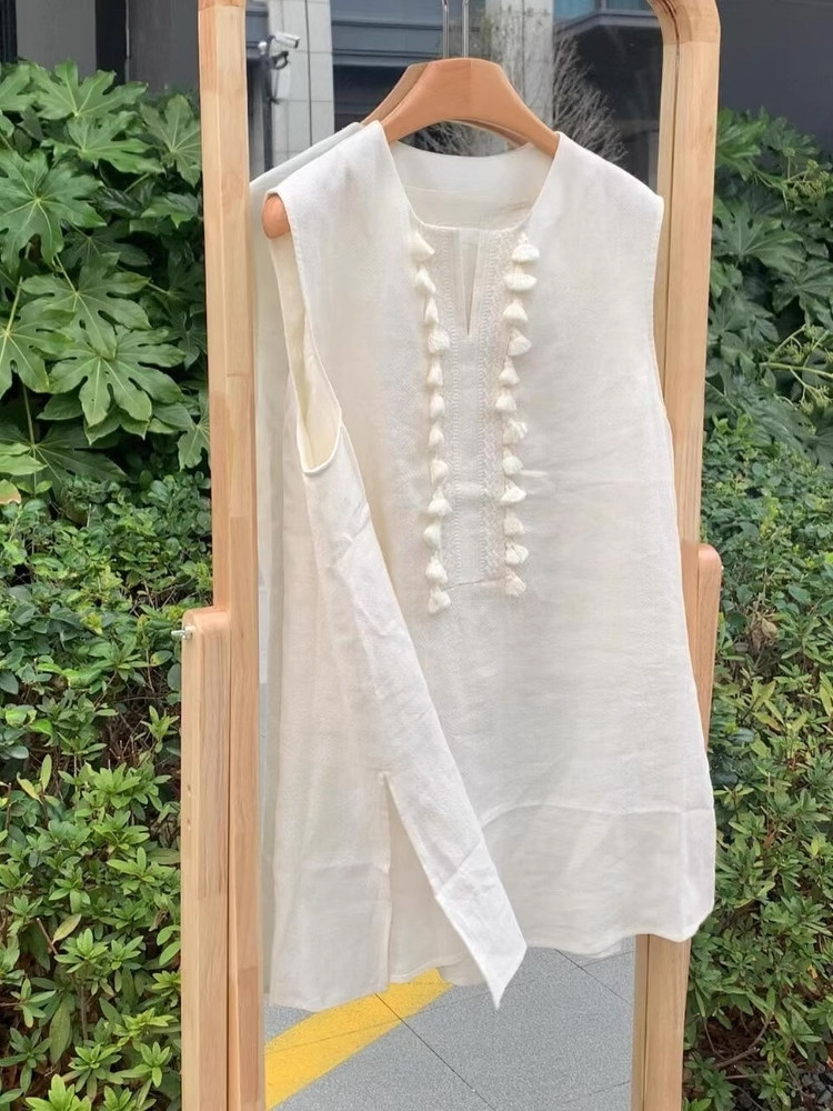 Linen Vest For Women Mid-length Unique Tassel Sleeveless Shirt Summer
