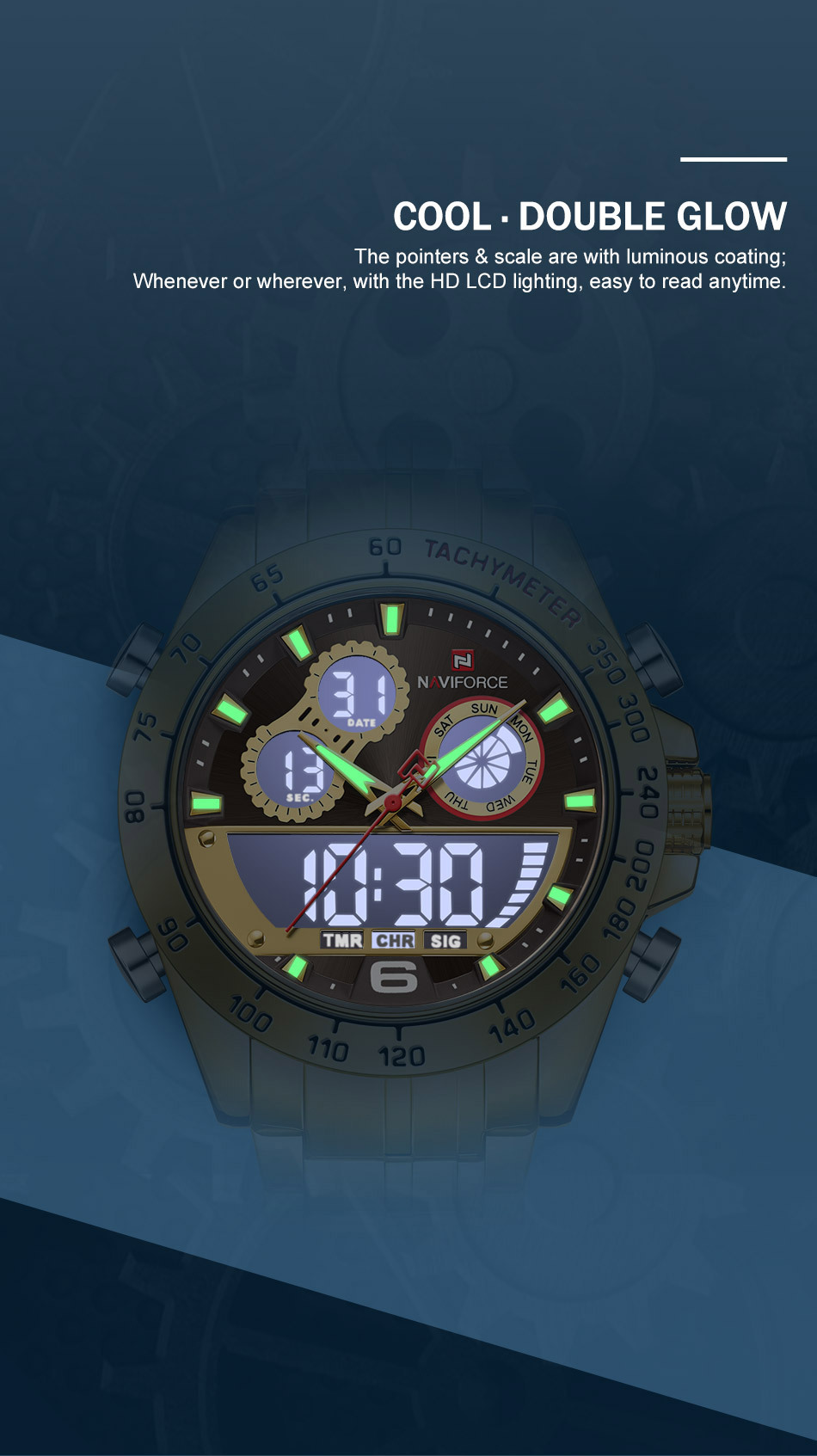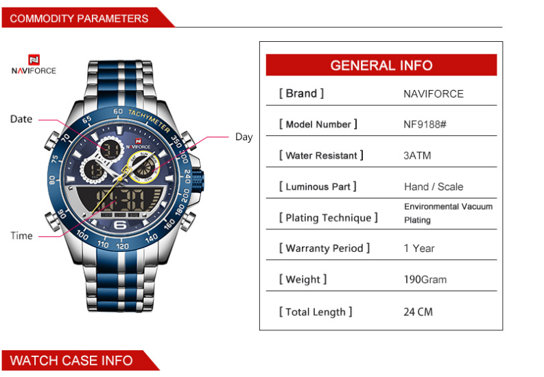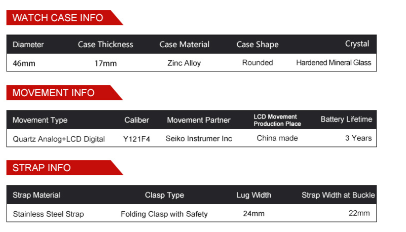 Special functions: luminous, alarm, calendar, 24-hour indication, week display, month display