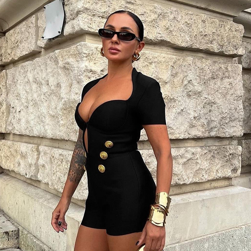 Lion Buckle One-piece Shorts Black V-neck