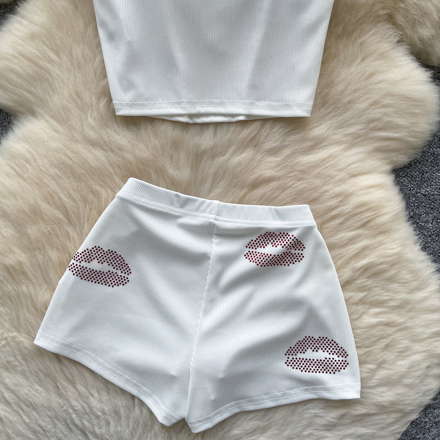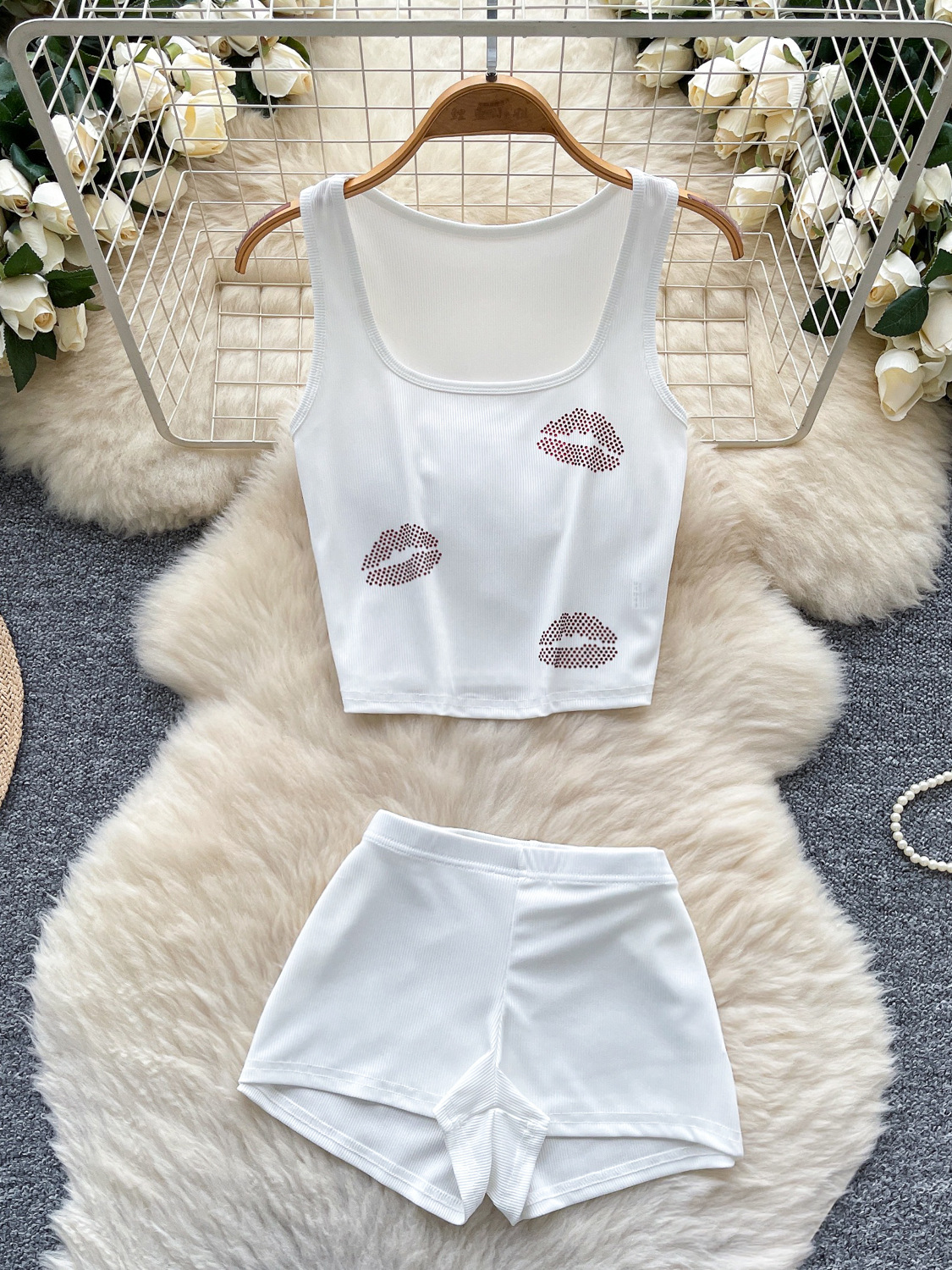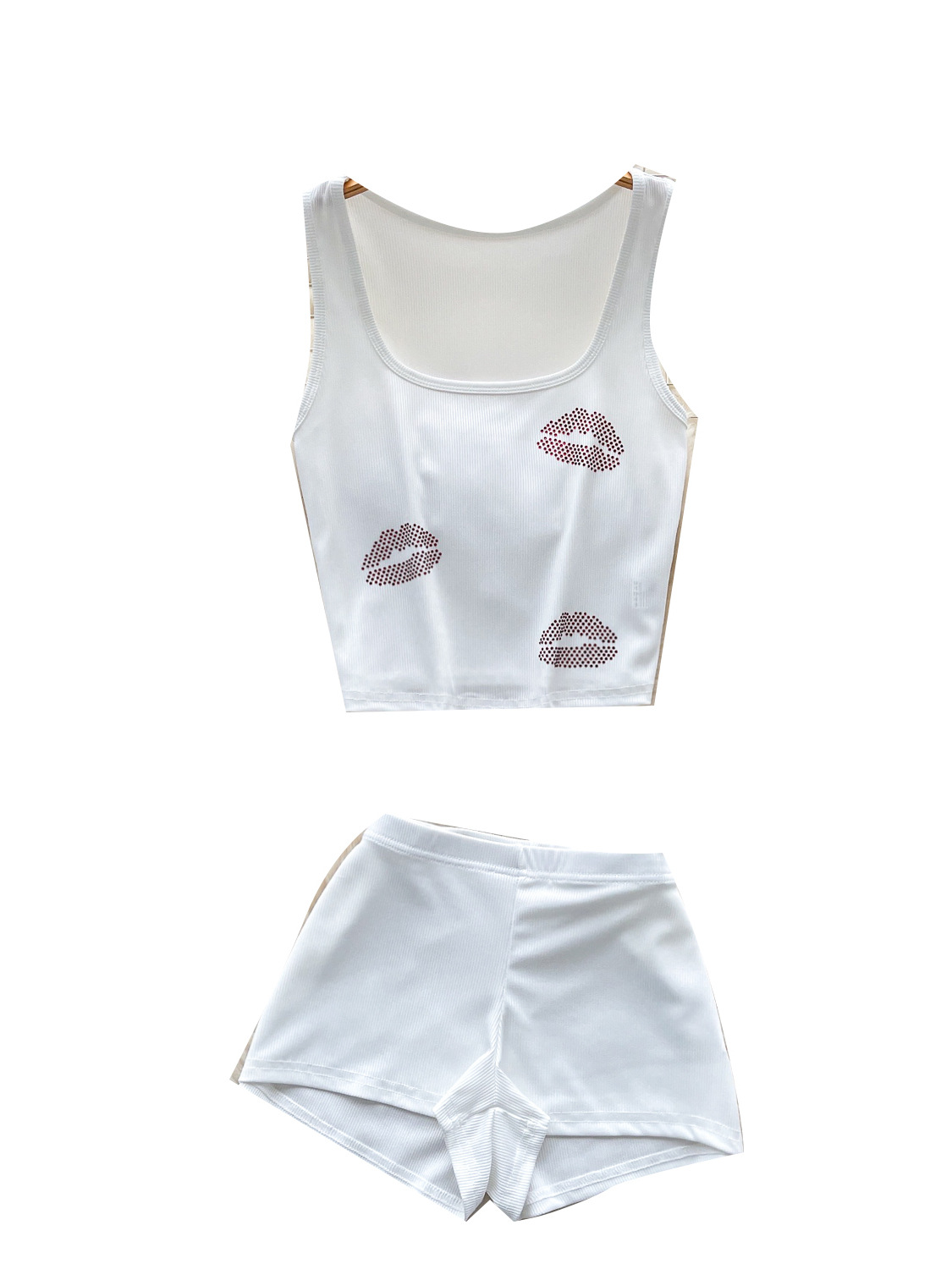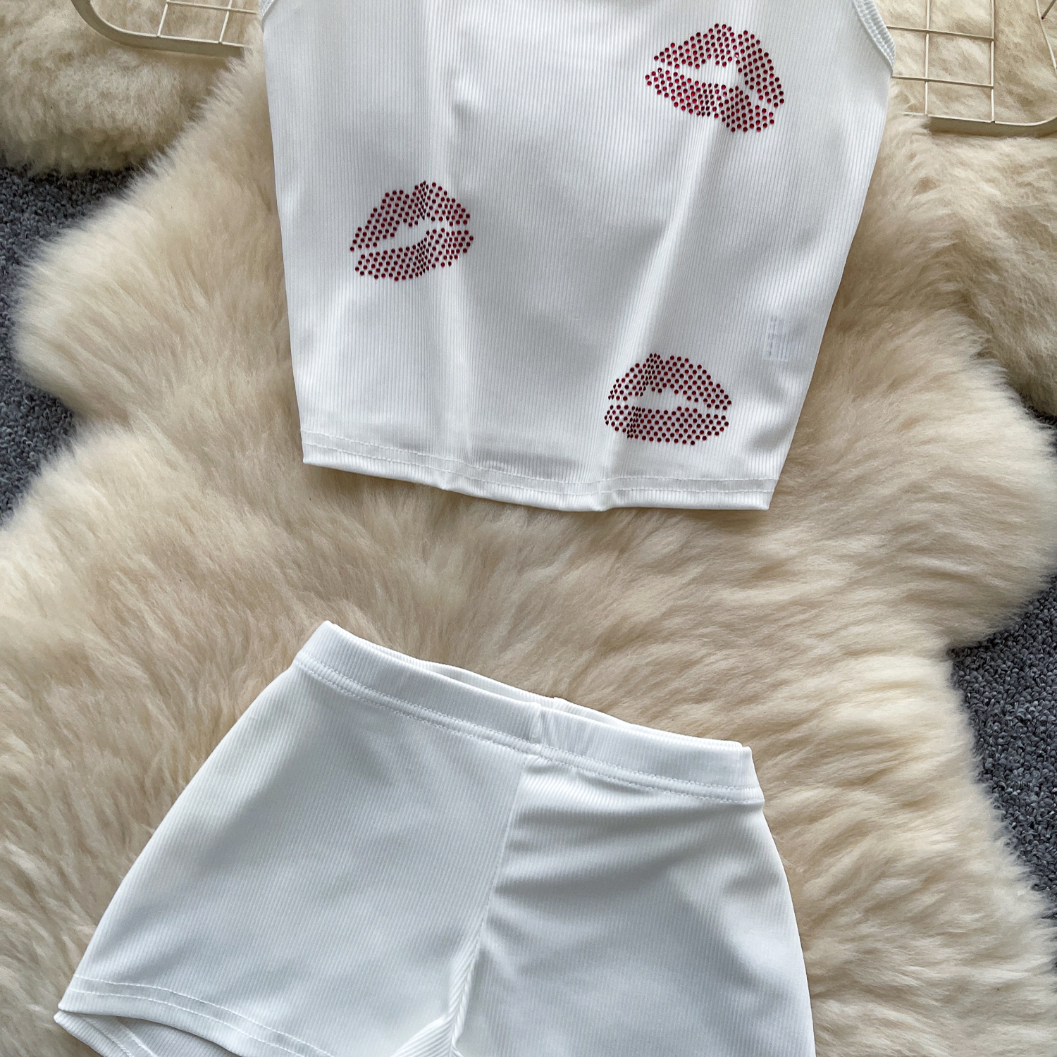 Lip-kiss Rhinestone Square-neck Sleeveless Tank Top With High-waisted Leggings And Shorts