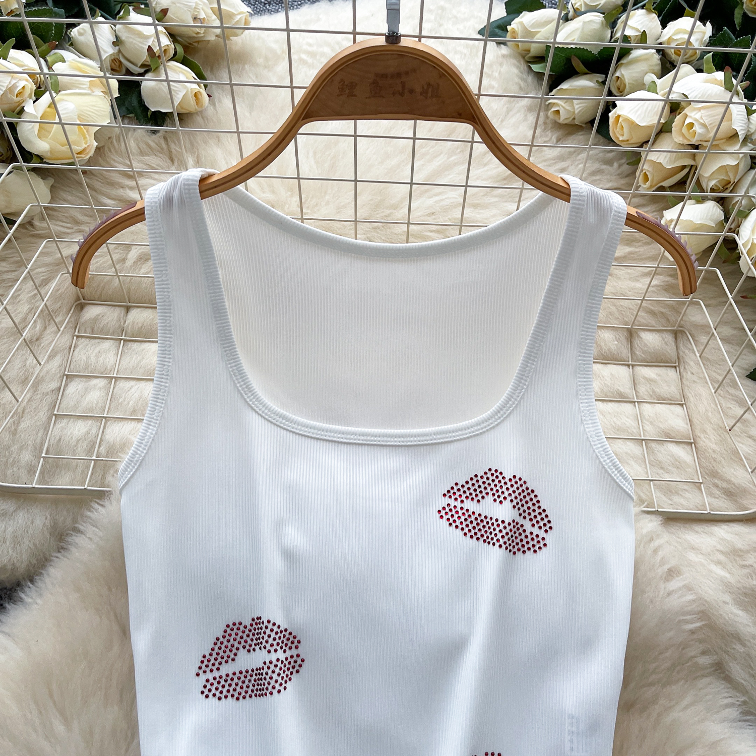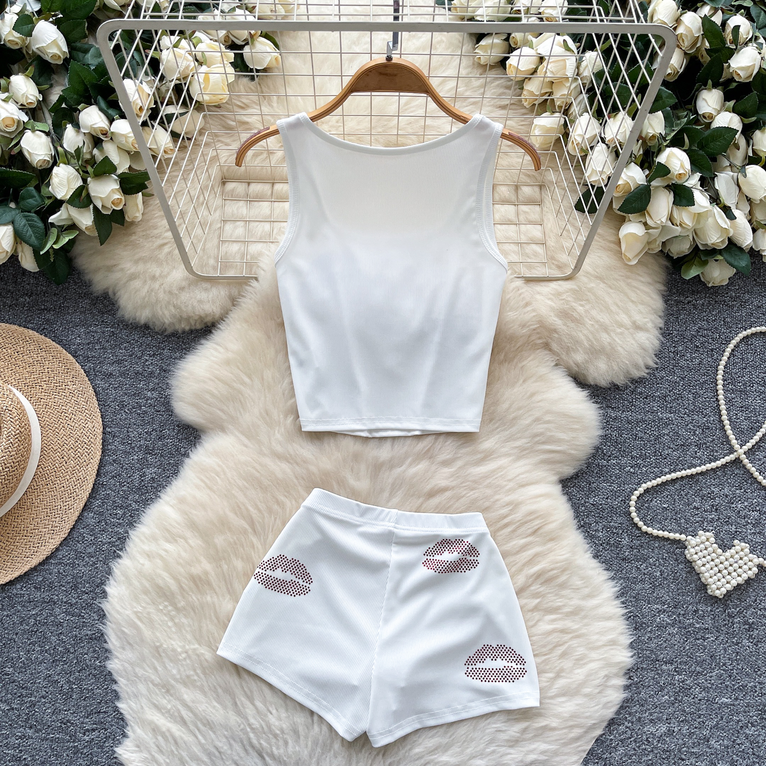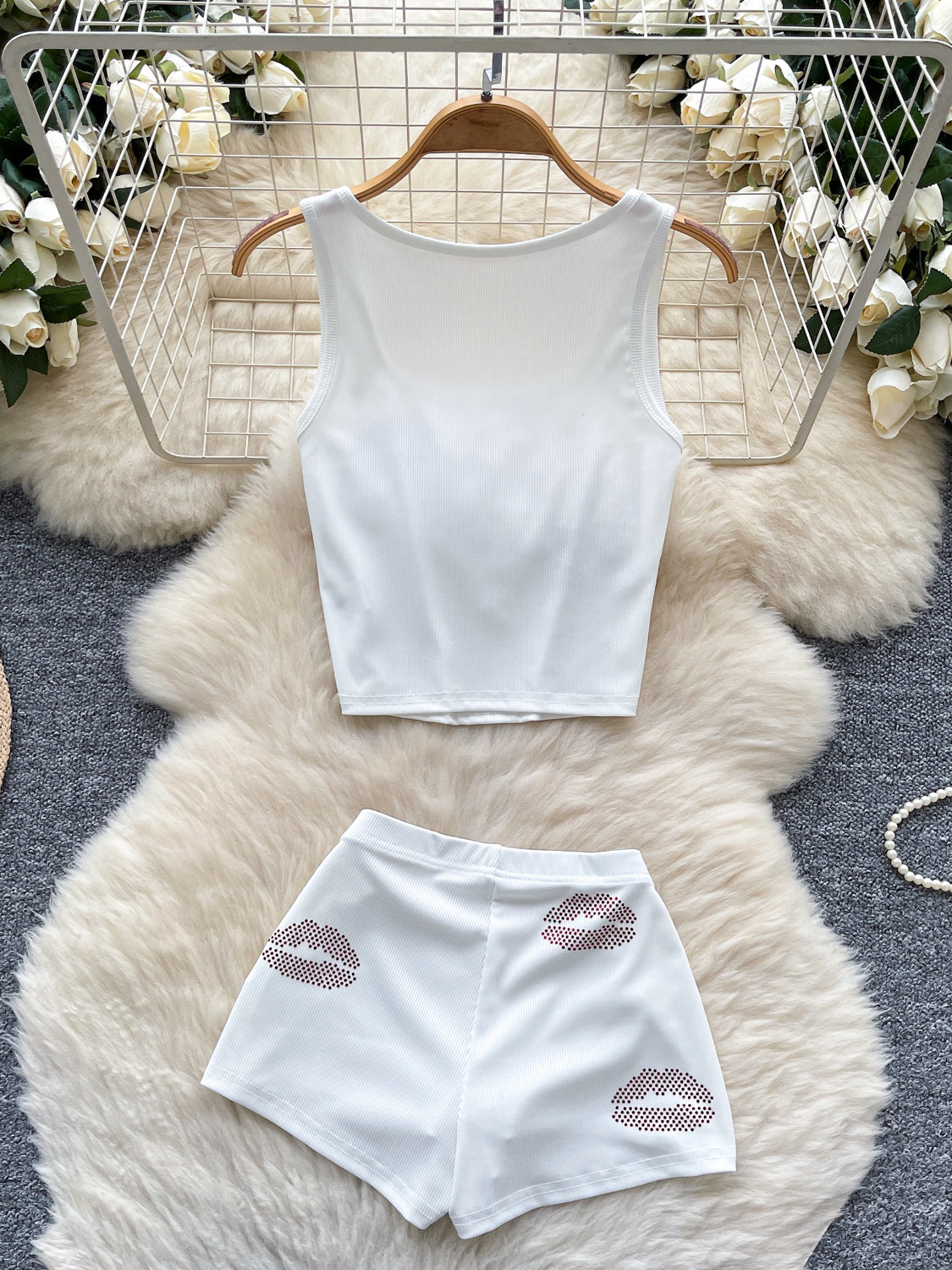 Lip-kiss Rhinestone Square-neck Sleeveless Tank Top With High-waisted Leggings And Shorts