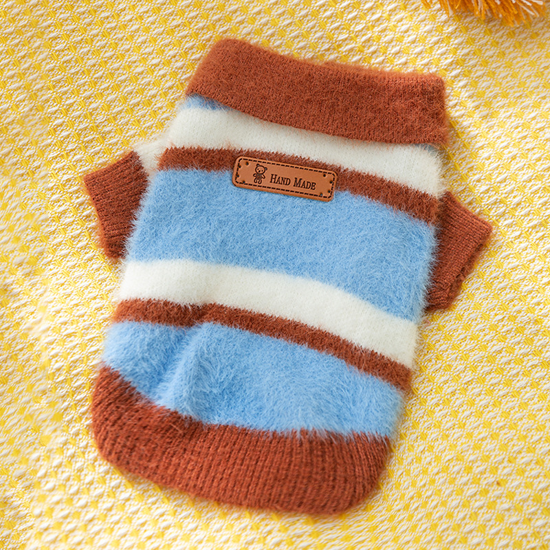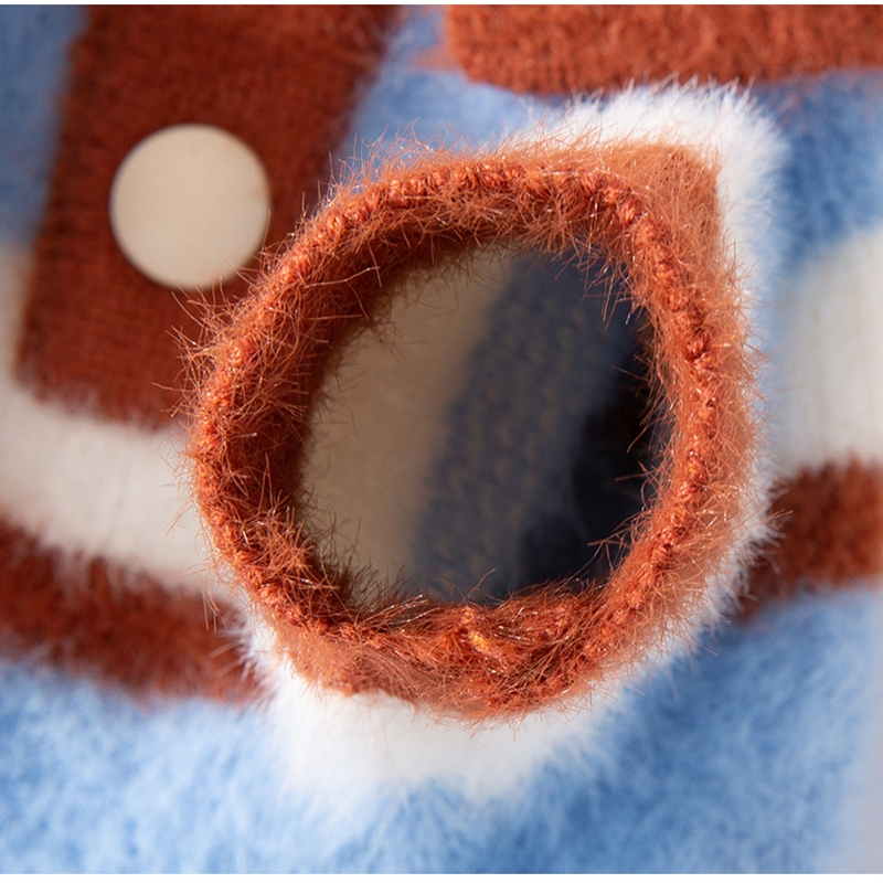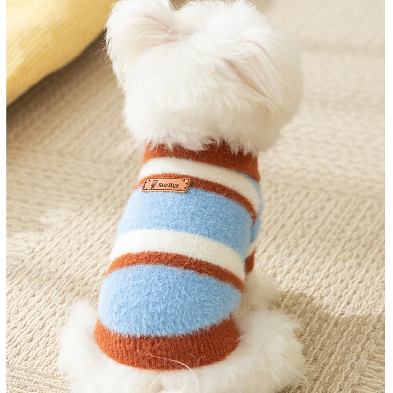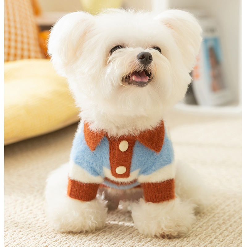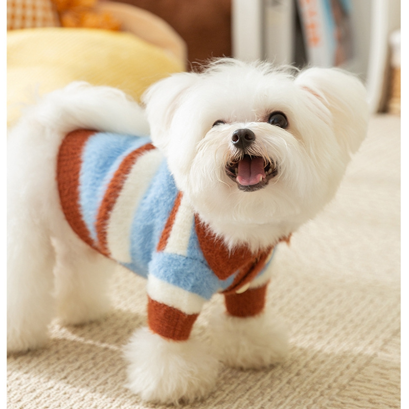 Enhance your pet's casual wardrobe with this Polo collar pet cardigan! There are two college-style designs - pink stripes and blue-brown stripes - each sweater features a classic polo collar, front buttons, and soft striped knitted fabric. Relaxing patches ensure comfortable and effortless exercise. This cardigan is perfect for daily walks or comfortable indoor days. It combines the charm of school style, timeless stripes and brand-driven style, making it a must-have for pet parents who want their furry companions to remain fashionable and comfortable in an elegant and casual look.