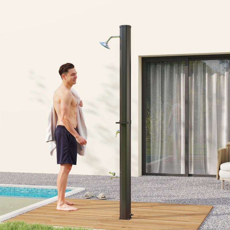 • - Solar Powdered Outdoor Showering: This solar heated outdoor shower can effectively heat its 9.2 gallon tank up to a water temperature of 131°F, making it a great outdoor pool shower for after swimming or for staying clean on a camping trip