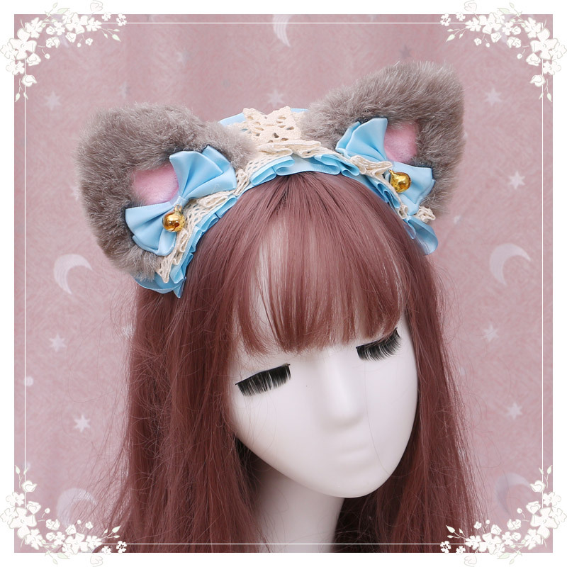 19 hair band triangle cat ear (light grey white + blue ribbon),