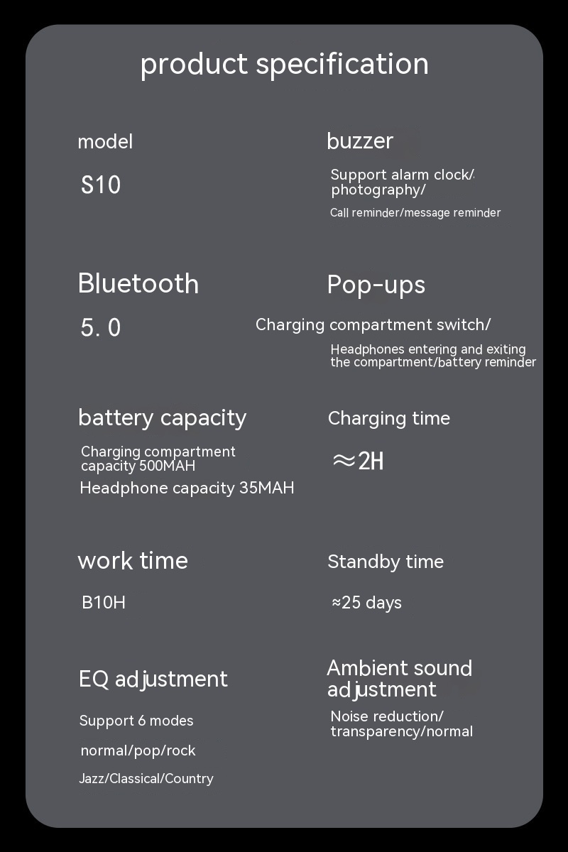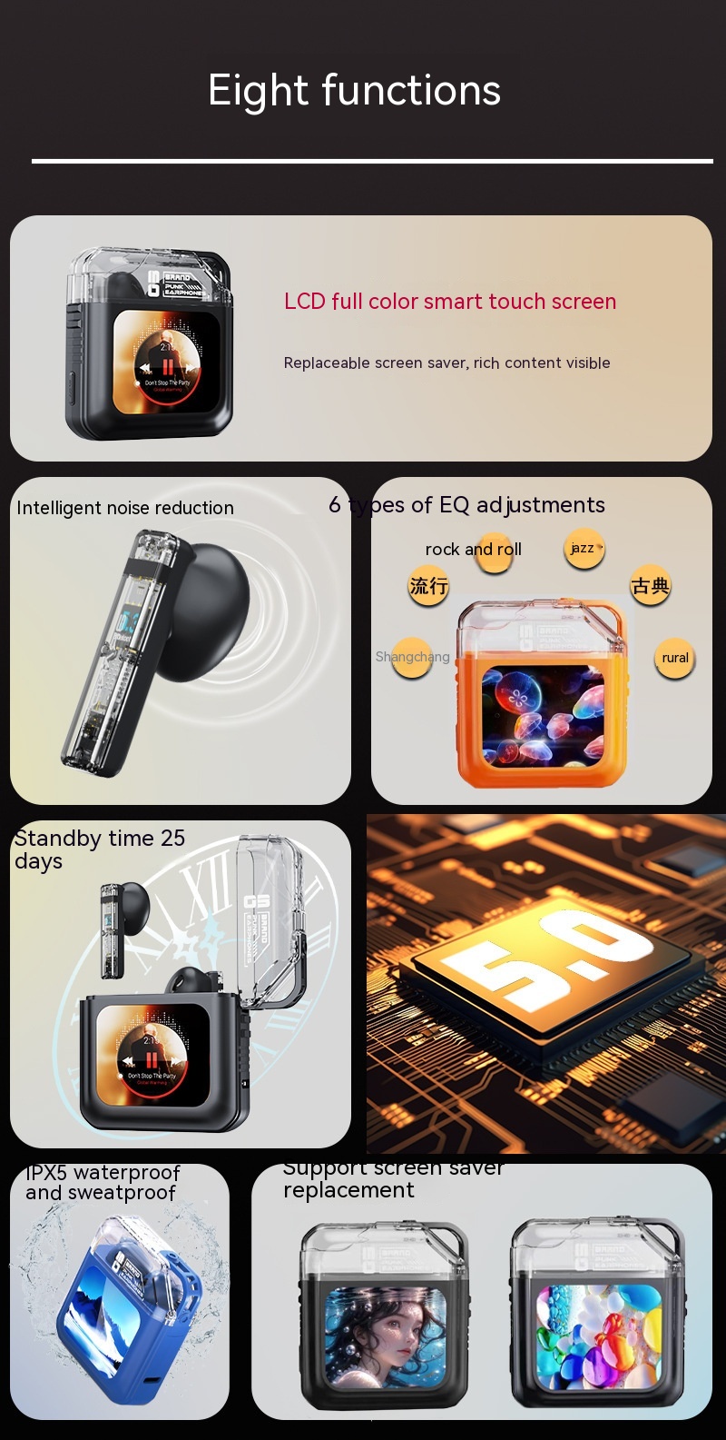Function: waterproof, noise reduction, breathing light, ultra-long life battery, call function, voice control, support music, digital display screen