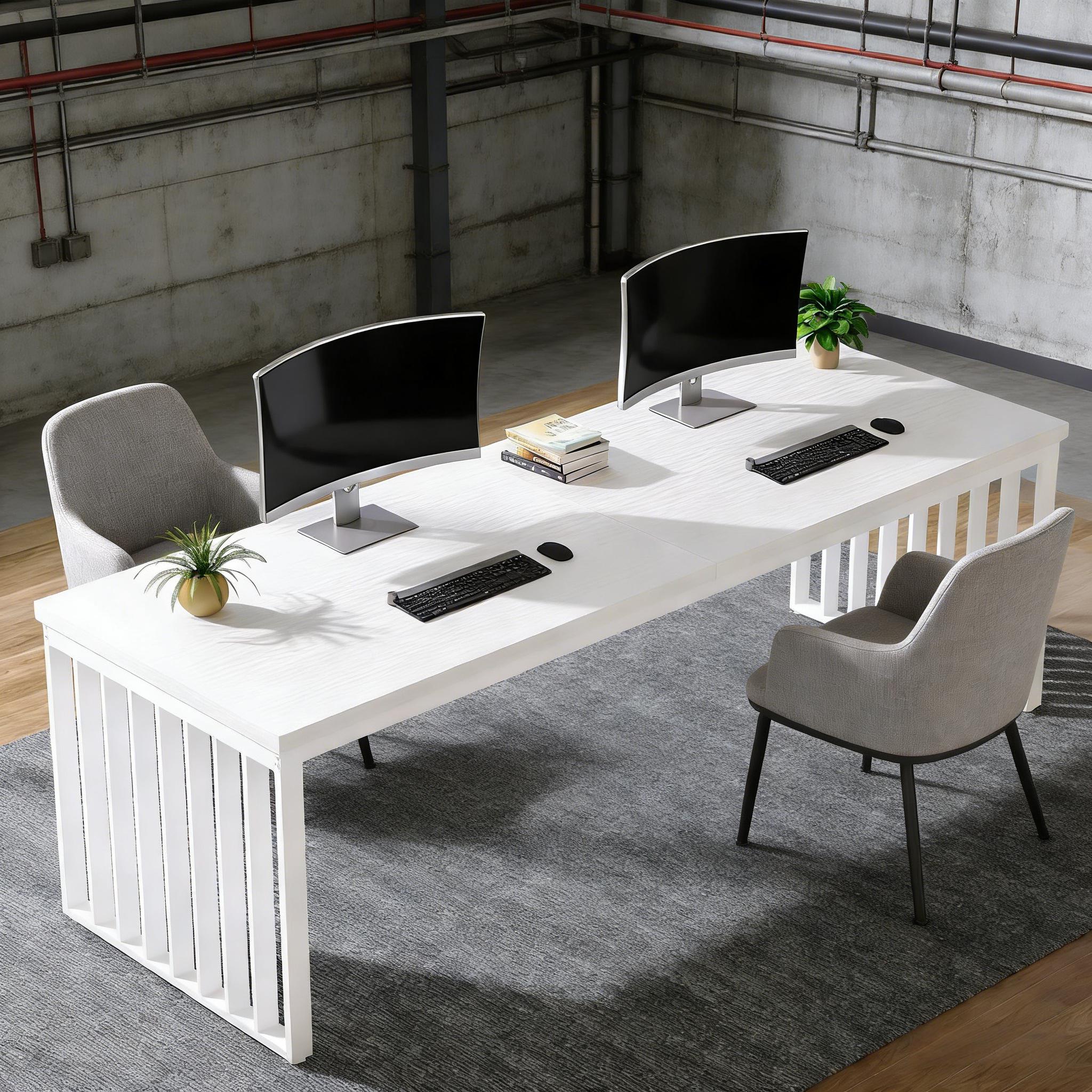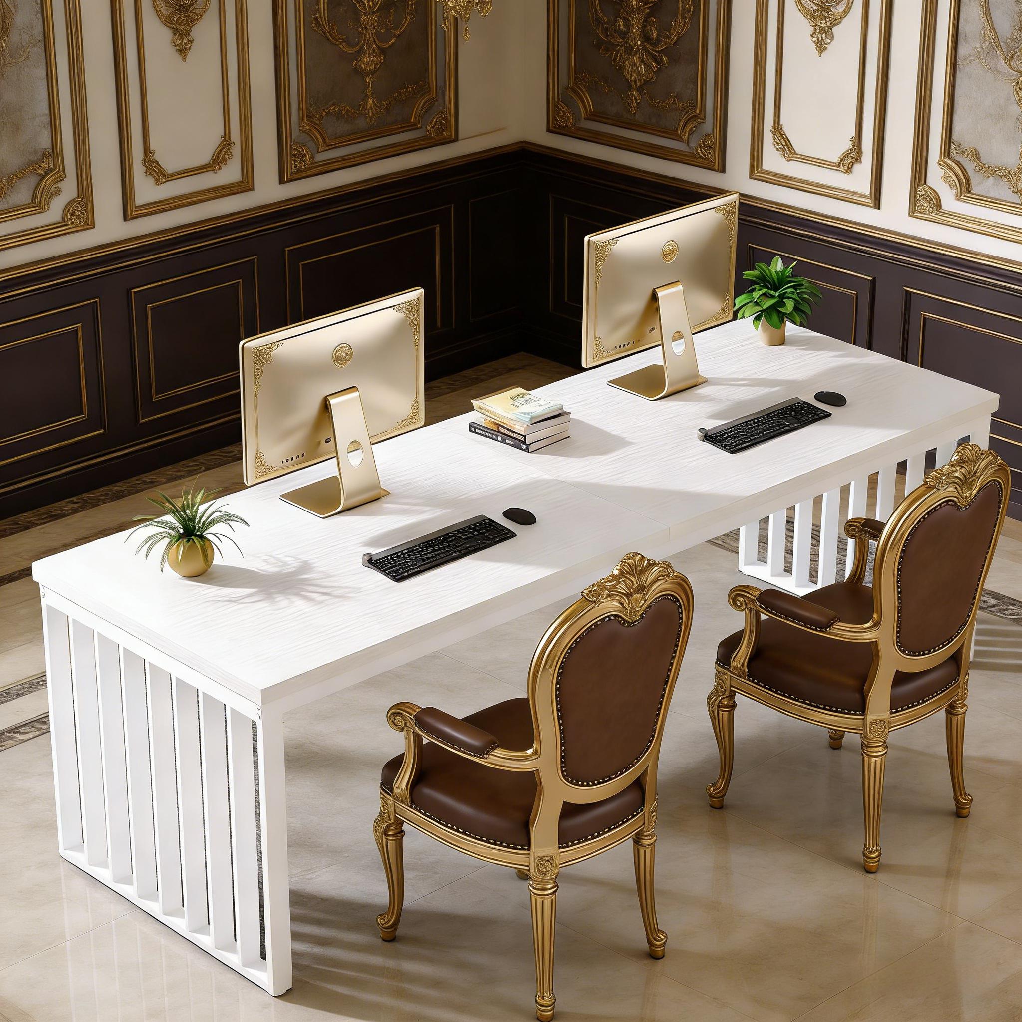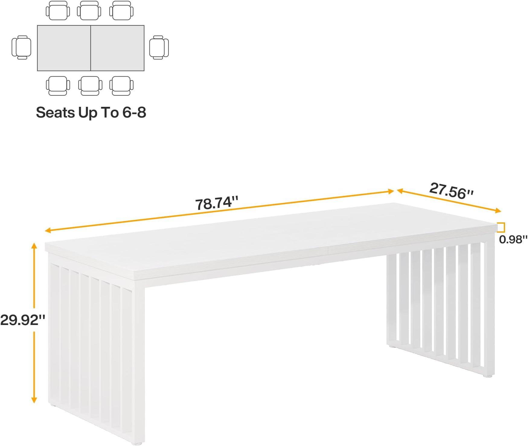 Important Reminder!!! 1) Attention: All products in our store do not support Canada self pickup ordering. Please do not create shipping labels for Canada. Our American products do not support self pickup to Canada 2)We do not ship to Alaska, Hawaii, US protectorates (e.g., Puerto Rico), P.O. boxes, or APO/FPO addresse 3)We don’t accept non-defective remorse returns Sturdy Office Desk - This desk ensures stability and durability with a 0.98-inch thick MDF board tabletop framed with heavy-duty, powder-coated iron tubing. Able to support up to 200 lbs, this desk is built to last. Expansive Workspace - This large, 78.74-inch by 27.56-inch tabletop offers plenty of space for work essentials like laptops, books, and files. Reinforced iron tubing under the tabletop enhances support and stability. Two-Person Desk - Comfortably fitting two computers, this large workstation allows two people to work side-by-side without interruptions. It's perfect for sharing a workspace with roommates or family members. Minimalist Industrial Design - With a simplistic industrial charm, this desk keeps things basic. Adjustable feet padding ensures stability and protects floors from scratches. Please note the wood grain may vary as it's a natural material. Effortless Assembly and Cleaning - This desk comes with all necessary tools and instructions for easy assembly. The surface is also easy to clean - just wipe off any dirt with a damp cloth.