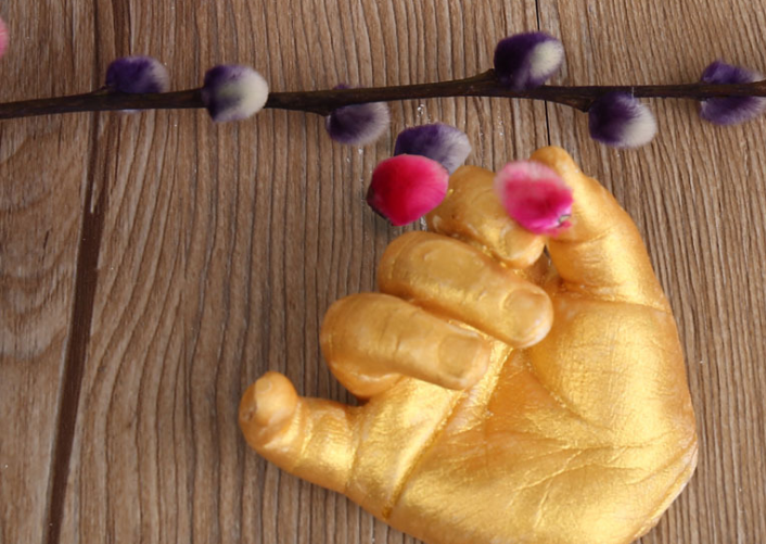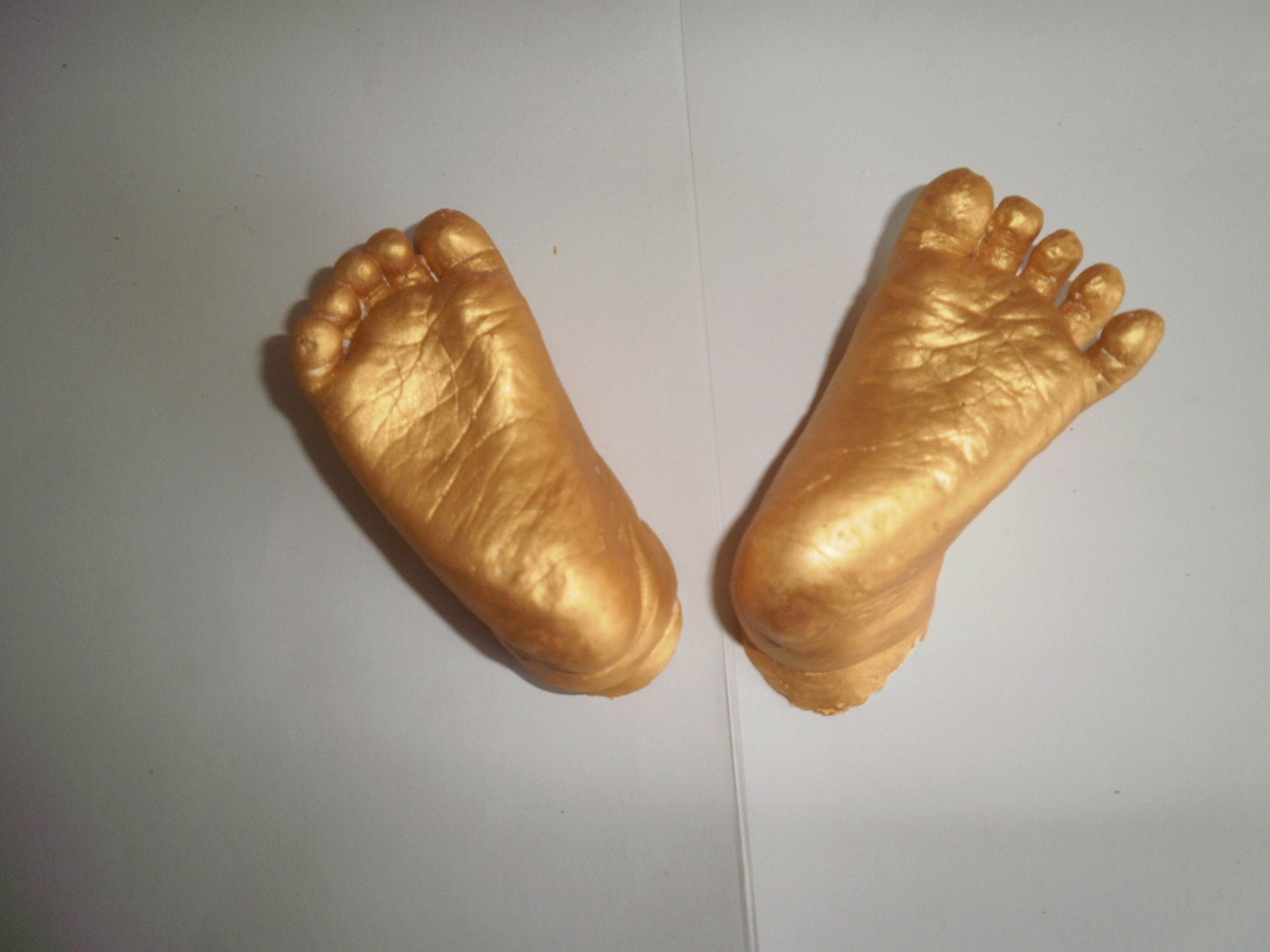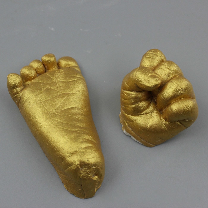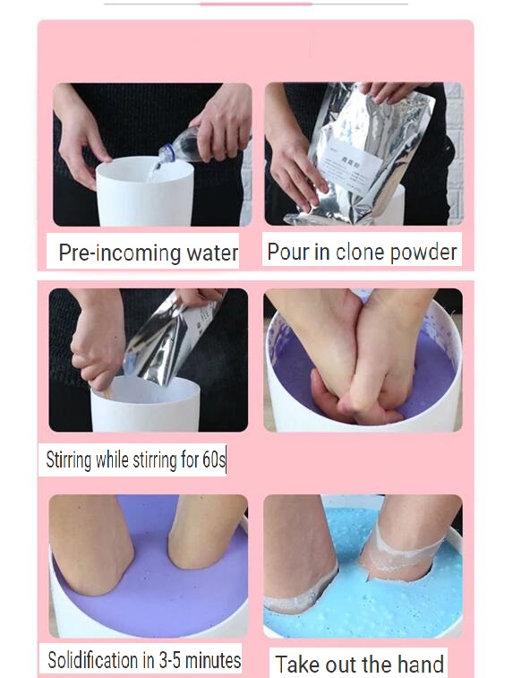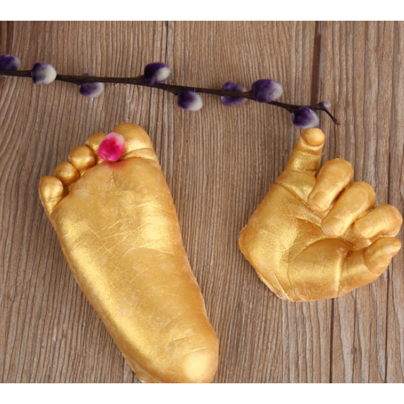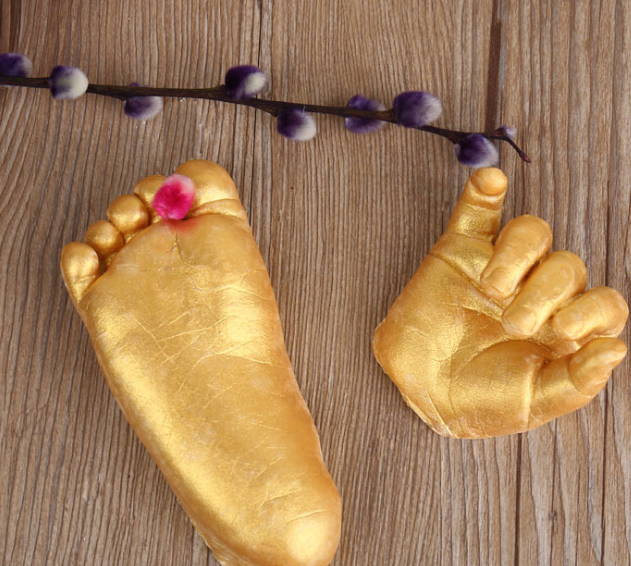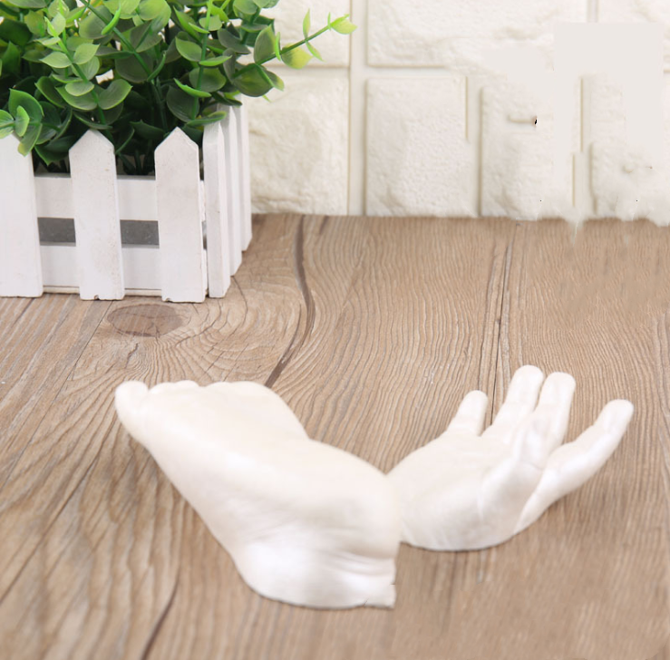 (1) The molding powder is mixed with water. Insert the baby's foot or hand into the molded container. After about 75 seconds, the mold settled. Remove the baby's foot (or hand) from the molding material.
