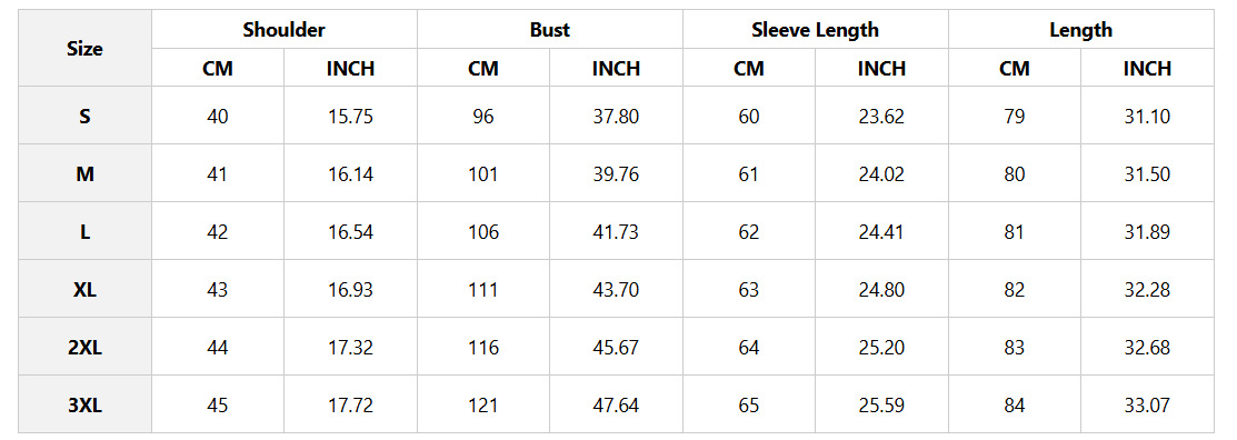 Sizes: S, M, L, XL, XXL, XXXL