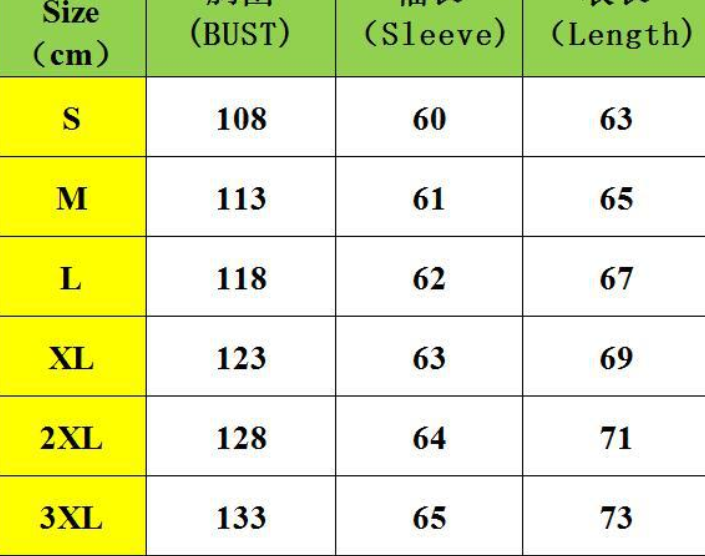 Size: S, M, L, XL, 2XL, 3XL unit: cm