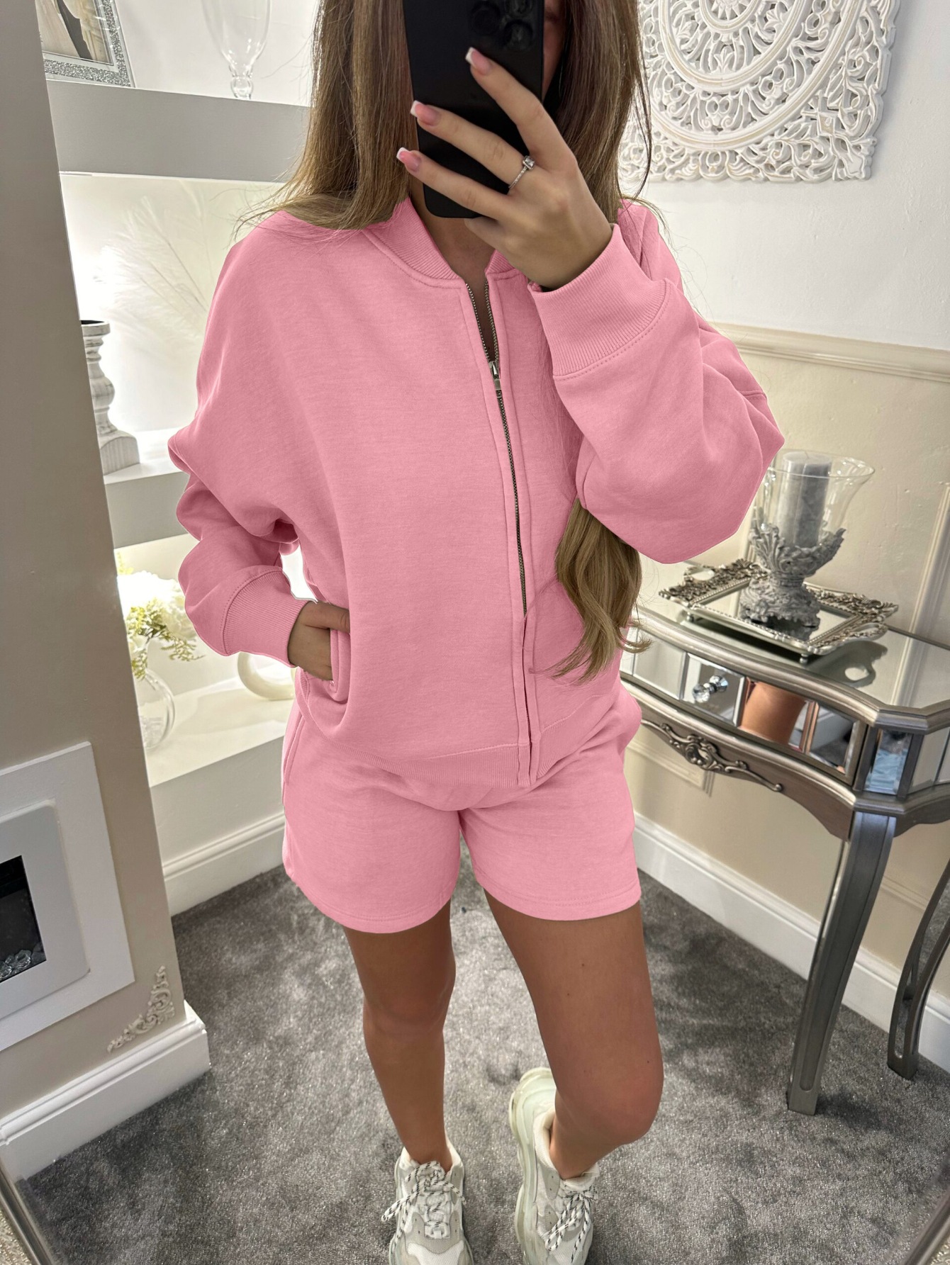 Color: pink, dark gray, light gray, khaki