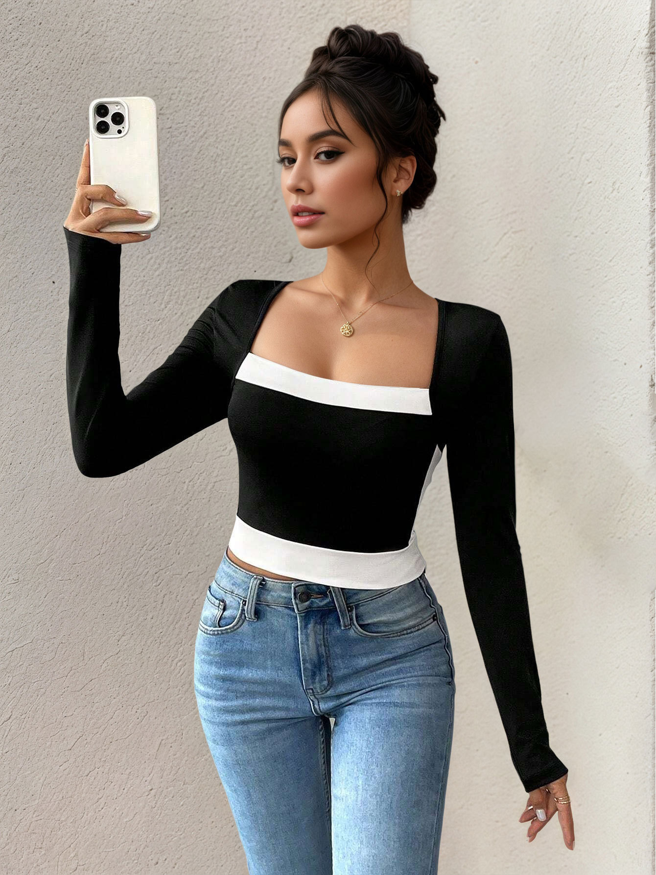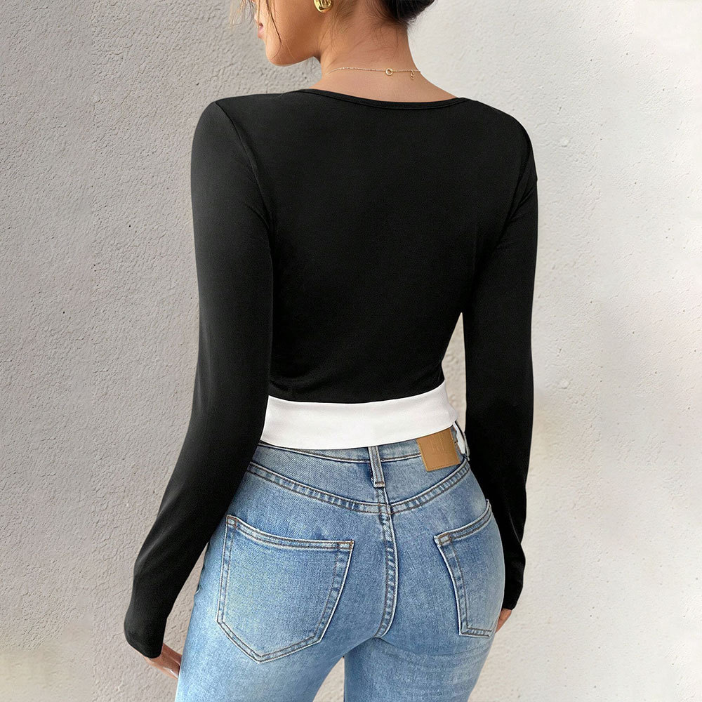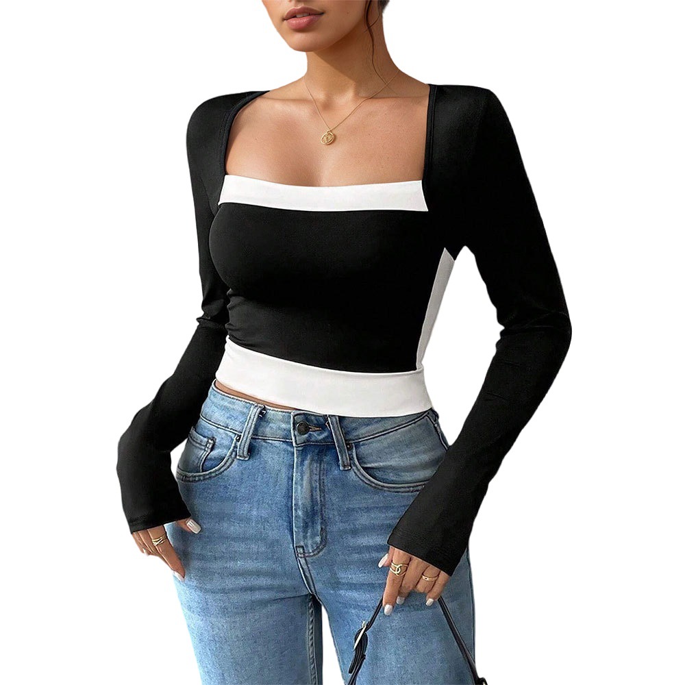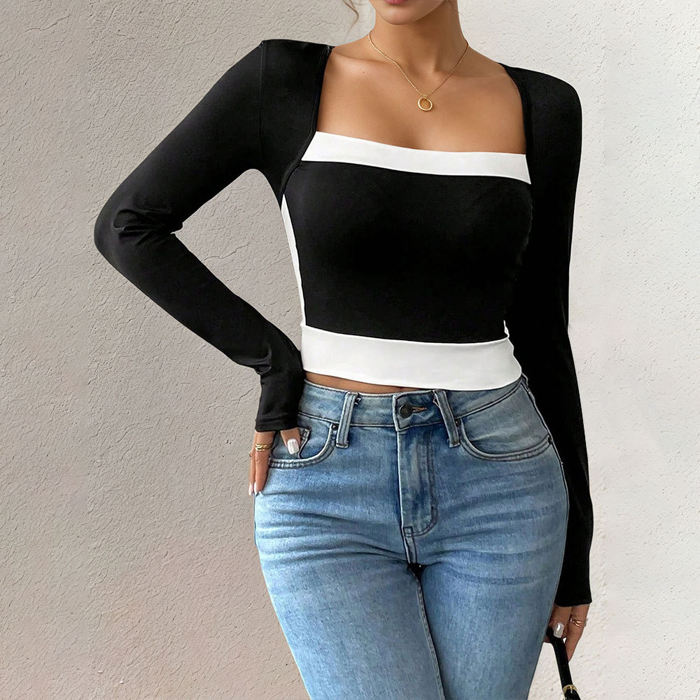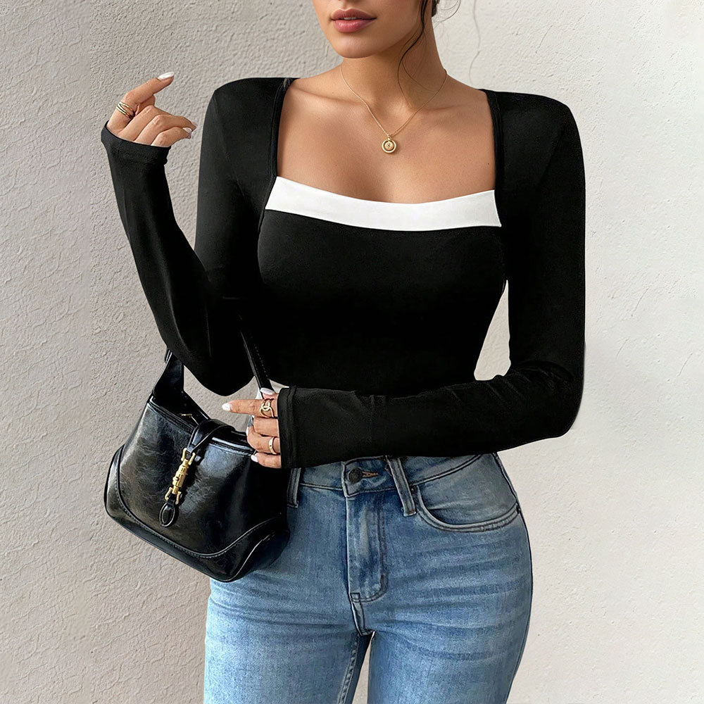Long-sleeve Color-block Square Neck Versatile T-shirt Elegant Top