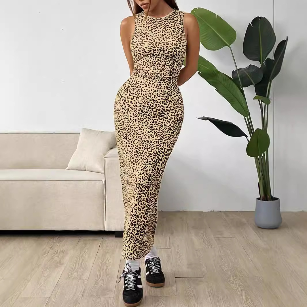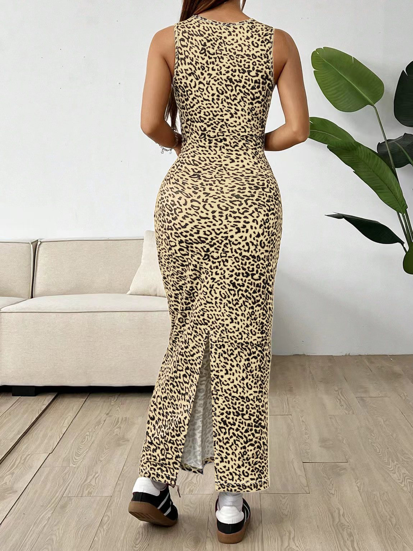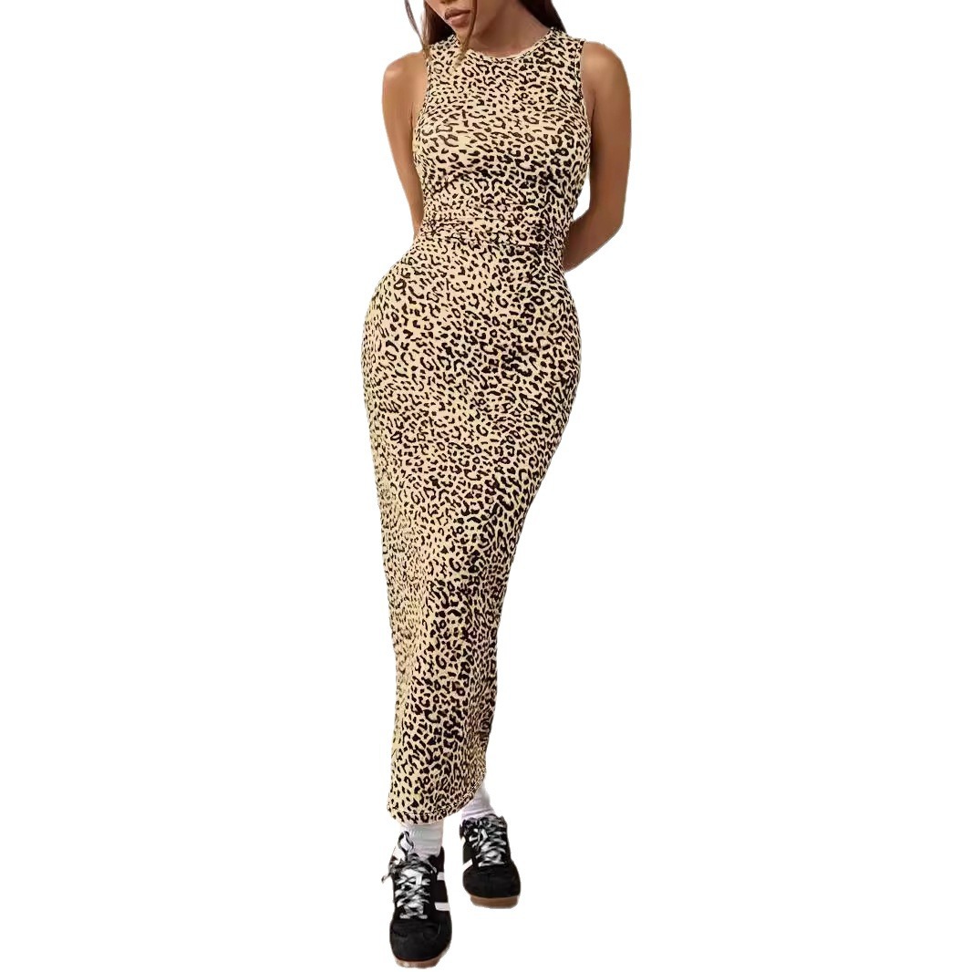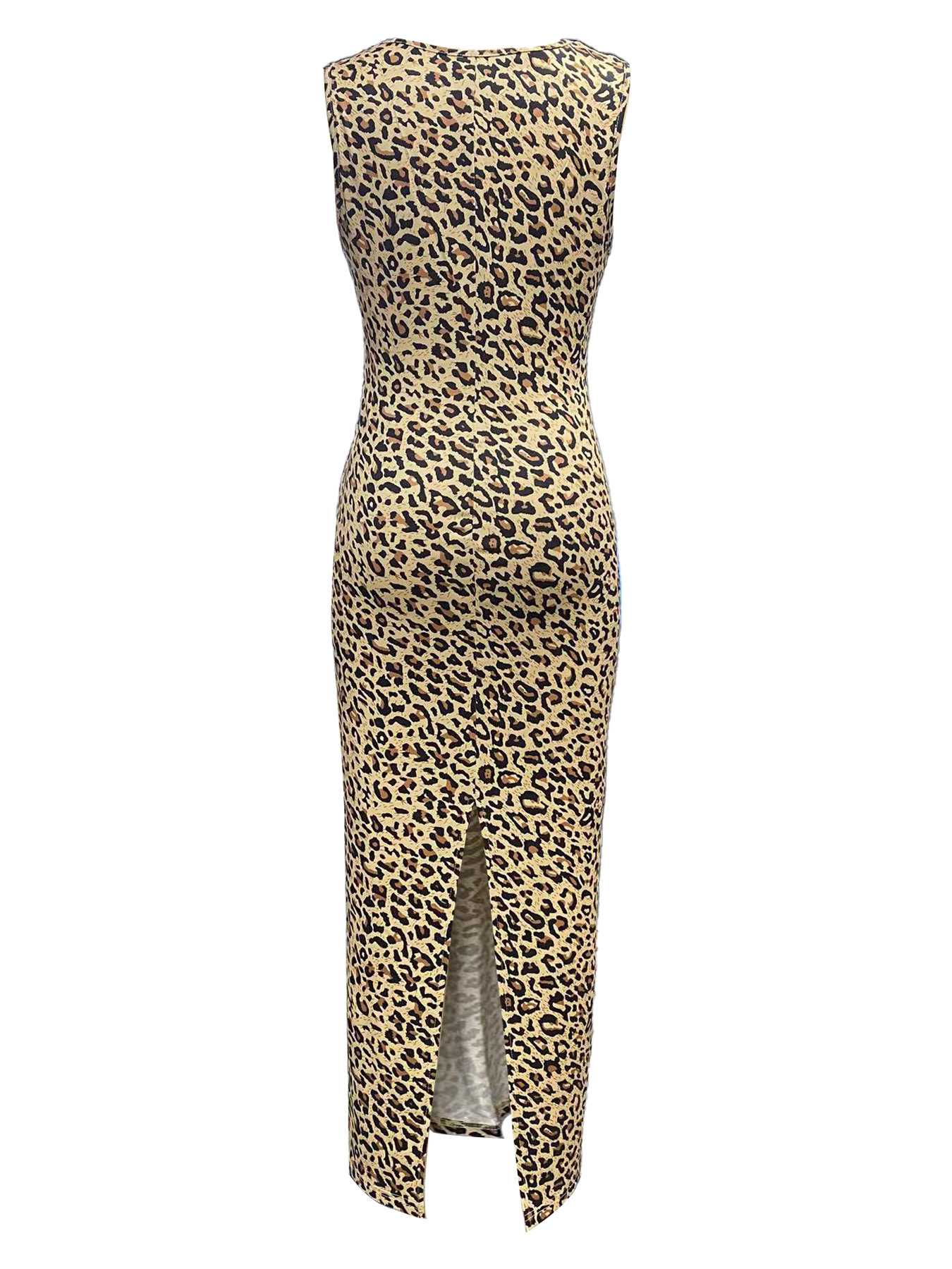 Long-sleeve Crew-neck Fashionable Leopard-print Knitted Sleeveless Bodycon Dress
