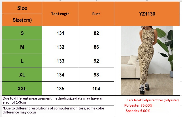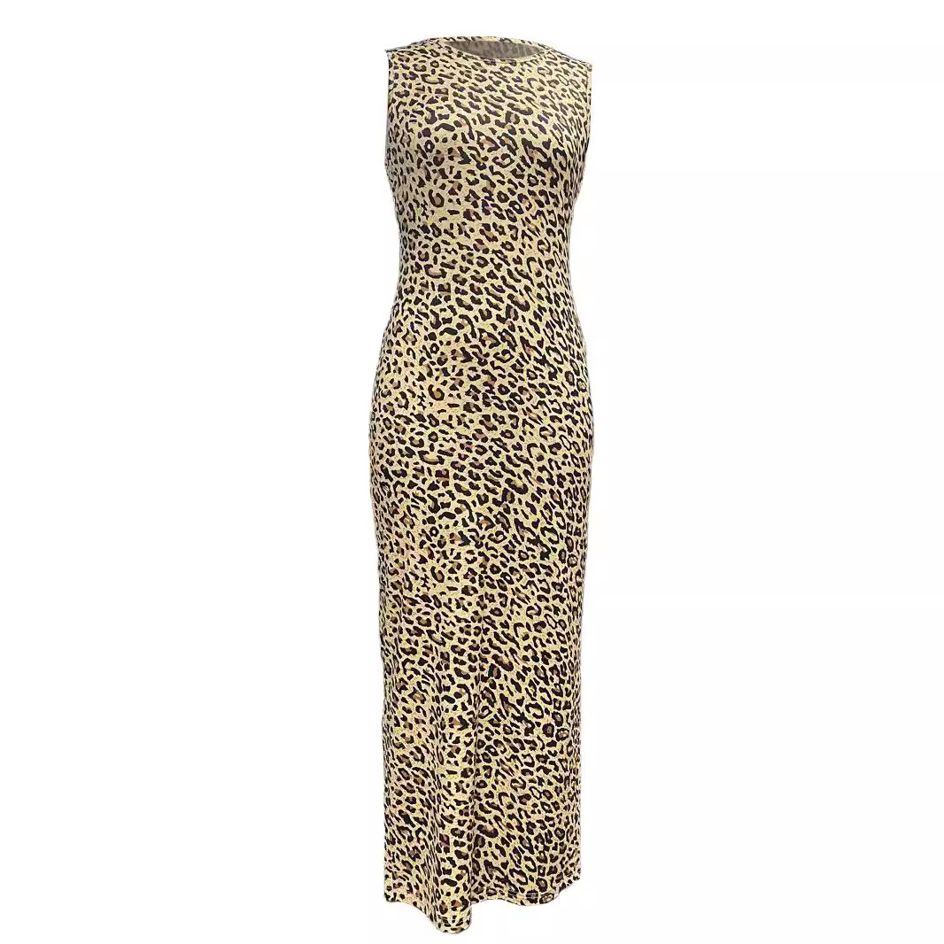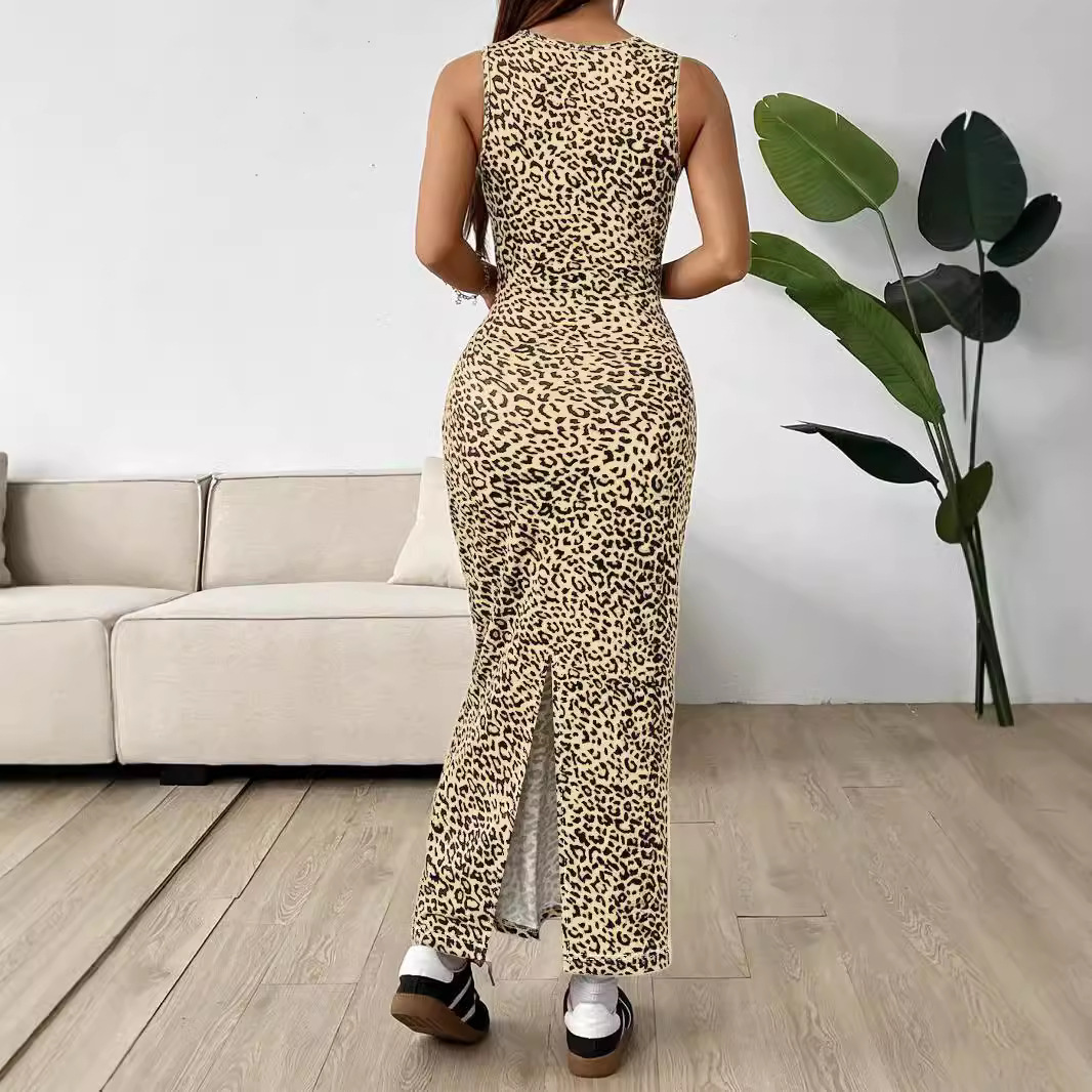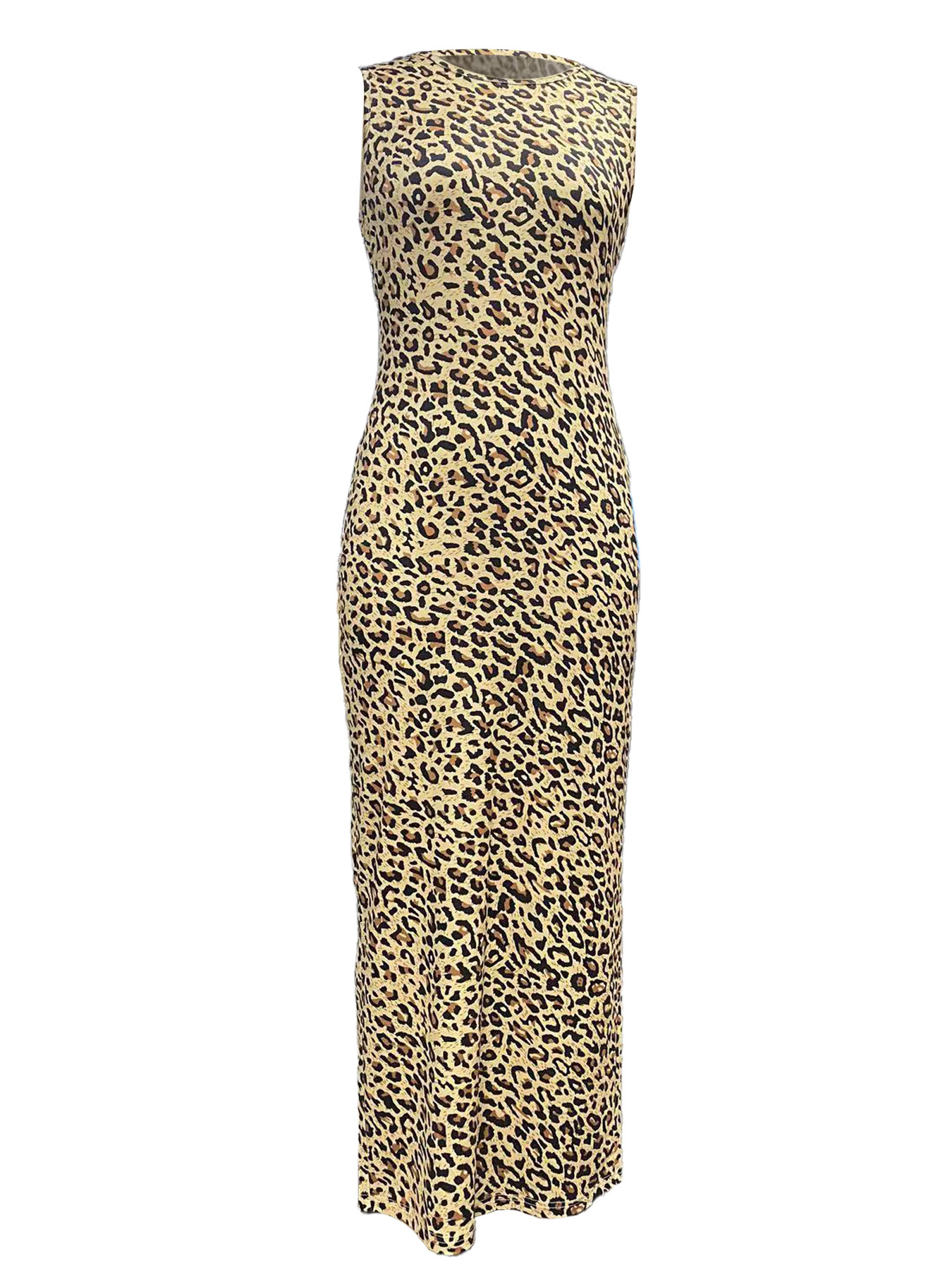 Long-sleeve Crew-neck Fashionable Leopard-print Knitted Sleeveless Bodycon Dress