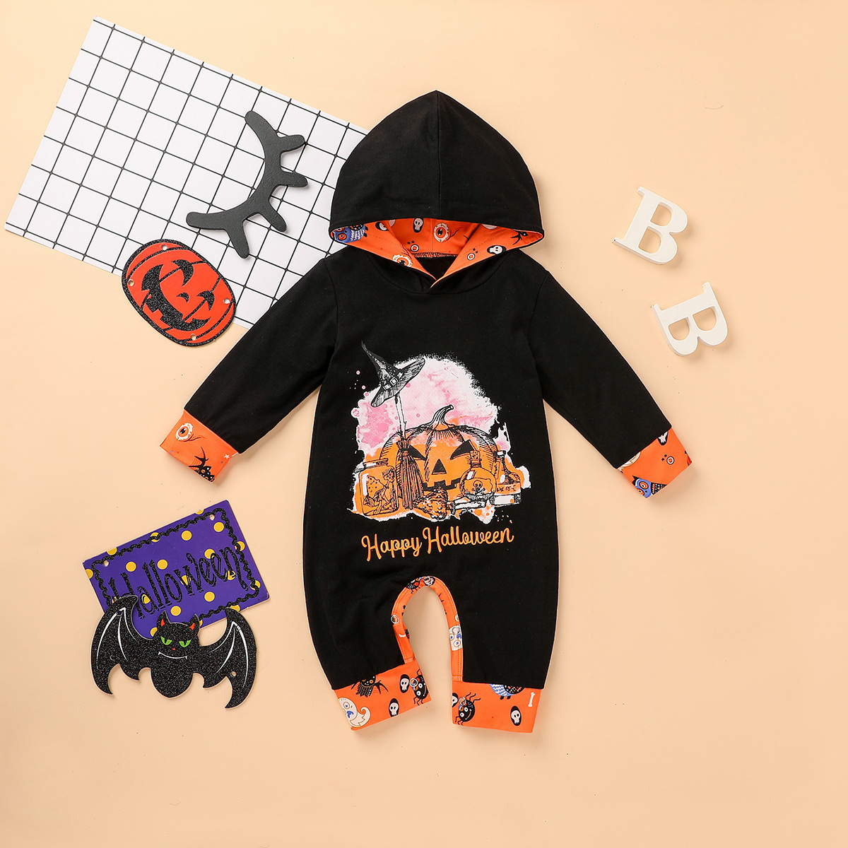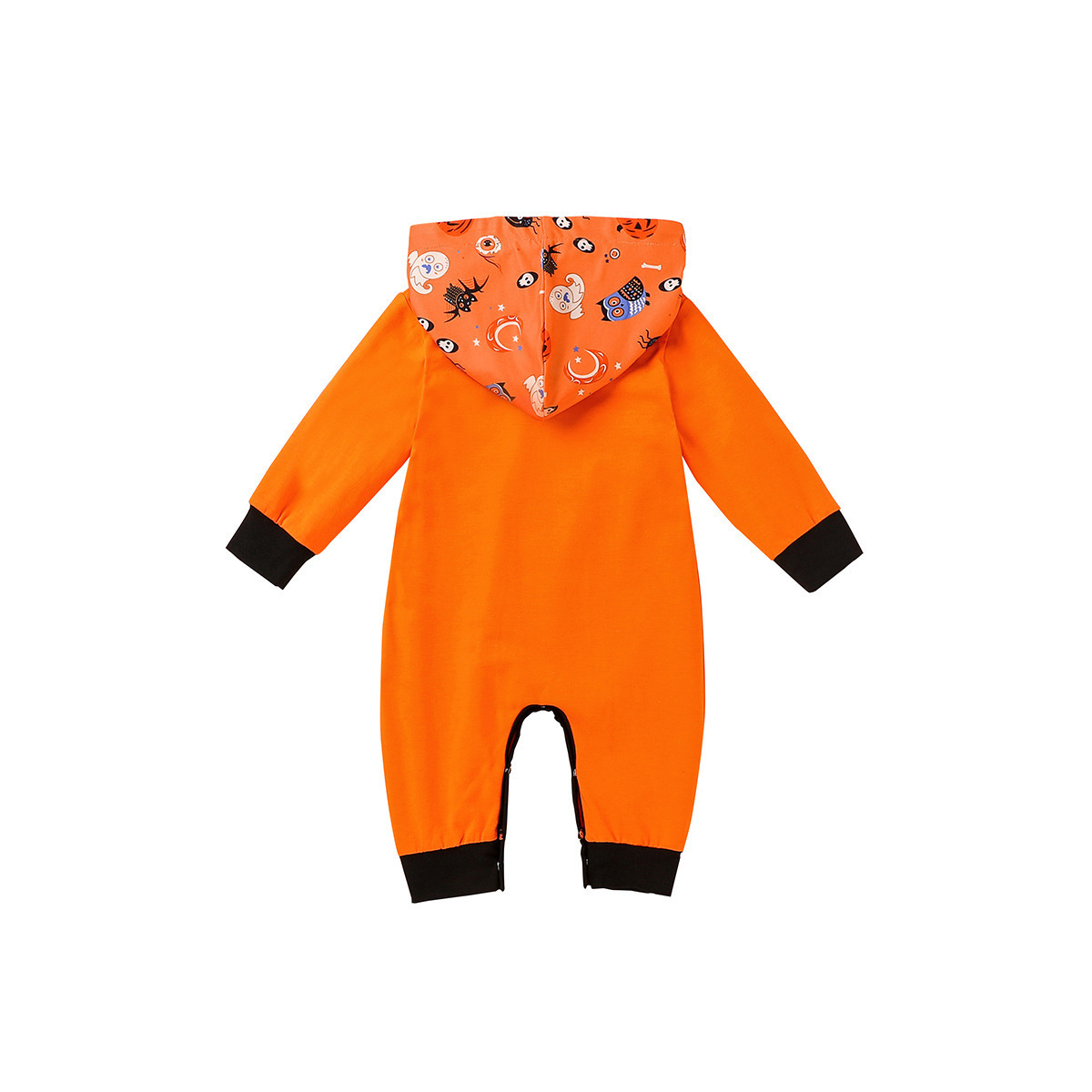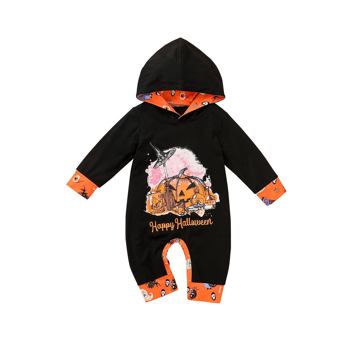 Color: YX531M Long Sleeve Black Pumpkin Hooded Romper, YX532M Yellow Ghost Hooded Romper, YX533M Black Letter Hooded Romper, YX534M Brown Firebird Flared Romper
