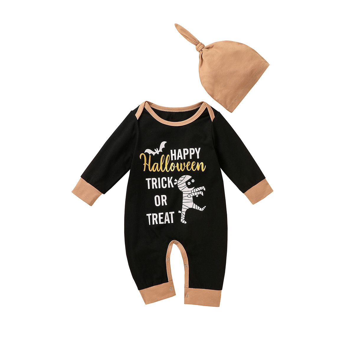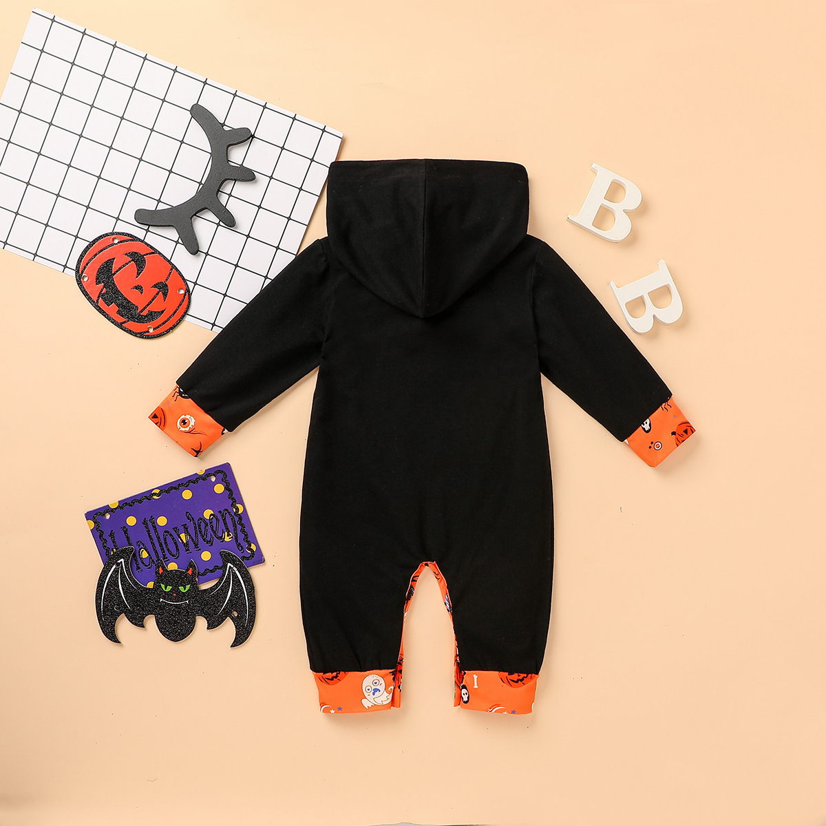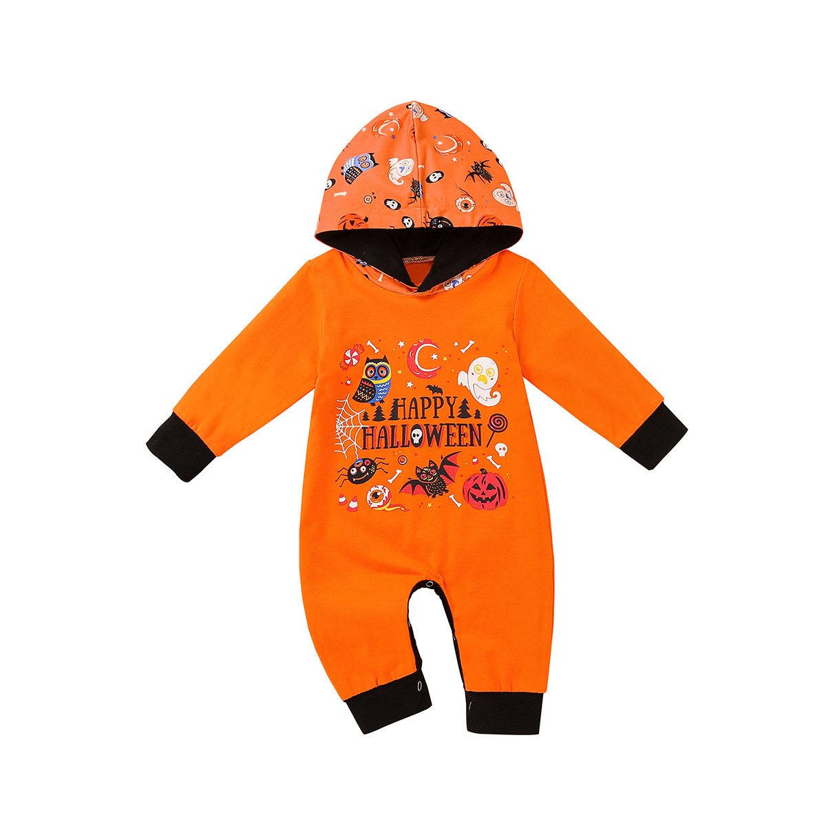 Color: YX531M Long Sleeve Black Pumpkin Hooded Romper, YX532M Yellow Ghost Hooded Romper, YX533M Black Letter Hooded Romper, YX534M Brown Firebird Flared Romper