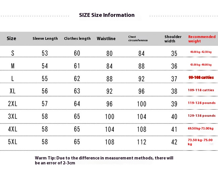 Size: S [recommend 40.0 kg-42.50kg],M [recommend 43.00 kg-48.00kg],L [recommend 48.50 kg-53.00kg],XL [recommend 53.50 kg-58.00kg],2XL [recommend 58.50 kg-63.00kg],3XL [recommend 63.50 kg-68.00kg]],4XL [recommend 68.50 kg-72.50kg],5XL [recommend 73.00 kg-75.00kg]]