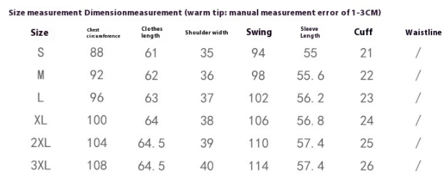 1. Asian sizes are 1 to 2 sizes smaller than European and American people. Choose the larger size if your size between two sizes. Please allow 2-3cm differences due to manual measurement. 2. Please check the size chart carefully before you buy the item, if you don't know how to choose size, please contact our customer service. 3.As you know, the different computers display colors differently, the color of the actual item may vary slightly from the following images.