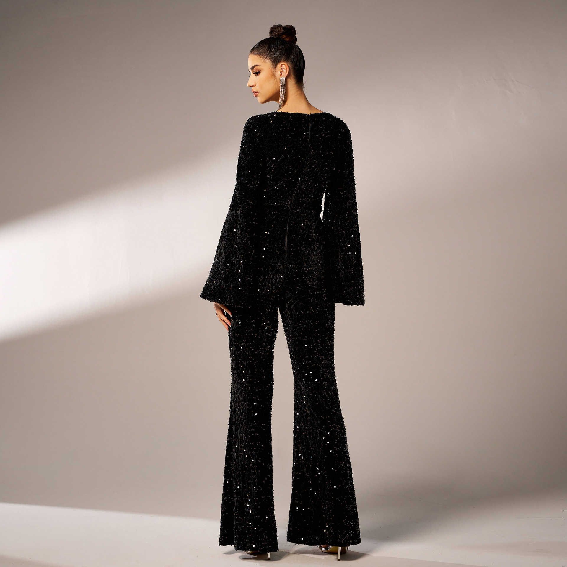 Long Sleeve Square-neck Slim-fit Sheath Banquet Sequined Jumpsuit