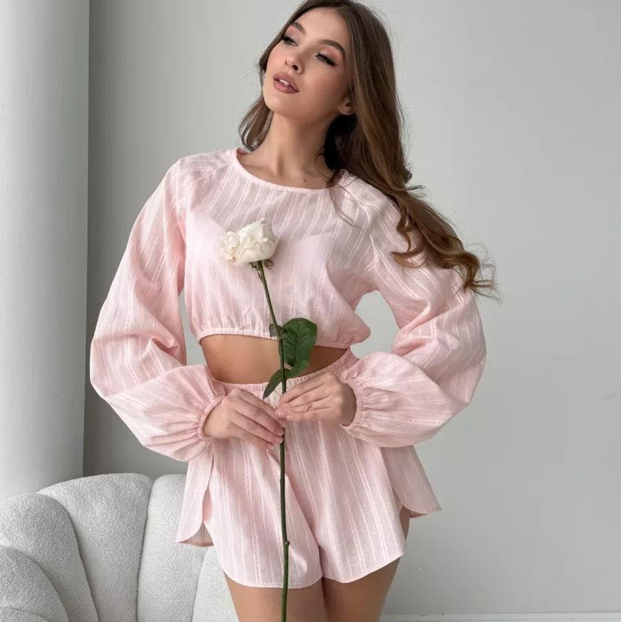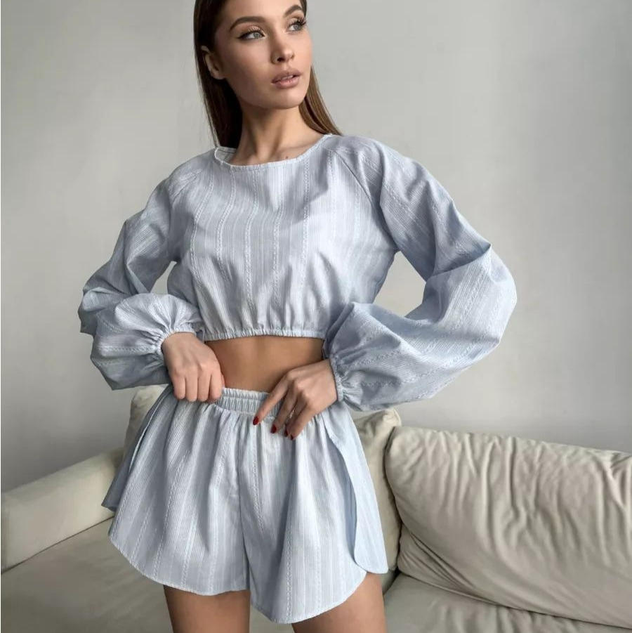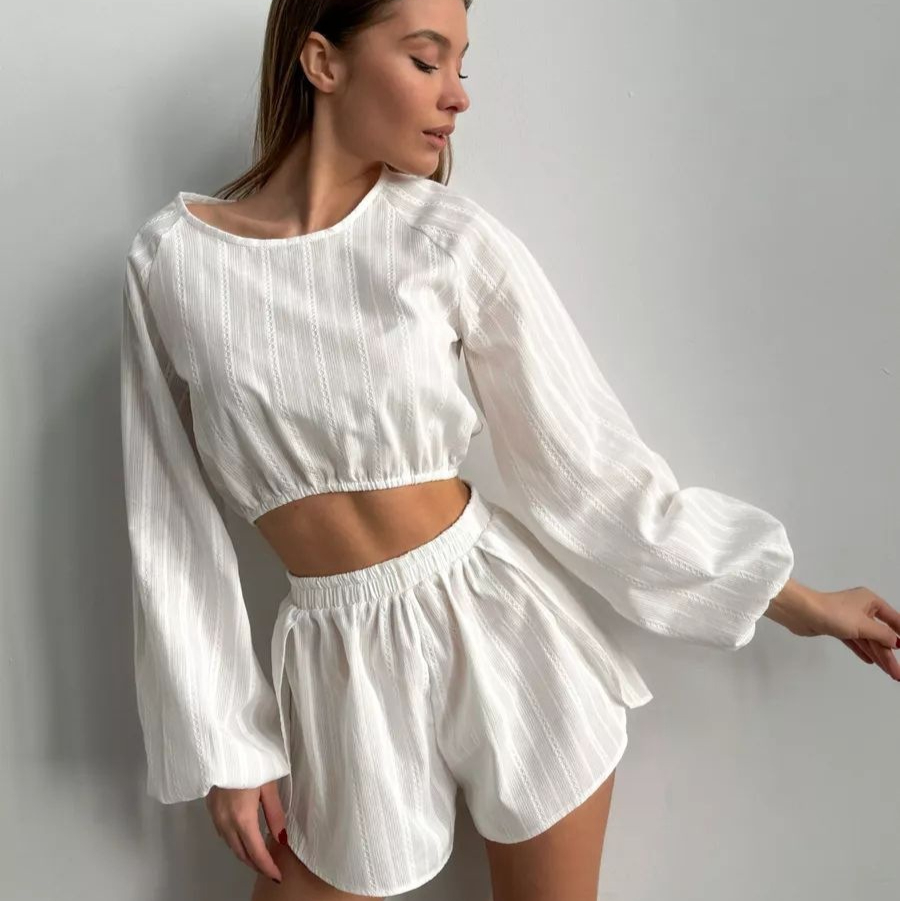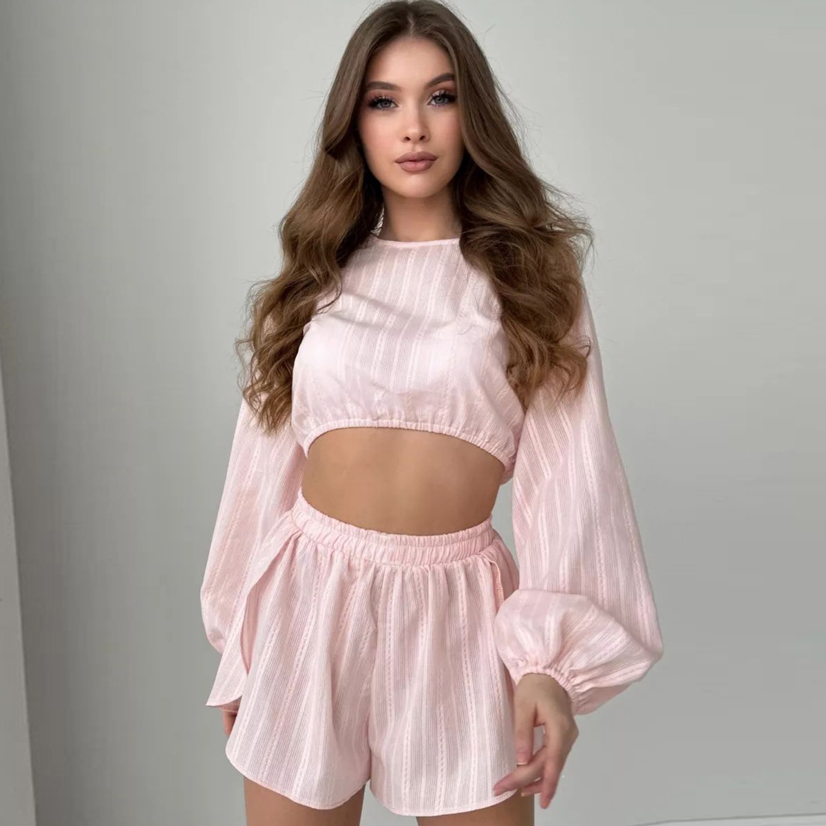 Long-sleeved Top With Slit Shorts Casual Wearable Set For Women