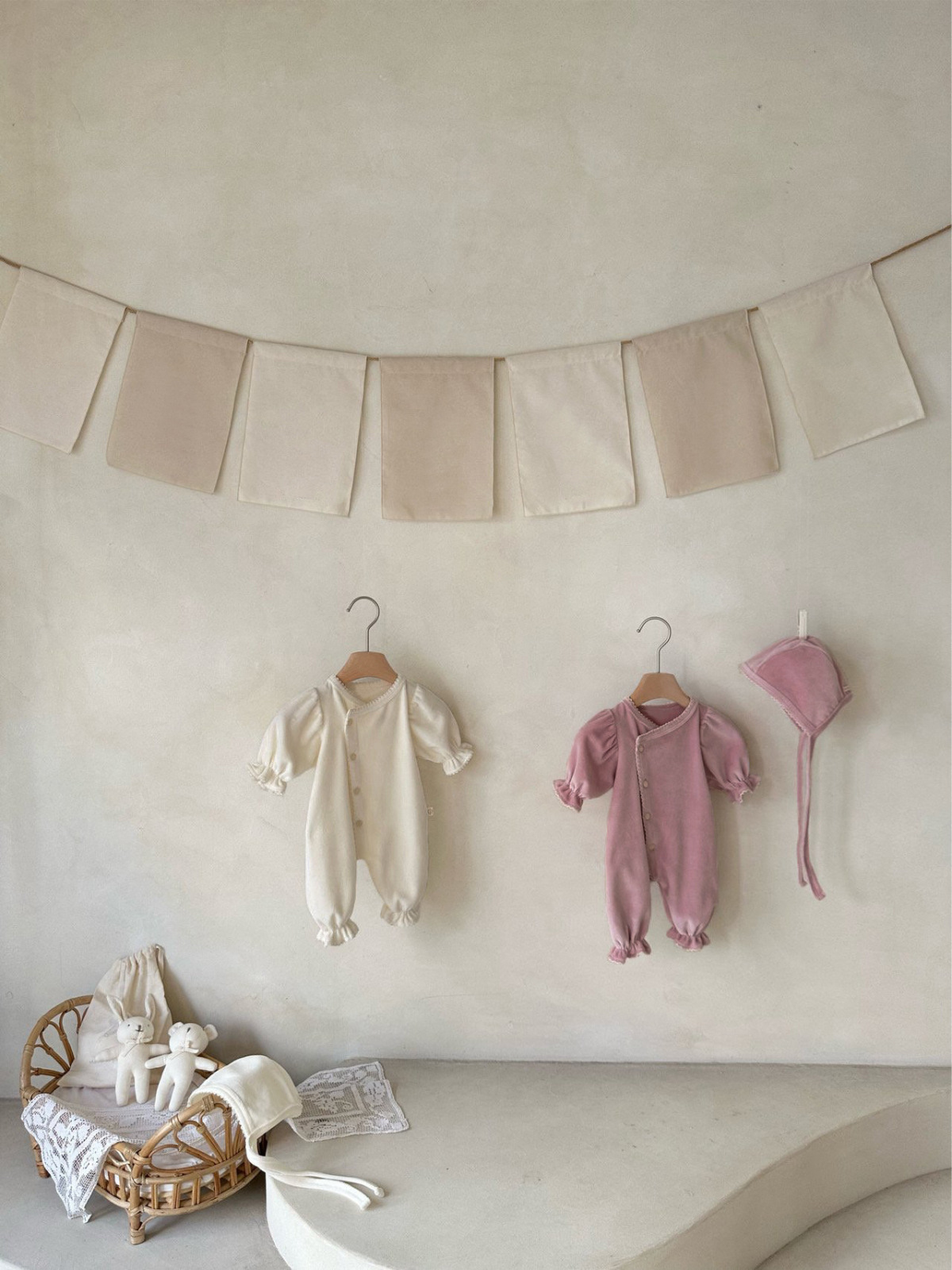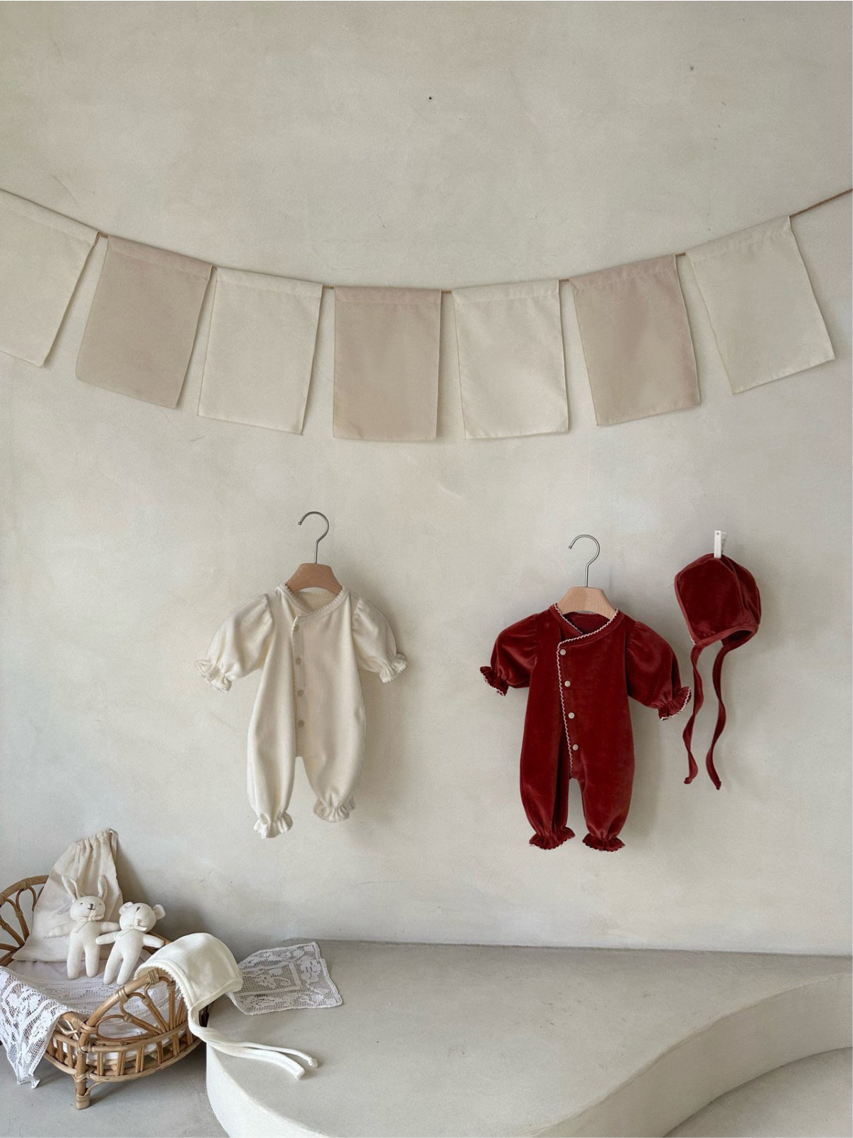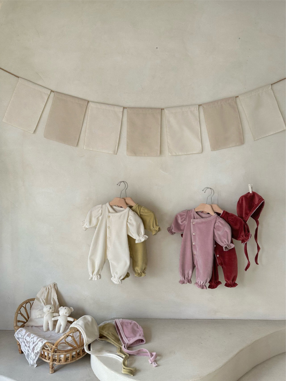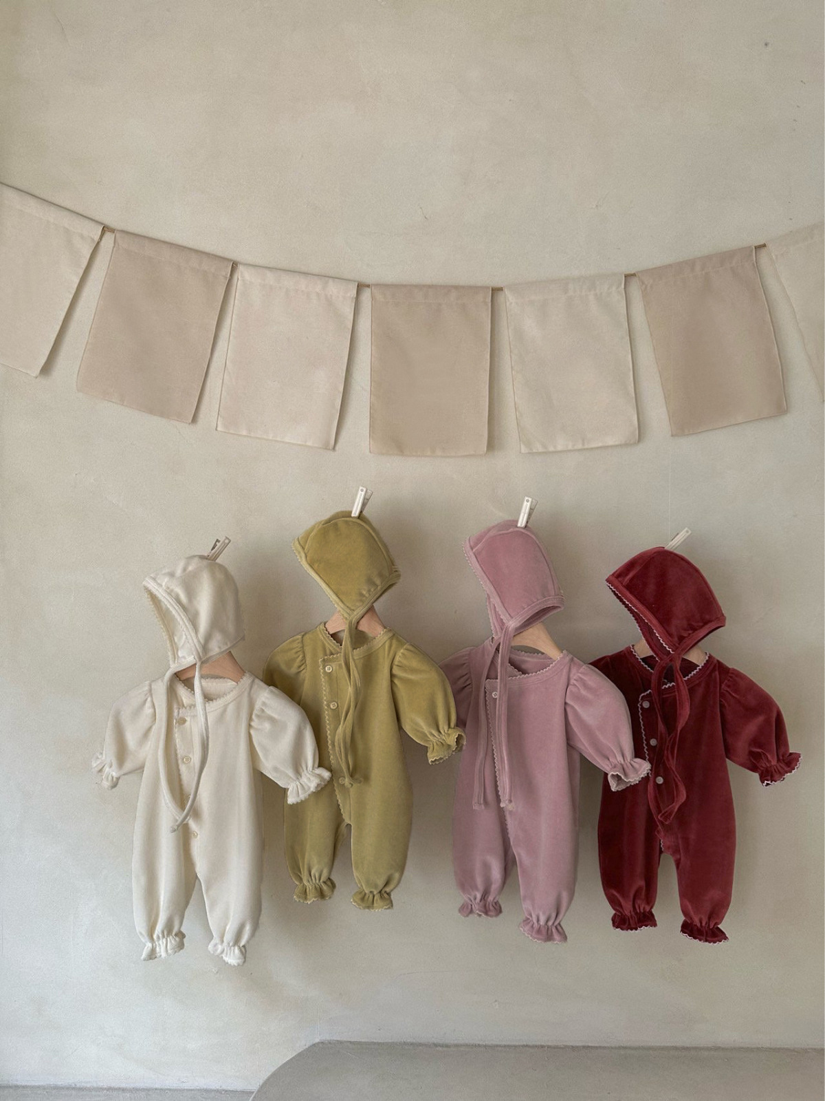 Colors: Cream bodysuit, deep pink bodysuit, mustard yellow bodysuit, wine red bodysuit; cream set (bodysuit + hat), deep pink set (bodysuit + hat), mustard yellow set (bodysuit + hat), wine red set (bodysuit + hat)