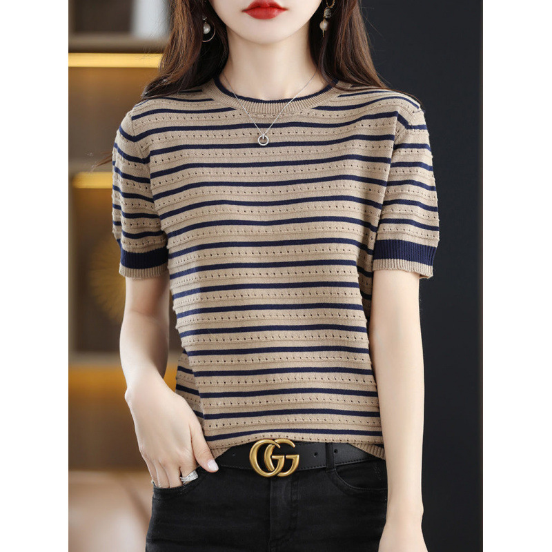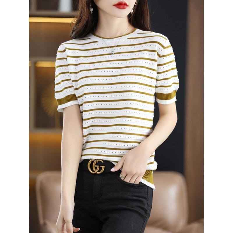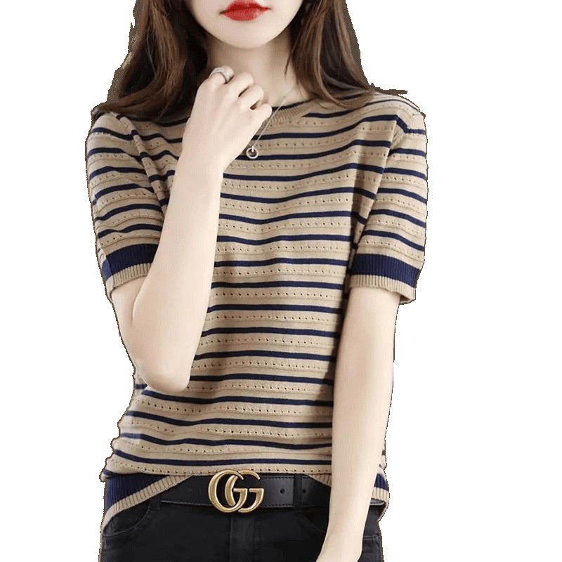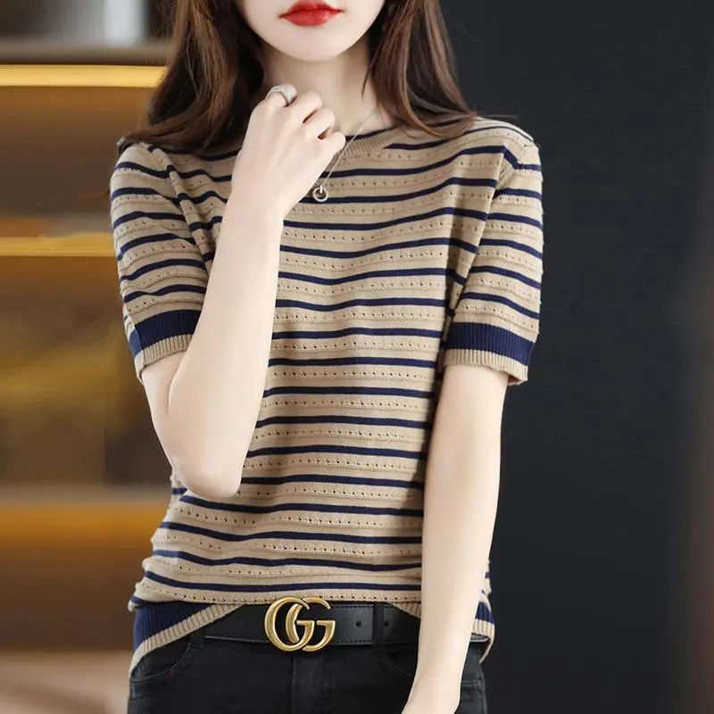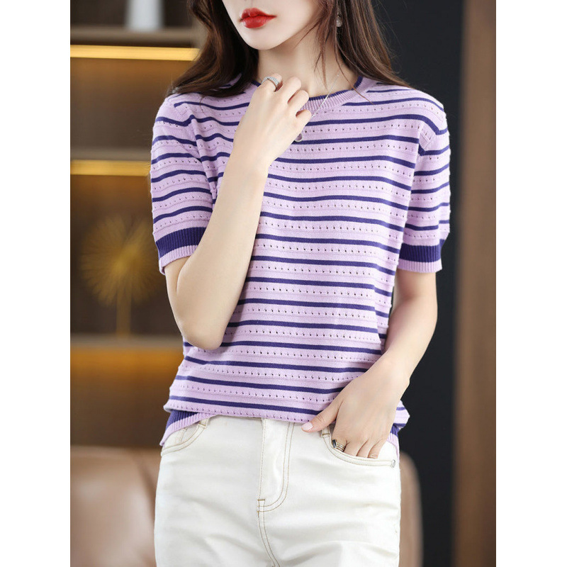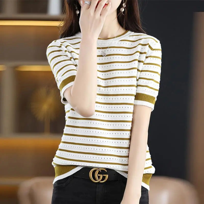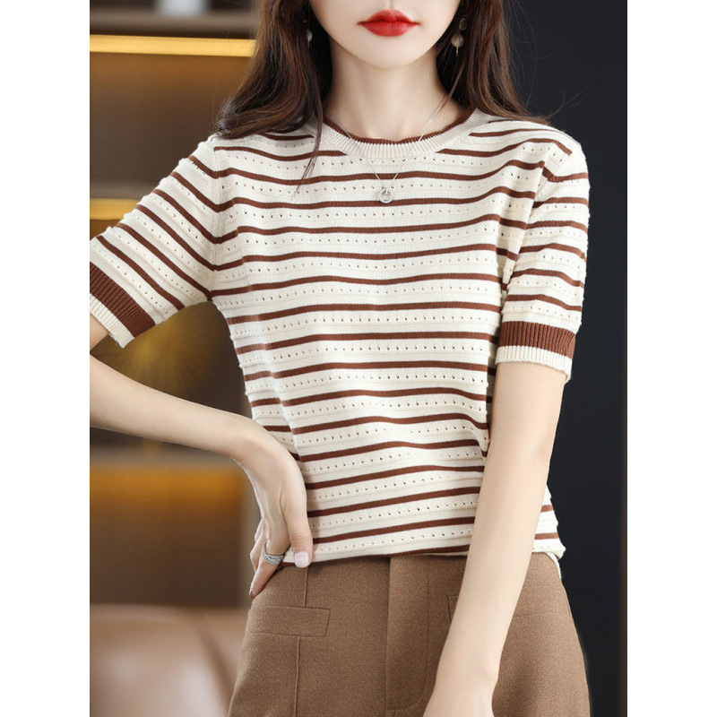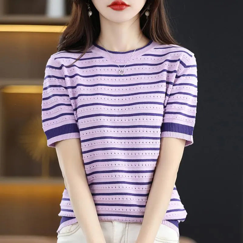 Loose Color Matching Striped Hollow Knitted Shirt