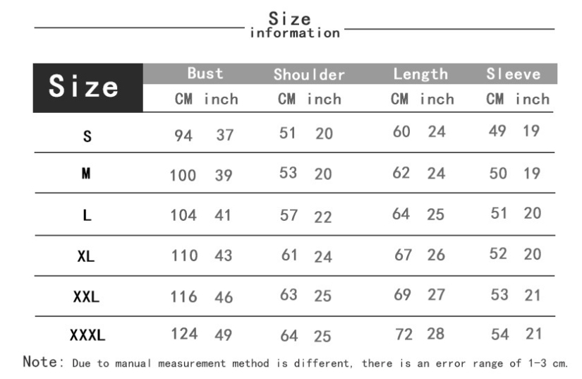 1. Asian sizes are 1 to 2 sizes smaller than European and American people. Choose the larger size if your size between two sizes. Please allow 2-3cm differences due to manual measurement. 2. Please check the size chart carefully before you buy the item, if you don't know how to choose size, please contact our customer service. 3.As you know, the different computers display colors differently, the color of the actual item may vary slightly from the following images.