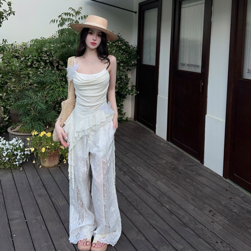 Loose-fit American-style White Draped Thin Casual Wide-leg Pants For Petite Women