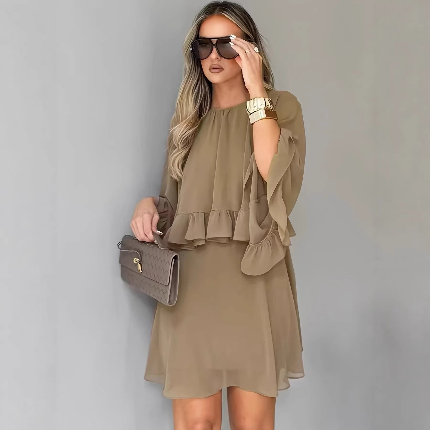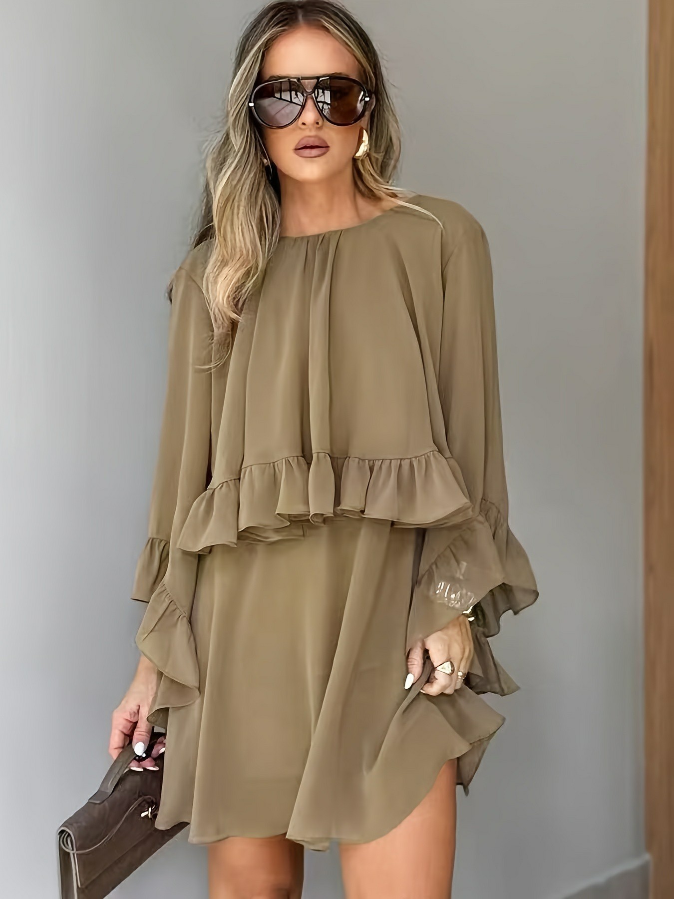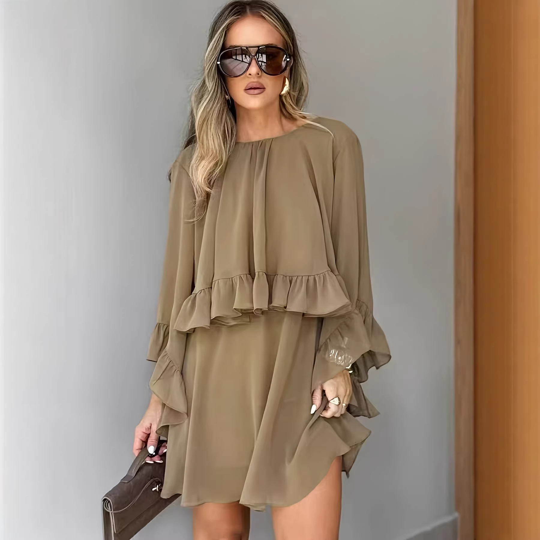 Loose-fit Ruffled-hem Round-neck Long-sleeve Chiffon A-line Dress