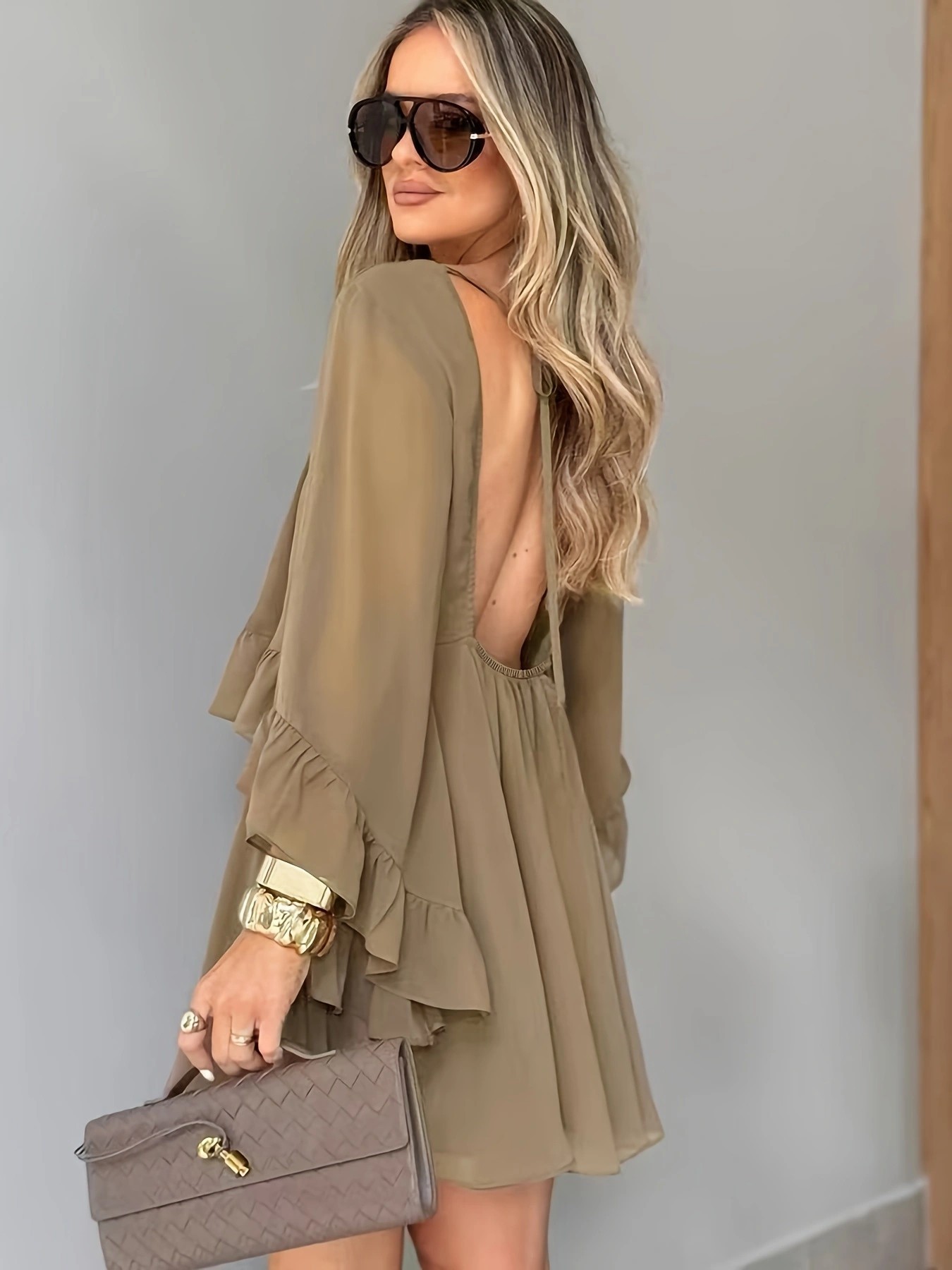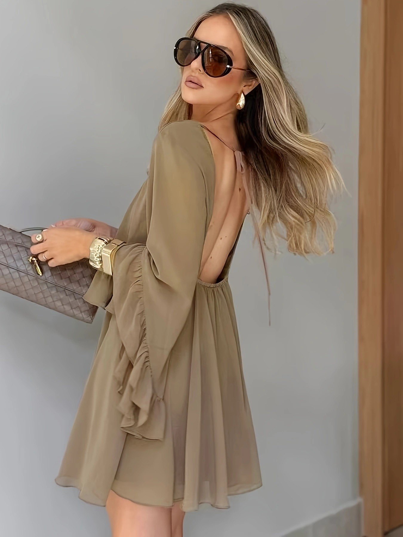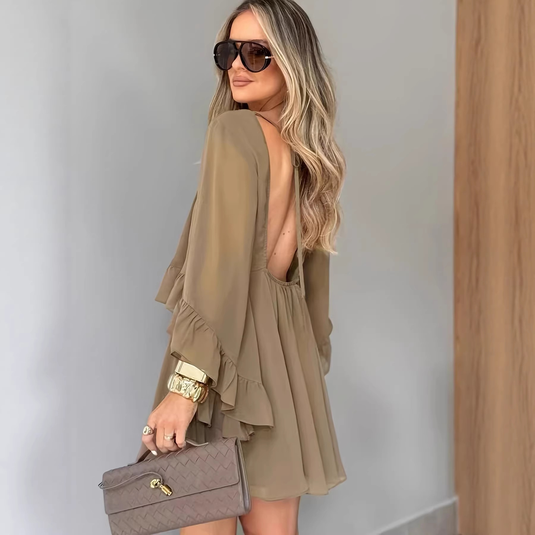 Loose-fit Ruffled-hem Round-neck Long-sleeve Chiffon A-line Dress