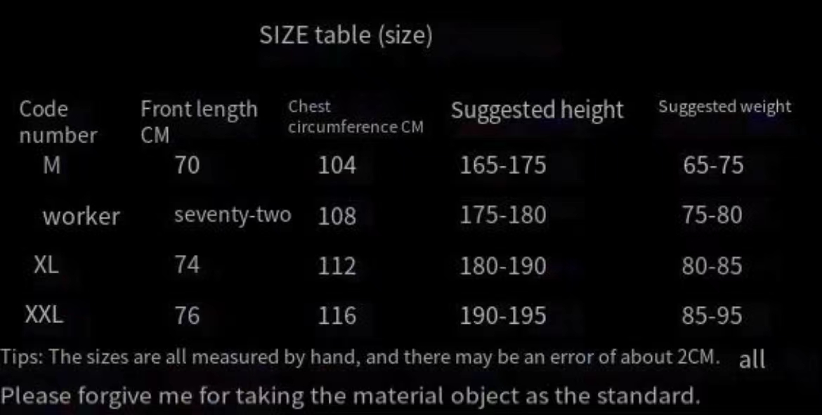 1. Asian sizes are 1 to 2 sizes smaller than European and American people. Choose the larger size if your size between two sizes. Please allow 2-3cm differences due to manual measurement.