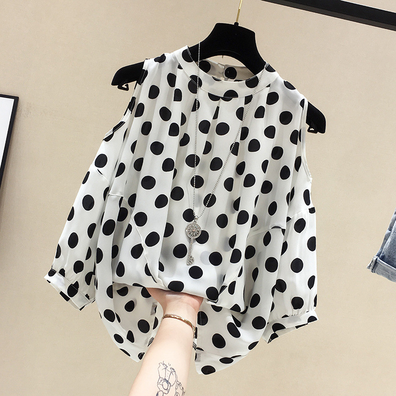 Loose-fitting Figure-flattering Polka-dot Off-shoulder Short-sleeve Chiffon Blouse