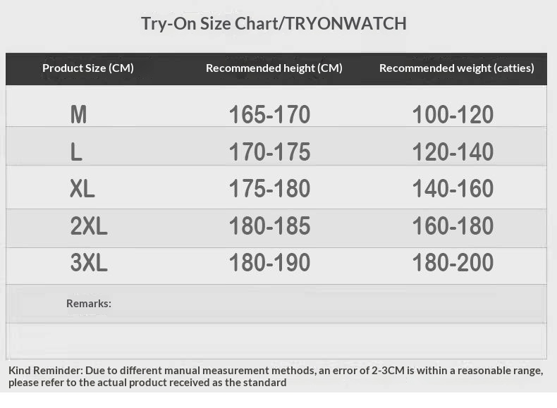 Size: M is suitable for 52.50kg-62.50kg,L is suitable for 62.50kg-72.50kg,XL is suitable for 72.50kg-82.50kg,2XL is suitable for 82.50kg-92.50kg,3XL is suitable for 92.50kg-105.00kg