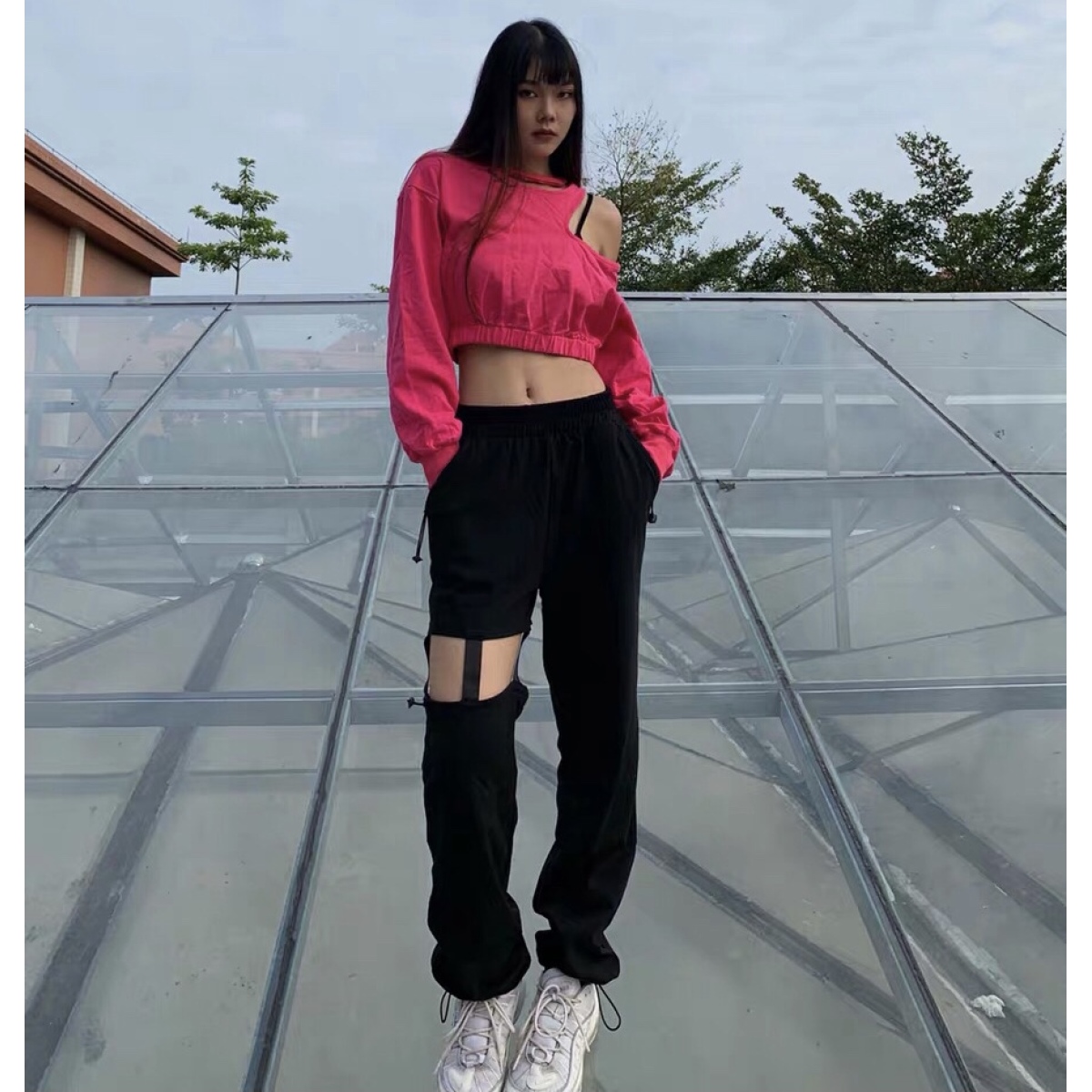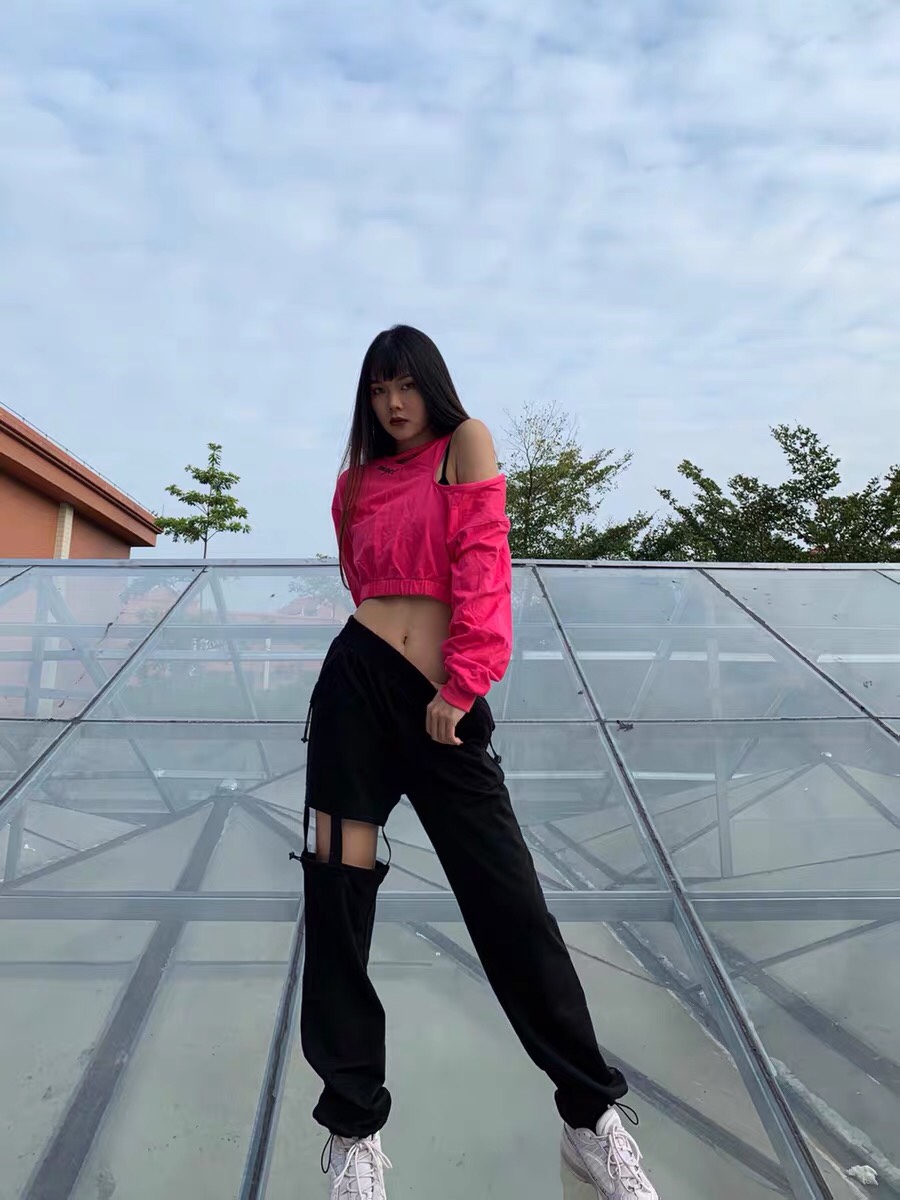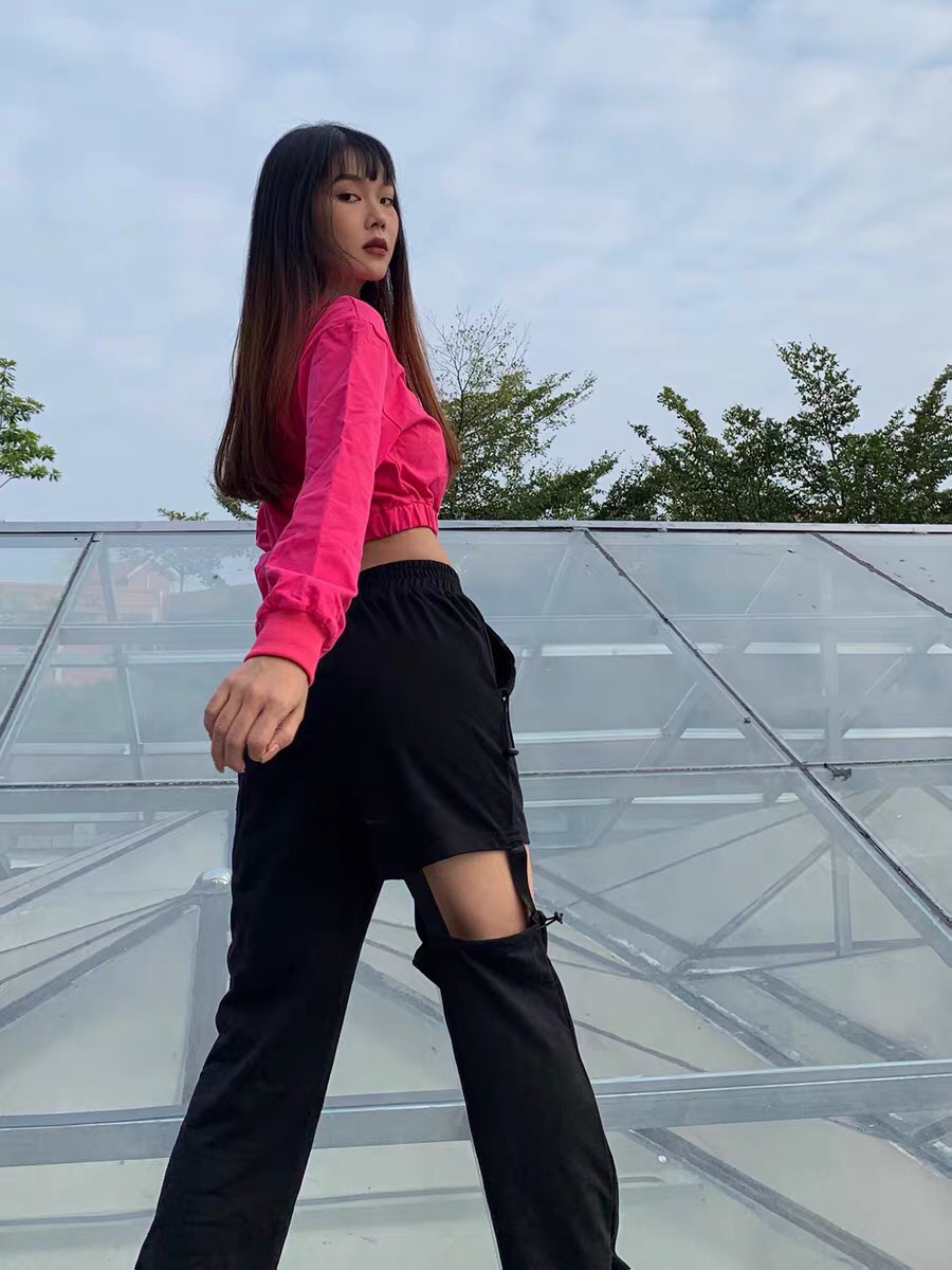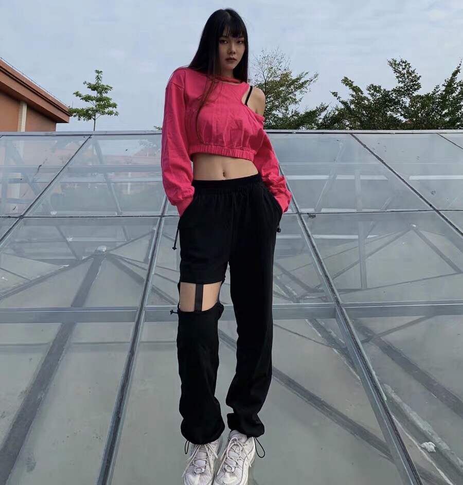 Color classification: Rose red sweater, black trousers